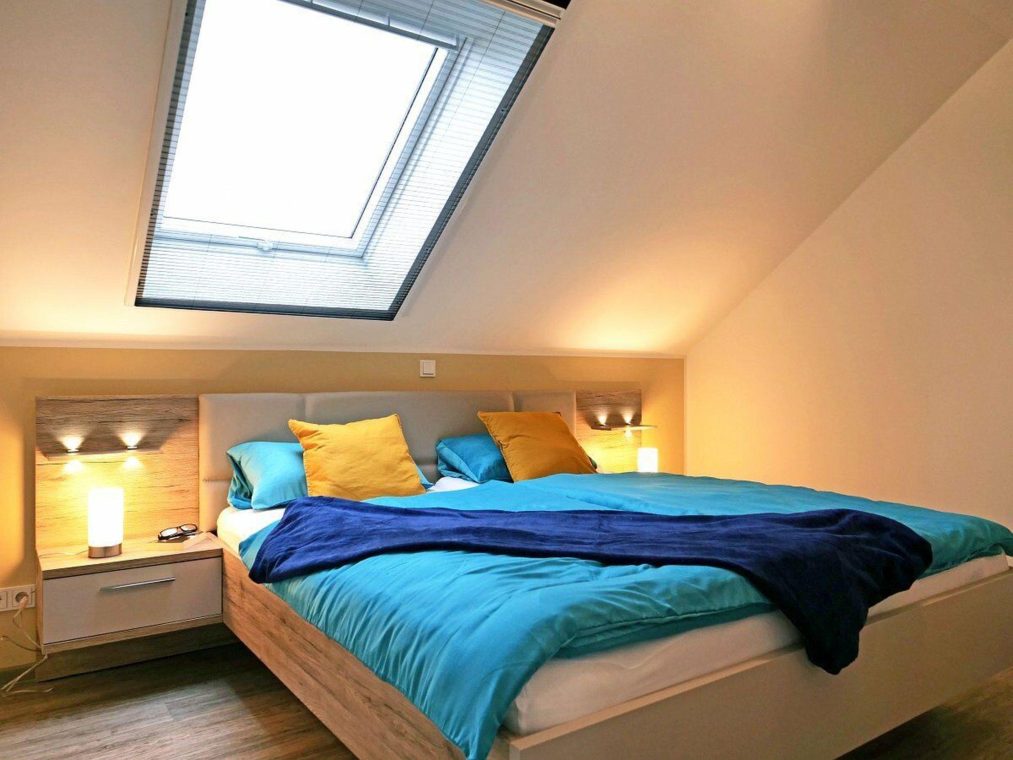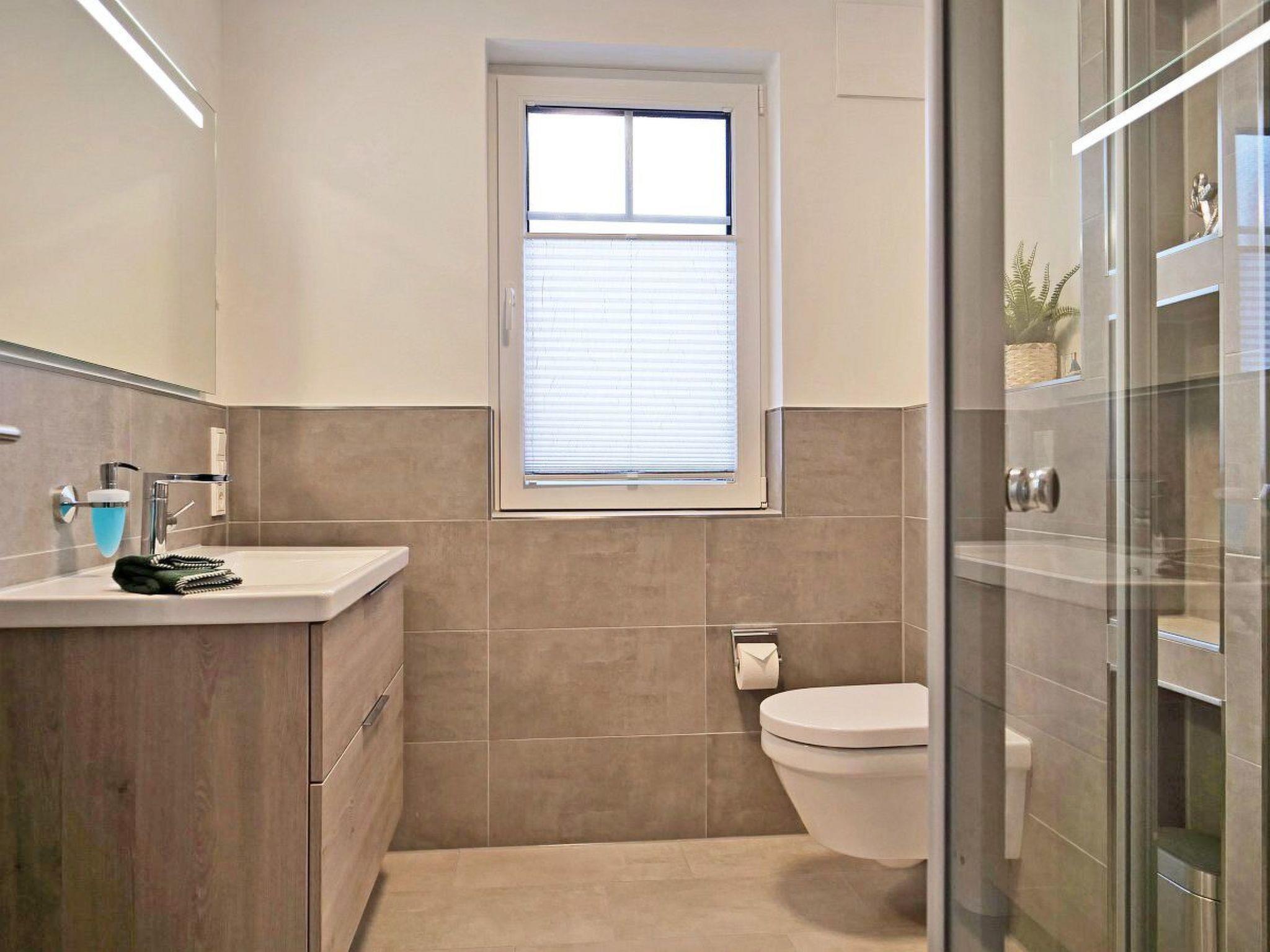 Also on the upper floor you will find a daylight-bright wellness bathroom with sauna, whirlpool, rain shower, WC and double washbasin as well as high-quality bathroom furniture. A second bathroom with daylight and a rain shower is located on the ground floor.