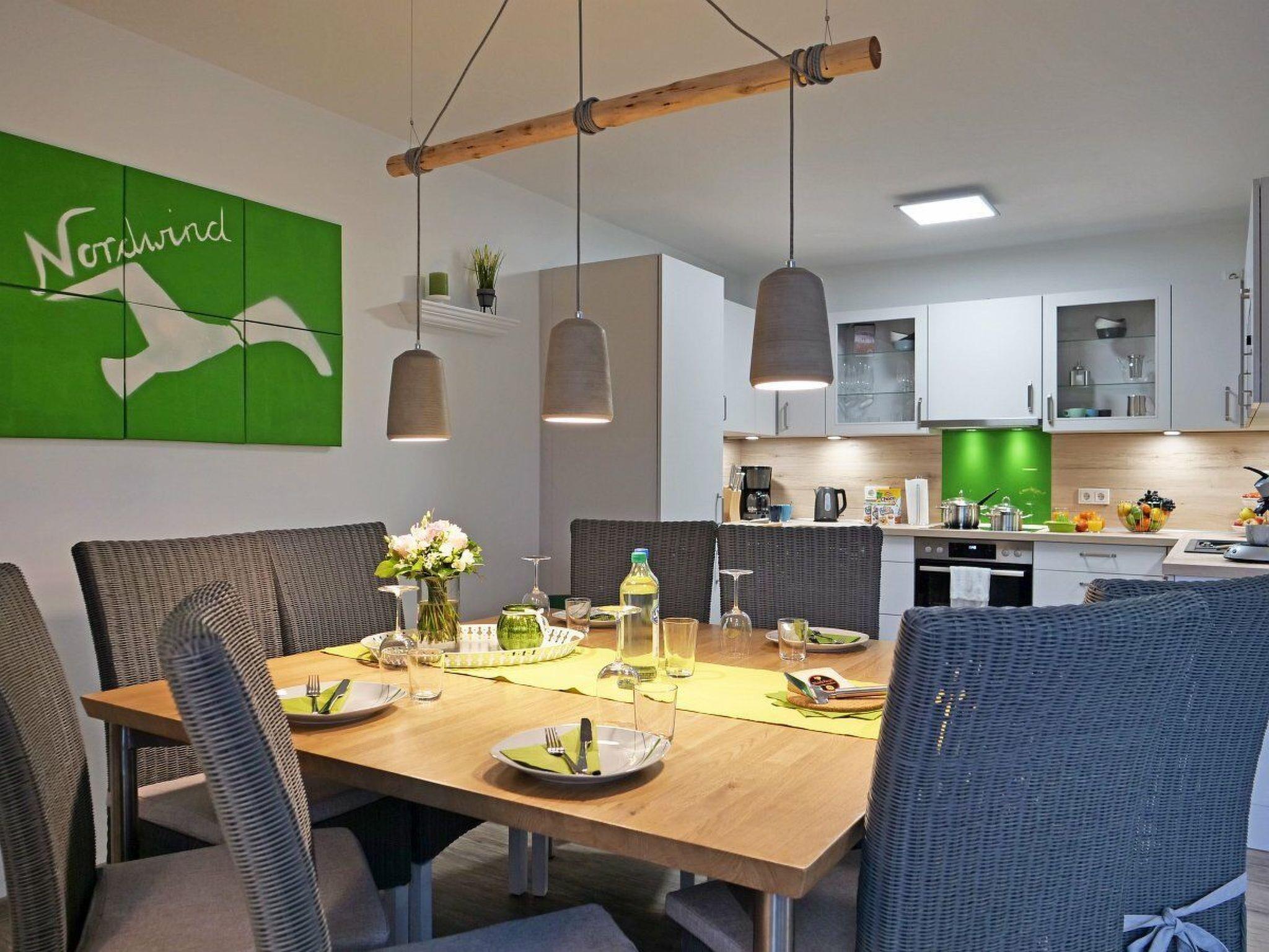 The house "Nordwind" has been furnished to a high standard in country house style and has exclusive furnishings with a large wellness bathroom with sauna and whirlpool (approx. 17 m²), terrace, balcony on the upper floor, wood-burning stove, underfloor heating and insect screens.