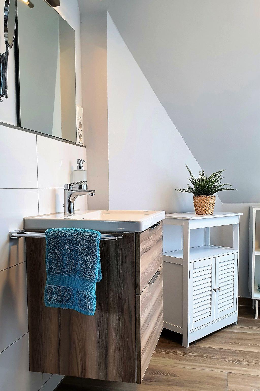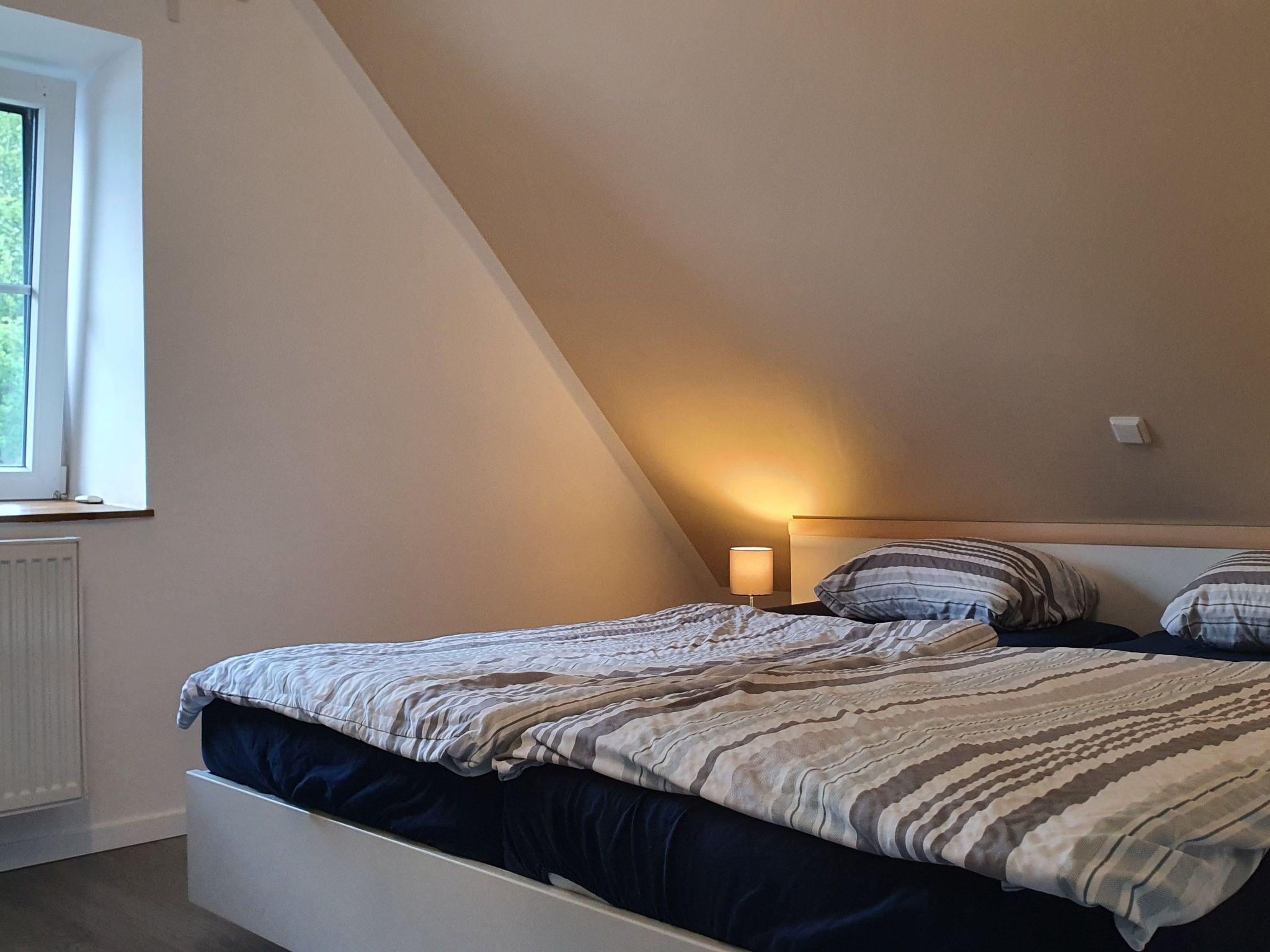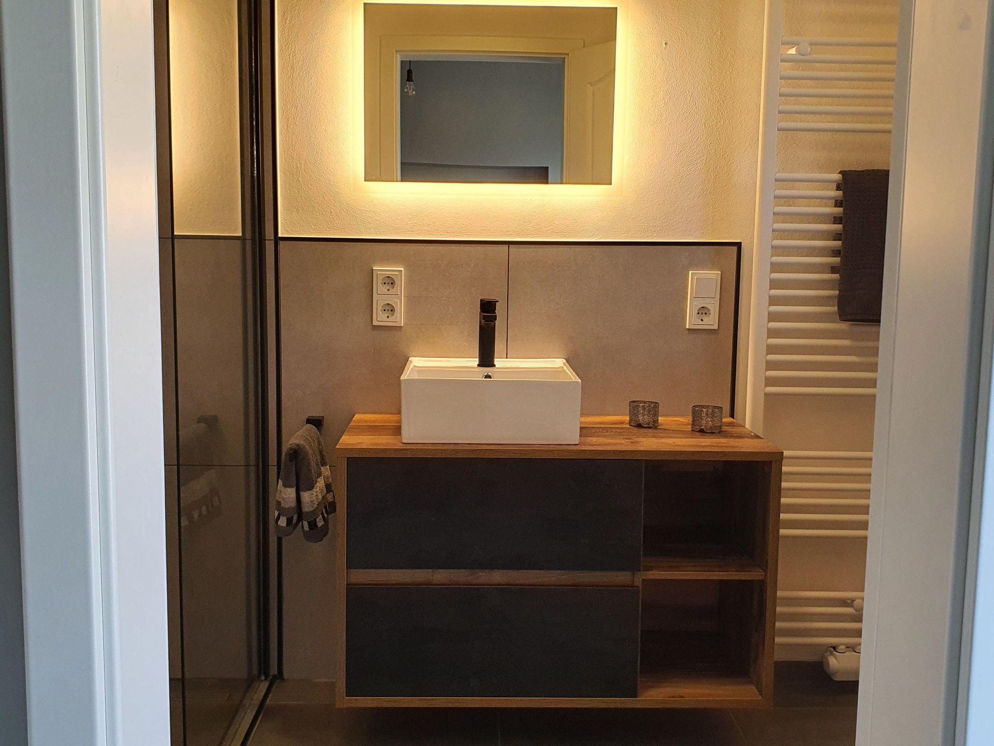 The "Galeriewohnung" is characterised by its modern furnishings and spacious layout over 110 m² and three floors. On the ground floor, you are greeted by an inviting entrance area with a stylish industrial-look shower room. A staircase takes you to the first of the light-flooded living floors, which has two double bedrooms and another shower room. The living floor has a spacious eat-in kitchen with a dining table for six people and a cosy living area with an electrically extendable sofa, a 65" TV and a wood-burning stove for cosy hours. There is additional sleeping accommodation on the gallery, which is accessible via another staircase.