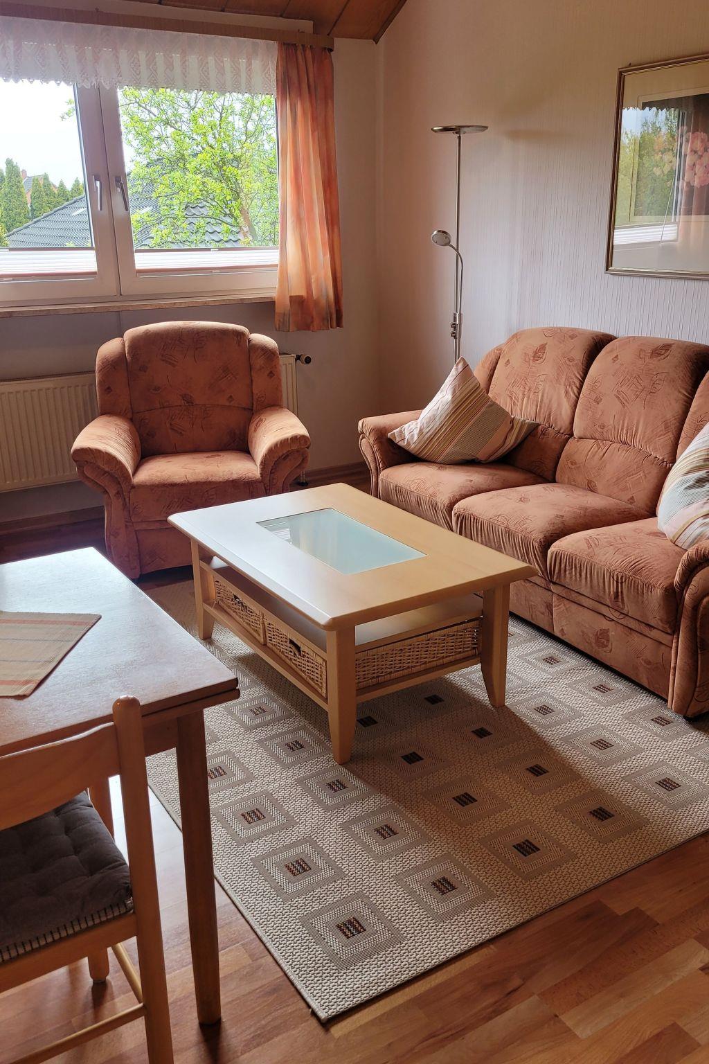 The 42 m² flat is designed for two people and offers you all the amenities you need for a pleasant stay. It is located on the upper floor of the house. The ground floor is occupied by the landlord. The holiday flat has a fully equipped kitchen with cooker, oven, coffee machine, kettle and dining area. In the living area there is a flat-screen TV, a cosy three-seater sofa and a TV armchair. The adjoining bedroom has a double bed two metres wide. The bathroom is equipped with a shower cubicle, WC and washbasin with mirror. The towels are changed weekly.