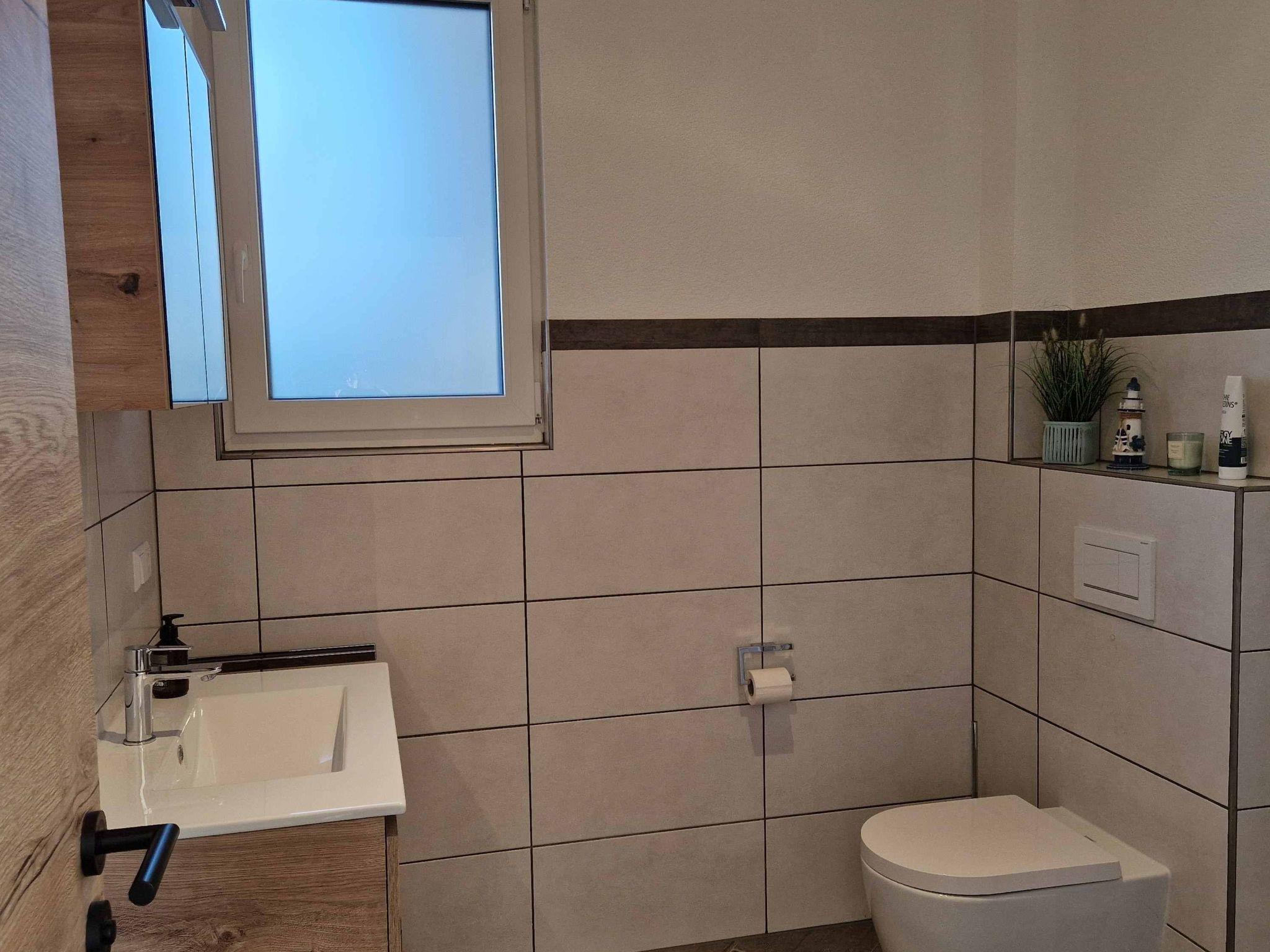 The house is located in the holiday village Eckwarderhörne in the immediate vicinity of the dyke, the ferry dock (including passenger/bike ferry to Wilhelmshaven) and a 50,000 m2 inland lake belonging to the holiday village (with an approx. 500 m2 sandy lawn directly on the inland lake, swimming pontoon and jetties). The Eckwarderhörne lido with its beach hall, lighthouse, ferry landing stage and starting point for guided mudflat walks is around 800 metres away. In the idyllic holiday village, away from the traffic, there is the "To'n Spieker" dyke inn, bicycle hire, children's playground and a 1000 m2 play area with beach volleyball court, badminton court, basketball hoop, outdoor table tennis table, sandpit and swings.