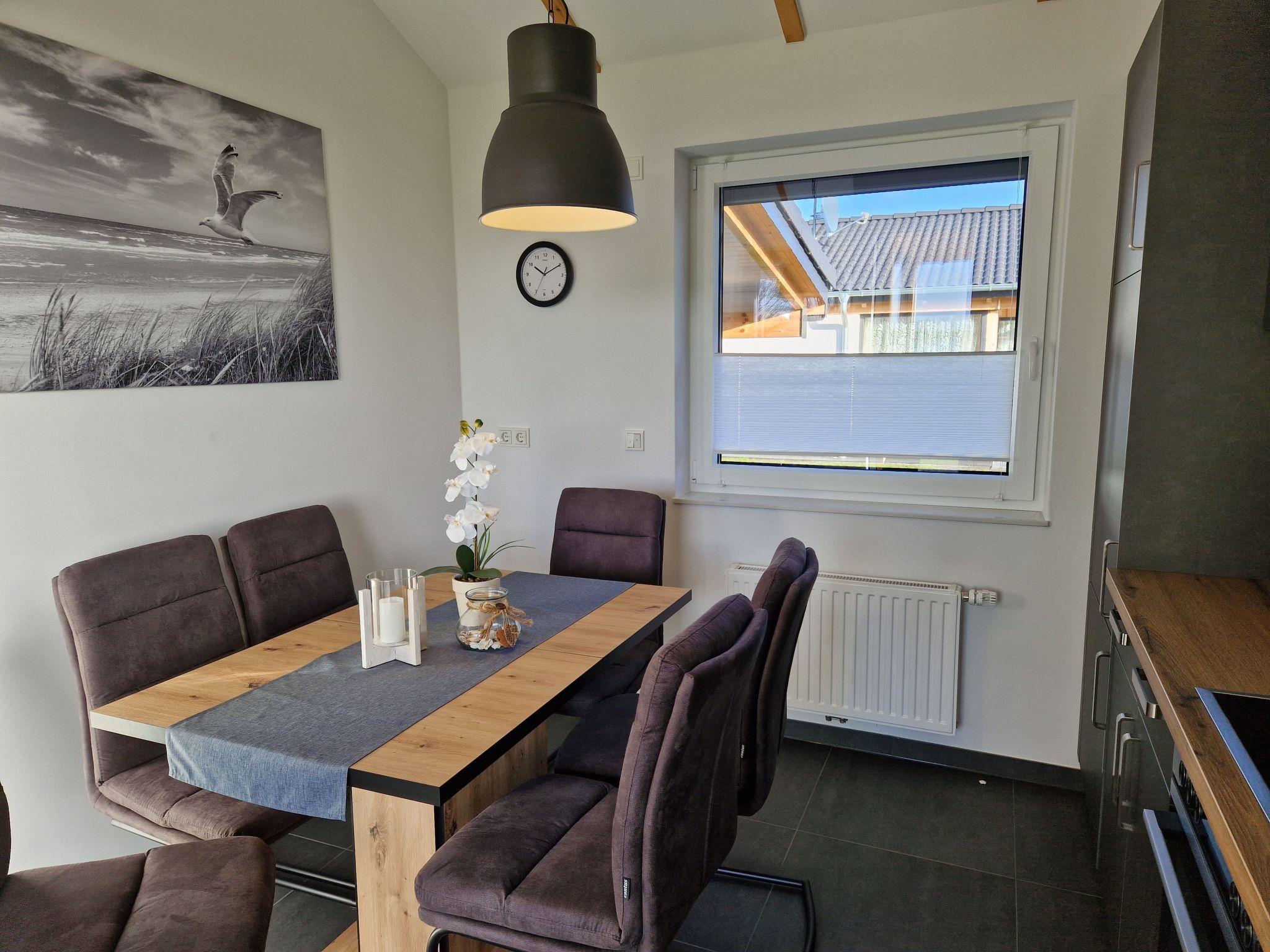 New build completed 2022! Detached, single-storey bungalow for 5 people, own 499 square metre plot, fenced, peripheral location with unobstructed view towards the meadow, WLAN, 2 bedrooms: 1 bedroom with double bed 1.80 x 2.00 m, 1 bedroom with 1x double bed 1.80 x 2.00 m + 1x bunk bed 0.90x2.00 m (accessible via a small staircase), bathroom with walk-in shower, also wall-mounted towel radiator, large living room with 6.5 m window front down to the floor, covered sun terrace with garden furniture and parasol)-carport and further parking space, fully equipped fitted kitchen. 2 additional TVs in the two bedrooms, free WLAN in the house! The house is located in the holiday village Eckwarderhörne in the immediate vicinity of the dike, the ferry dock (including passenger / bicycle ferry to Wilhelmshaven) and a 50,000 square metre inland lake belonging to the holiday village (with an approx. 500 square metre sandy lawn directly on the inland lake, swimming pontoon and jetties).The Eckwarderhörne lido with its beach hall, lighthouse, ferry landing stage and starting point for guided mudflat walks is about 800 m away. In the idyllic holiday village, away from the traffic, there is the "To'n Spieker" dyke inn, bicycle hire, children's playground and a 1,000 m² play area with beach volleyball court, badminton court, basketball hoop, outdoor table tennis table, sandpit and swings.
