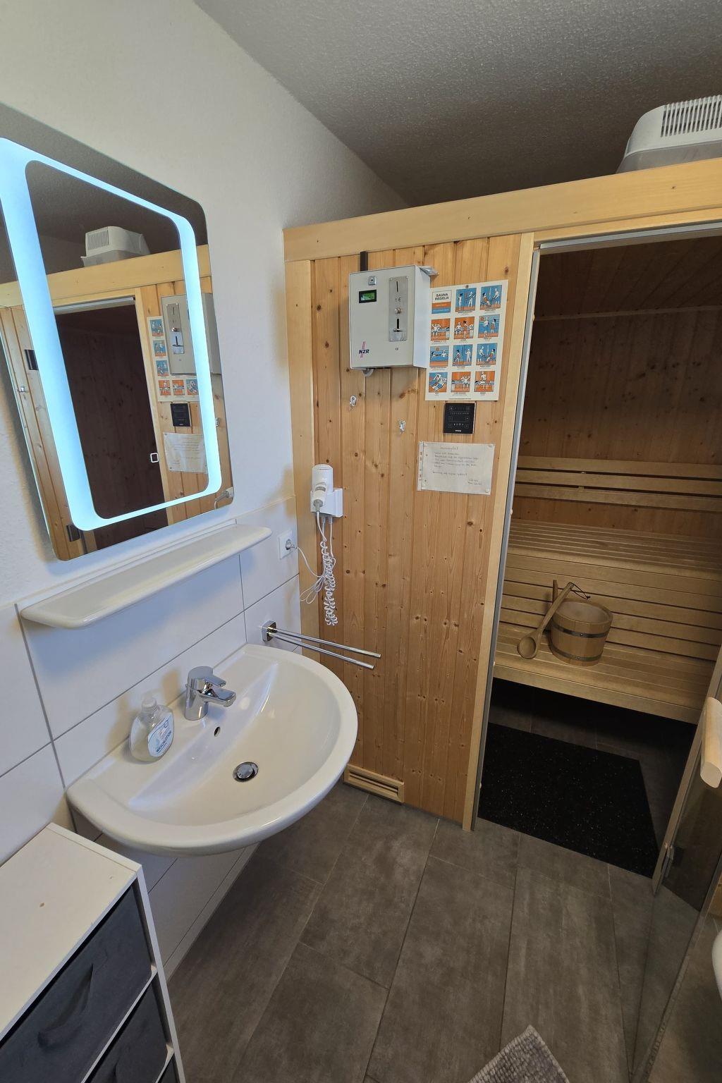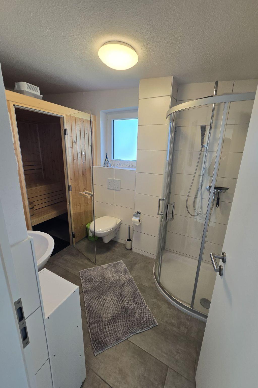 The Deichkieker holiday home has 2 floors. On the lower floor there is an open-plan living/dining area with a sofa and an armchair for relaxing, a large flat screen TV, a wood-burning stove for cosy warmth, a fully equipped kitchen (coffee machine, kettle, toaster, dishwasher, oven, etc.), a guest WC, a small storage room and on the upper floor there is a separate bathroom. On the upper floor there is a bedroom (box spring bed 180 x 200) with a wonderful balcony and view of the dyke and a children's room (box spring bed 160 x 200), in the bedroom and guest room there is a flat screen TV), a bathroom with its own sauna. After a sauna session, enjoy the peace and quiet and the view across fields and meadows to the dyke. There is also a barbecue (on request), garden furniture and some fly screens on the windows and doors.
