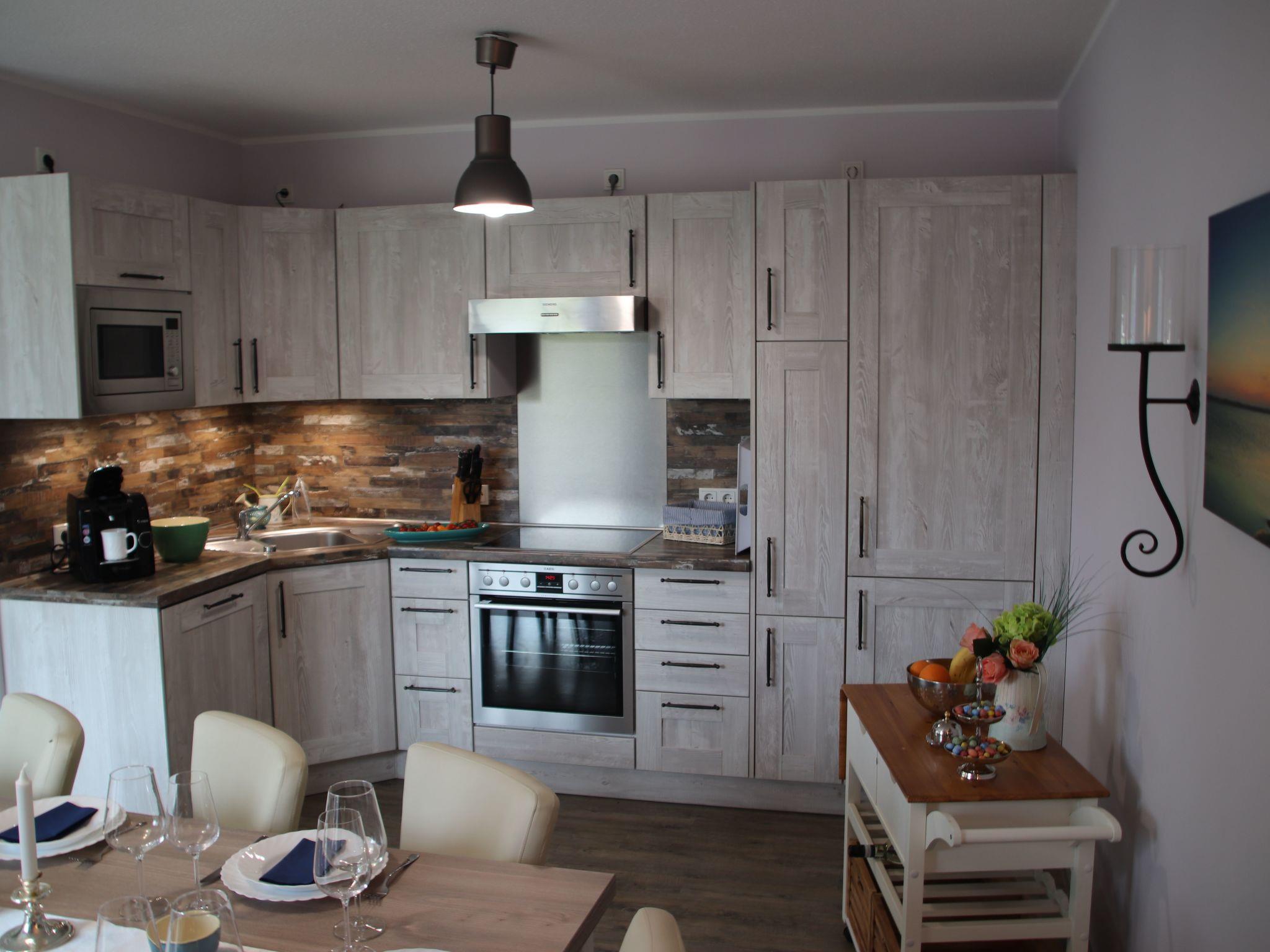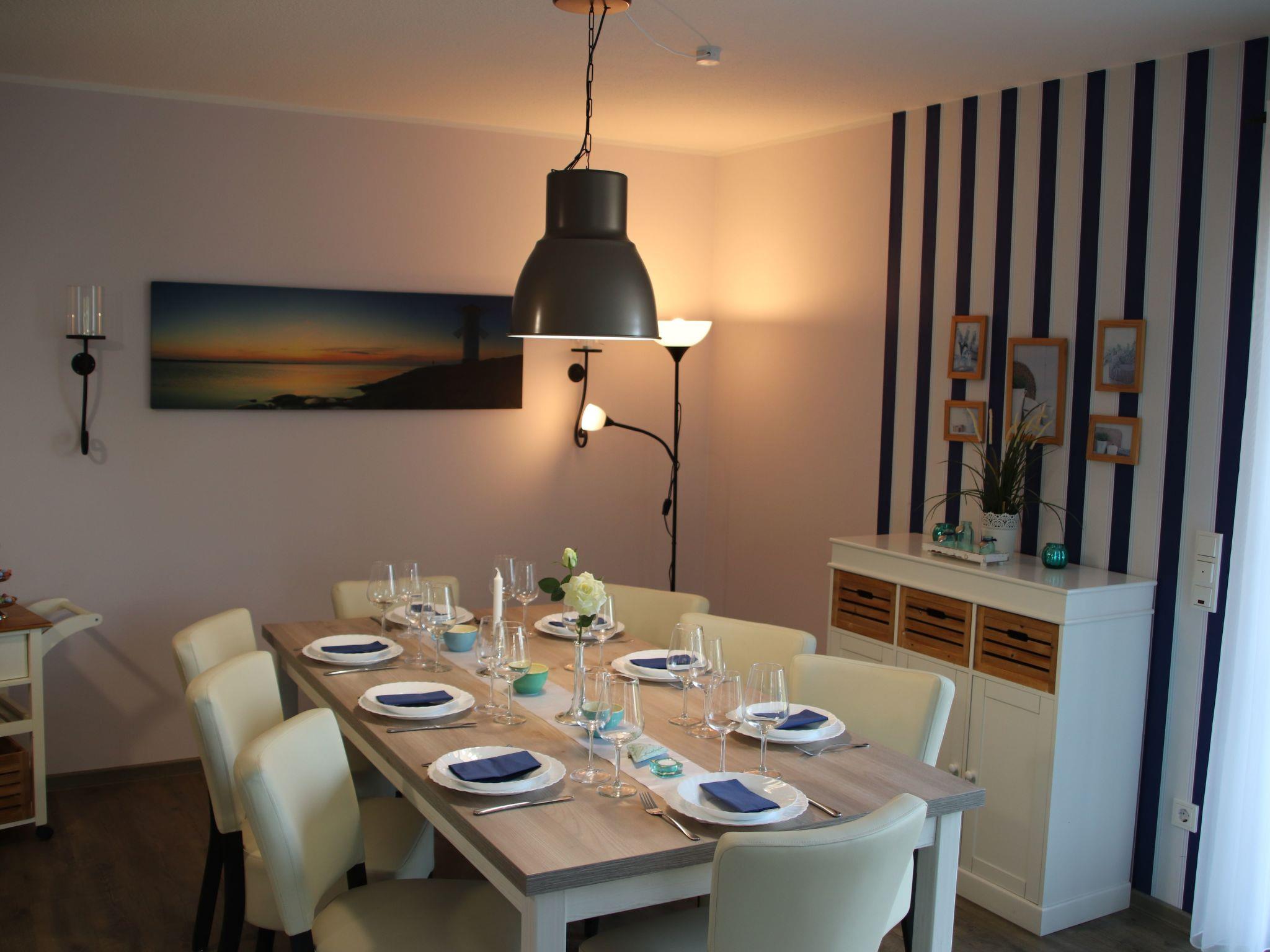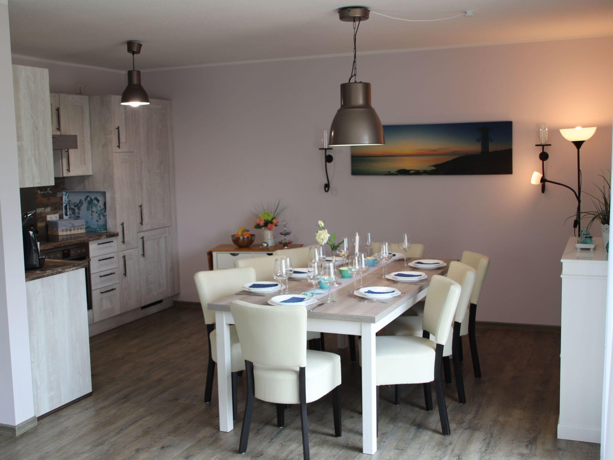 There is a bathroom on both floors. On the top floor there is a daylight-bright, large bathroom with bathtub, shower, WC and two washbasins. The counterpart on the ground floor is a daylight-bright shower room with WC. After a trip to the beach or a relaxing sauna session, take a seat in the cosy living area. A wood-burning stove provides cosy warmth and a high-quality corner sofa and a comfortable rattan armchair invite you to linger. Of course, a flat-screen TV also provides entertainment here, which can be used for your film night with satellite TV, TV-USB connection and DVD player. The well-equipped fitted kitchen with open-plan dining area allows you to cater for yourself comfortably and extensively. From a dishwasher and a cooker with ceramic hob to various coffee machines, all the appliances you could wish for are available. All rooms are equipped with electric shutters and underfloor heating. Bedrooms, terrace and bathrooms also have insect screens. There is a tumble dryer and washing machine in the storeroom (for a fee). A comprehensive range of children's equipment (e.g. children's crockery, high chair, children's cutlery, wooden baby cot with mattress and a stair gate) is available.