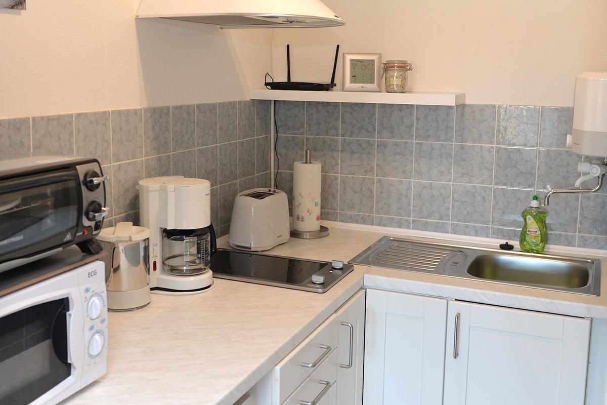 Diese 36 qm große Ferienwohnung liegt im ersten Obergeschoss und ist für 2 bis 3 Personen geeignet. Sie bietet ein separates Schlafzimmer mit Doppelbett sowie eine zweite Schlafmöglichkeit im Wohnbereich mit Schlafcouch (1,60x2,00) mit Lattenrost. Das Wohn/Esszimmer hat eine Essecke, Sat TV / Radio und einen Zugang zum möblierten Balkon. Die Küche ist mit einer Küchenzeile, 2 Plattenherd und Mikrowelle mit Heißluft usw. ausgestattet. Im Badezimmer ist eine Wanne, Waschbecken und WC. Sie haben einen PKW-Stellplatz.