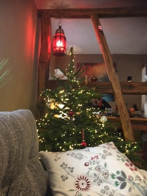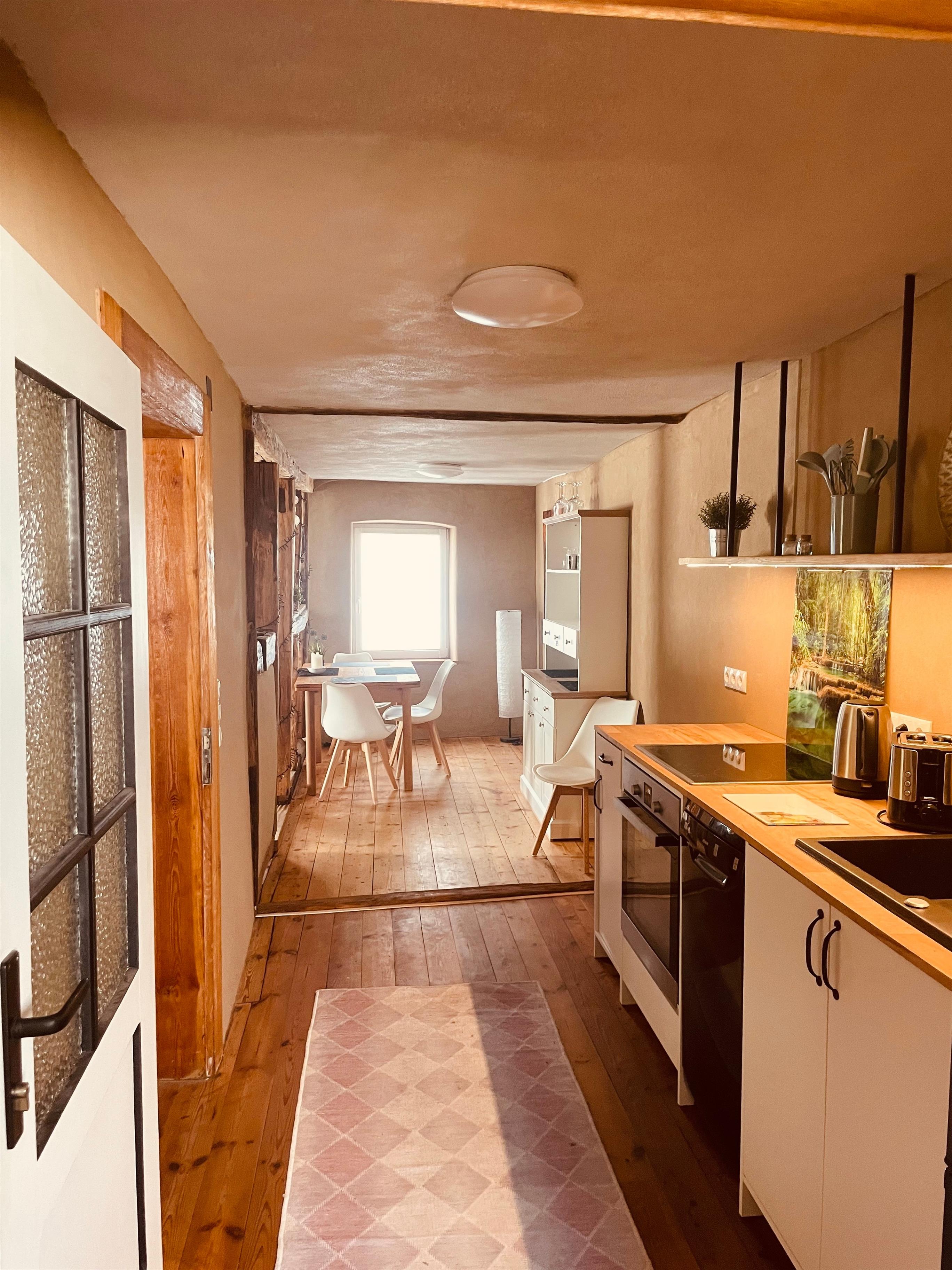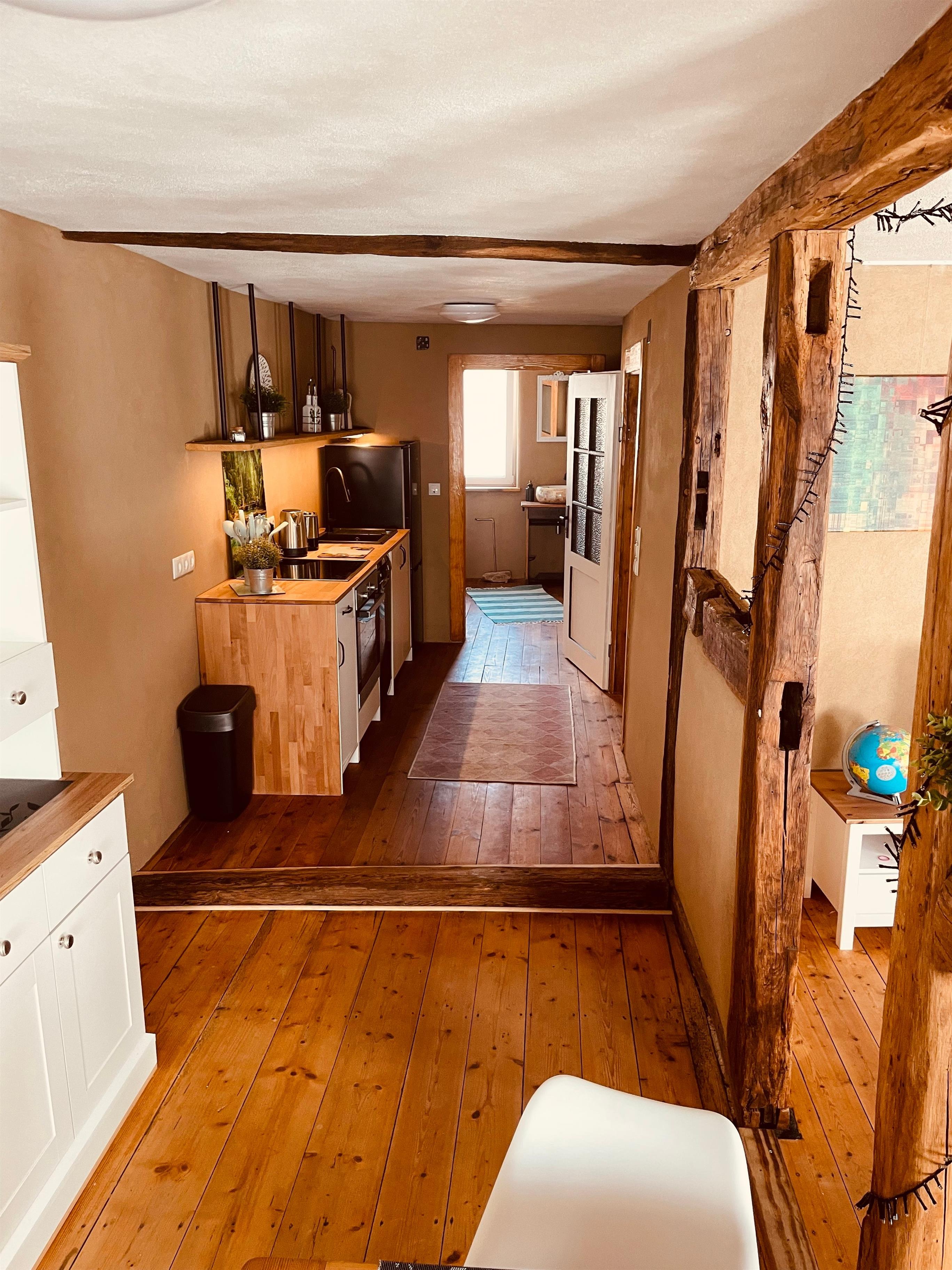 Der große Wohn/Essraum ist mit offenem Fachwerk getrennt.