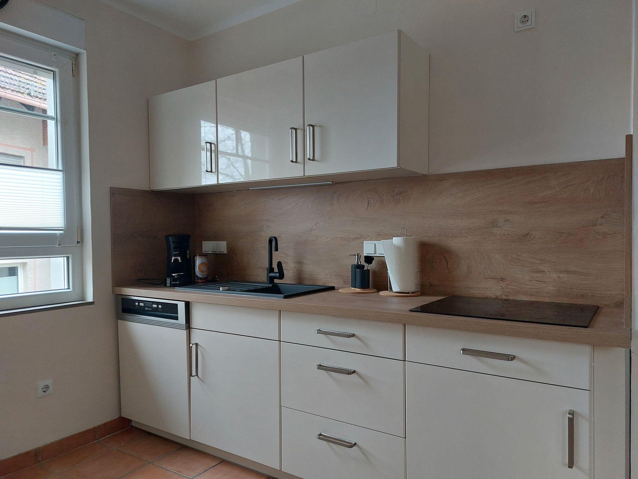 Küche mit Essbereich, Spülmaschine, Backofen, Kaffeepadmaschine.