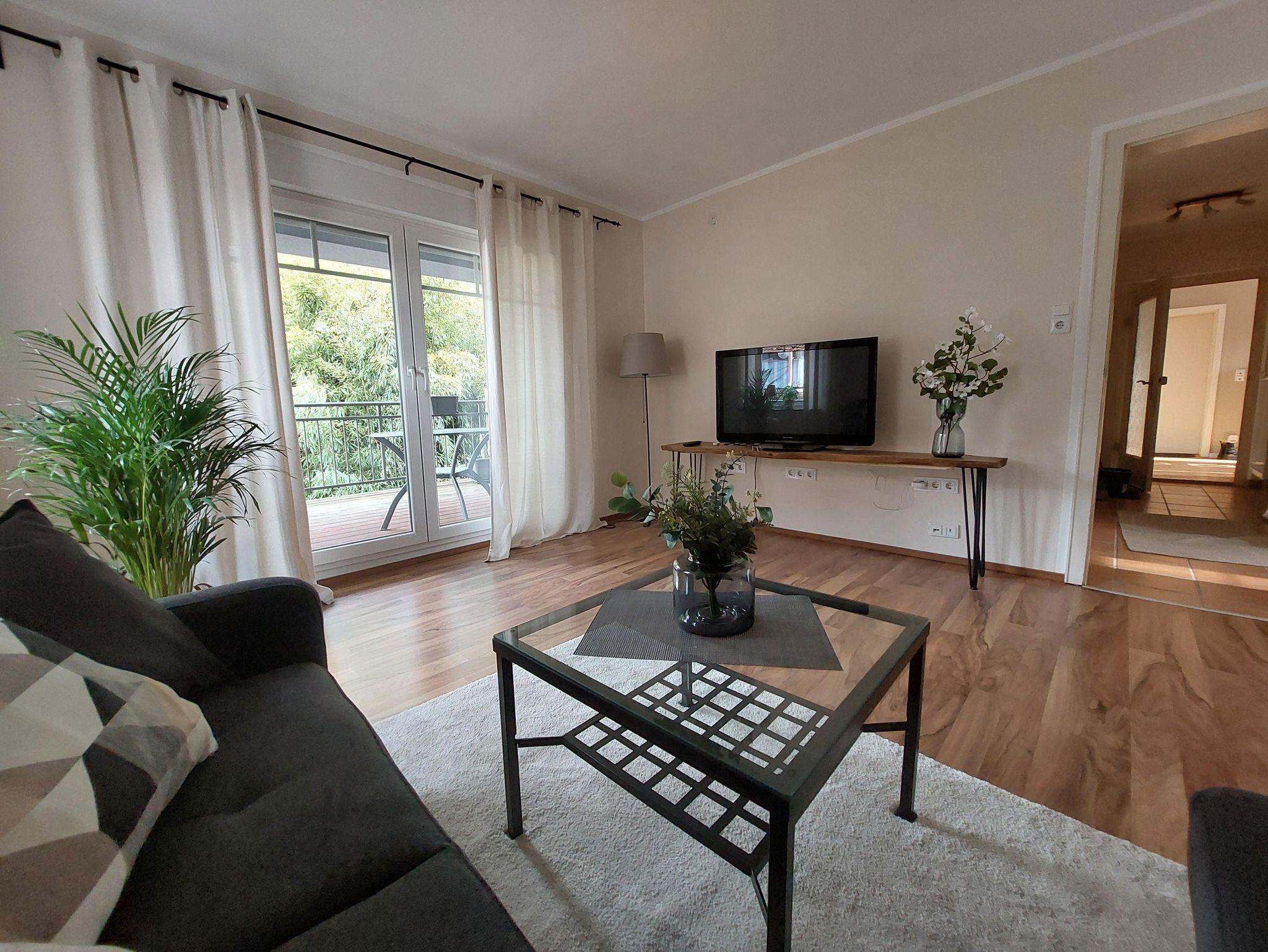 Wohnzimmer, Sofa mit Schlaffunktion, Fernseher und Balkon mit Sitzmöglichkeiten.