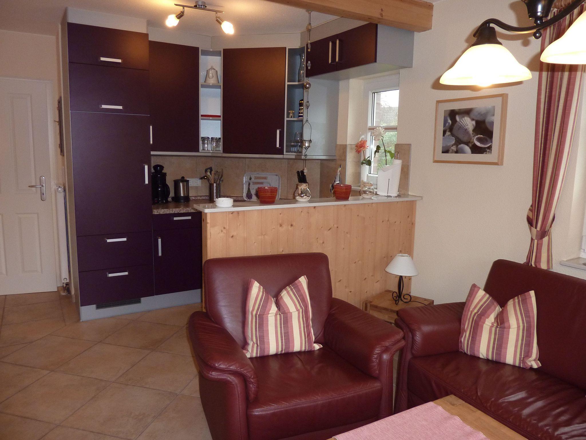 Anschließend an das Wohnzimmer befindet sich eine komplett eingerichtete Küche. Auch erwartet Sie hier eine Terrasse. Genießen Sie beim Frühstücken oder Relaxen die Sonnenstrahlen und die frische Nordseeluft! Aber auch außerhalb der Hautsaison ist das Haus ein idealer Ausgangspunkt für Ihre Erkundungen an der Nordseeküste.