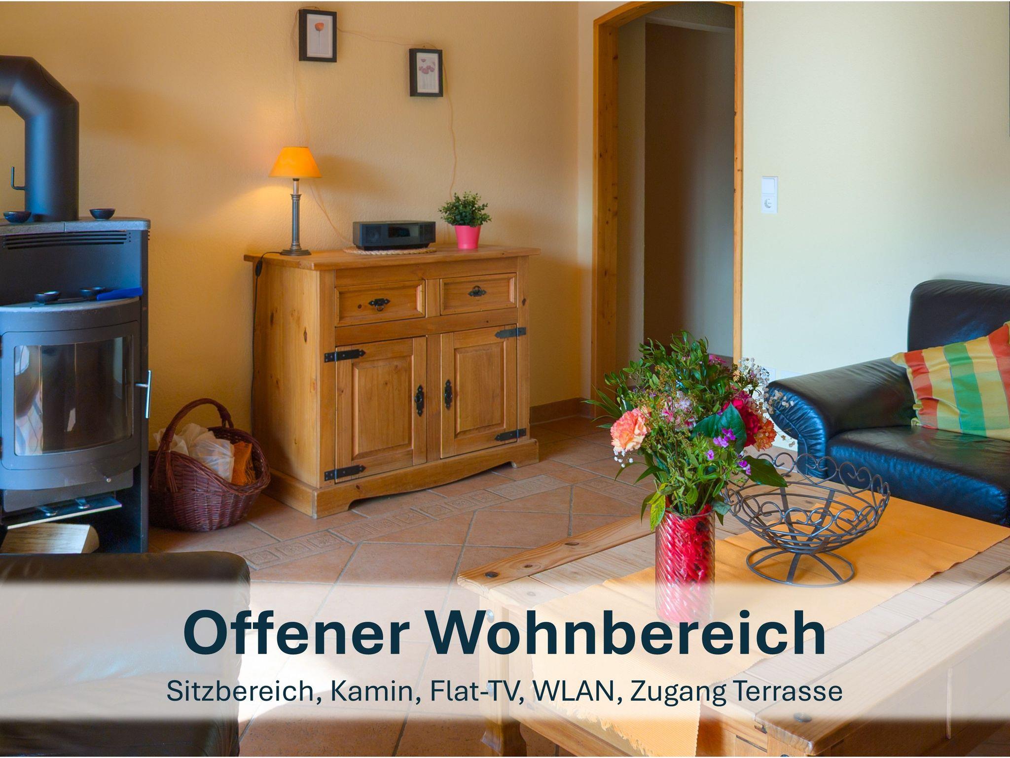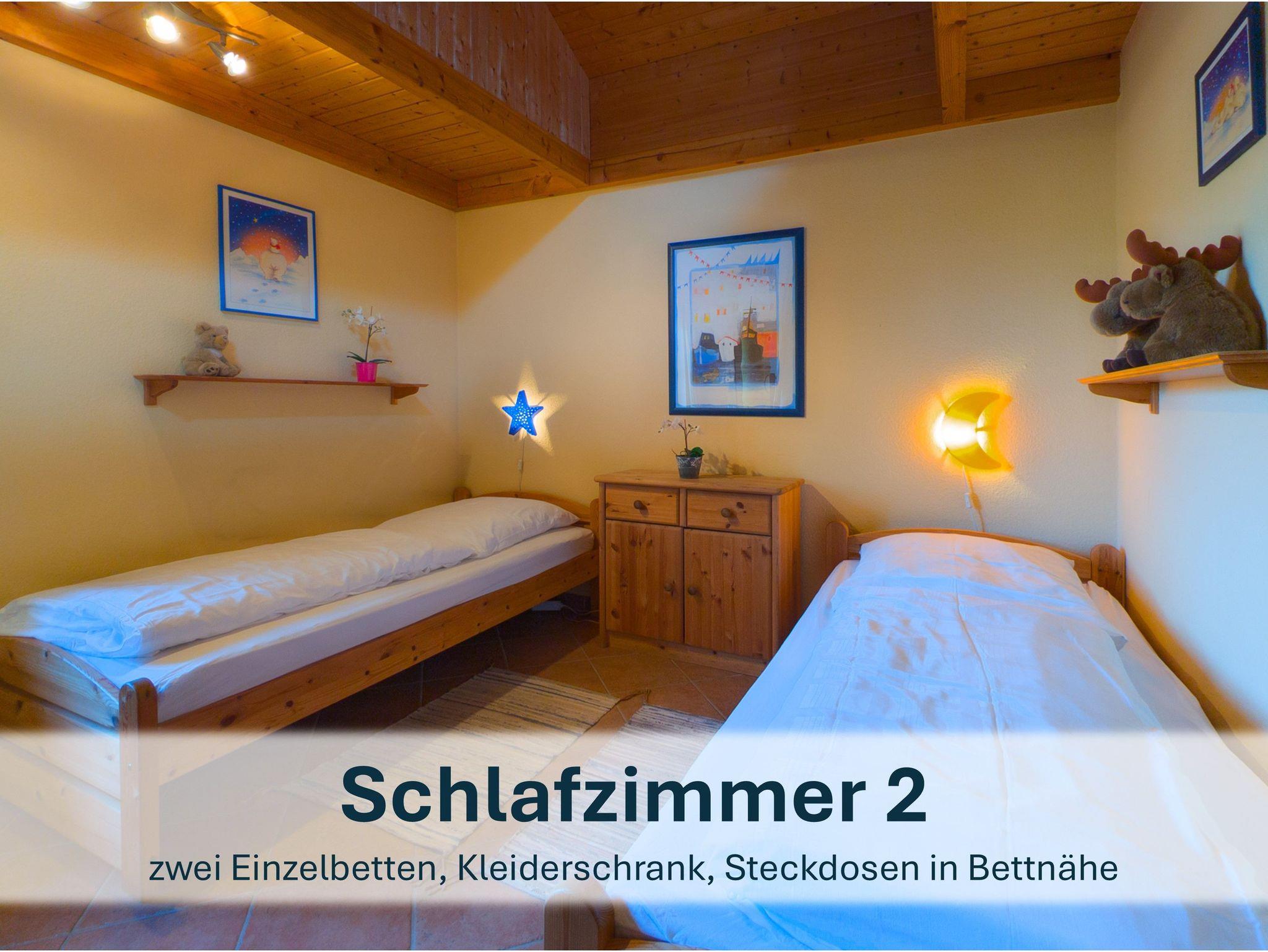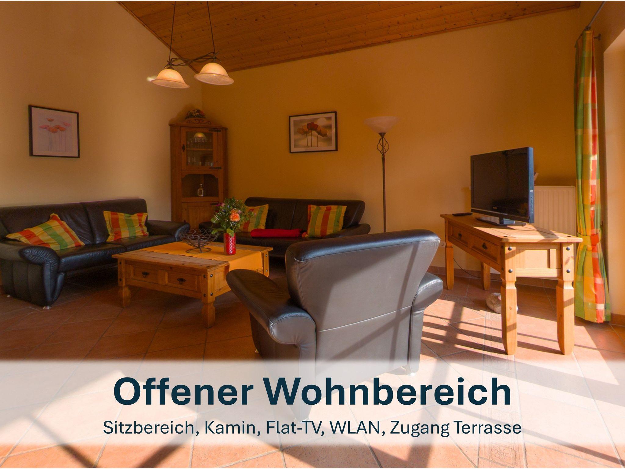 Großzügig geschnittener Bungalow für max. 6 Personen (zzgl. einem Kleinkind). Gemütlicher Wohnraum mit Kaminofen, eine gut ausgestattete Küche mit Essbereich sowie 2 Bäder mit Dusche und WC und 3 Schlafräume (einmal mit Doppelbett, zweimal mit zwei Einzelbetten). Von einem der drei Schlafzimmer führt eine Holztreppe zur 2. Wohnebene auf eine Empore mit einem zweiten Fernseher - ein eigenes kleines Reich für kleine und große Kinder!