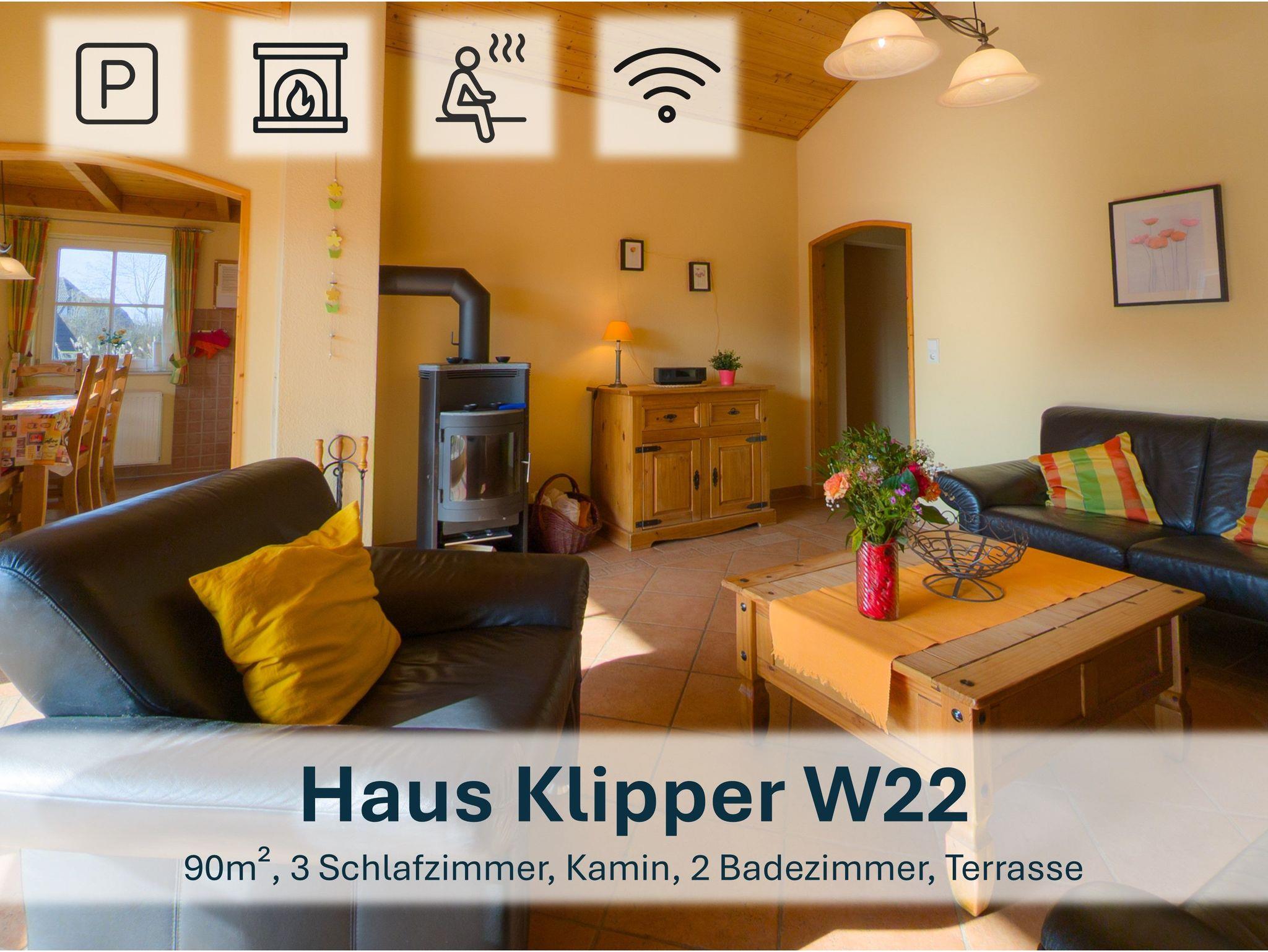 Das Ferienhaus der Kategorie Klipper liegt im neuen Teil des Ferienparks. Es bietet auf 90m² viel Platz für bis zu 6 Erwachsene und einem Kleinkind bis 2 Jahre. Im offenen Wohnraum finden Sie komfortable Sitzmöglichkeiten, einen Flat-TV und einen Kaminofen vor. Angrenzend befindet sich die offene, vollständig ausgestattete Küche mit Esstisch. Beide Badezimmer mit Dusche, WC und Waschbecken liegen im Erdgeschoss. Da muss am Morgen nie jemand anstehen. Die drei Schlafräume liegen ebenfalls im Erdgeschoss und verfügen über je zwei Betten (Doppelbett oder zwei Einzelbetten). Das Beste am Kinderzimmer: über eine Holzleiter kann eine zweite Wohnebene als eigenes Reich für kleine und große Kinder erreicht werden.