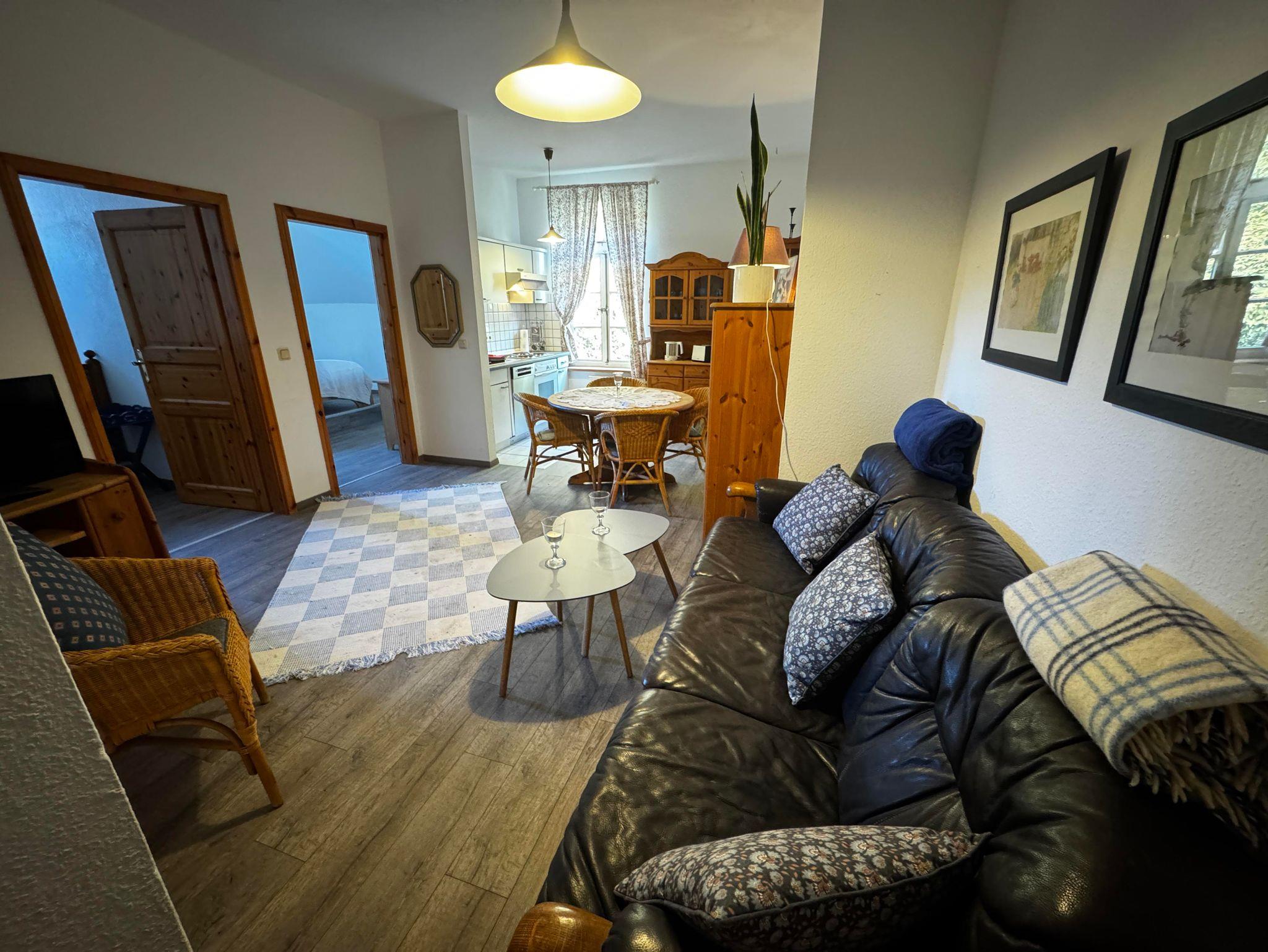 Im hellen Wohnbereich erwarten Sie ein Sofa, Sessel, Sat-TV, Radio und kostenfreies WLAN – perfekt zum Entspannen nach einem erlebnisreichen Tag an der Nordsee. Die angrenzende Wohnküche ist vollständig ausgestattet und verfügt über Geschirr, Spülmaschine, Backofen-Herd-Kombination, Kaffeemaschine, Wasserkocher und Mikrowelle.