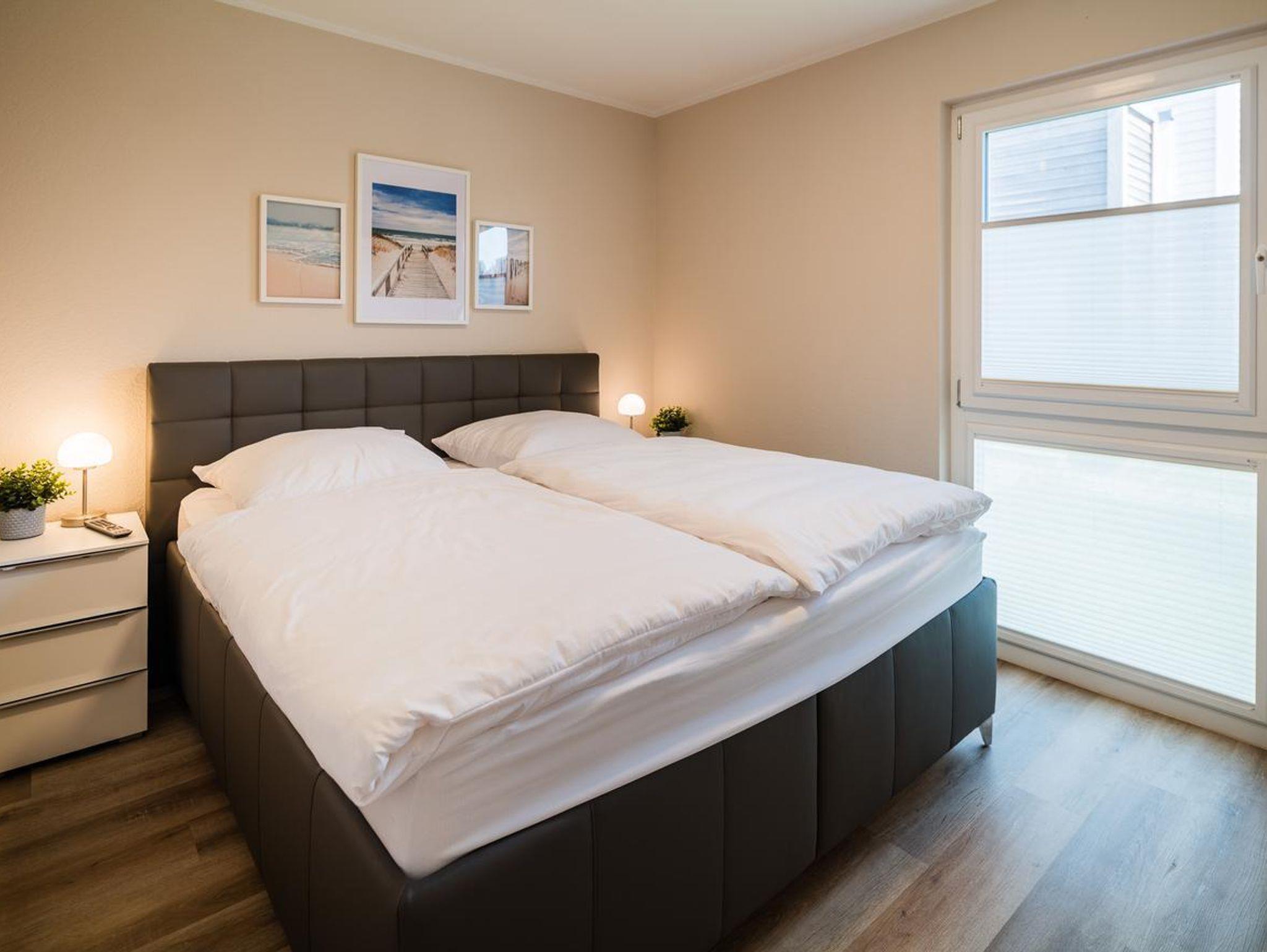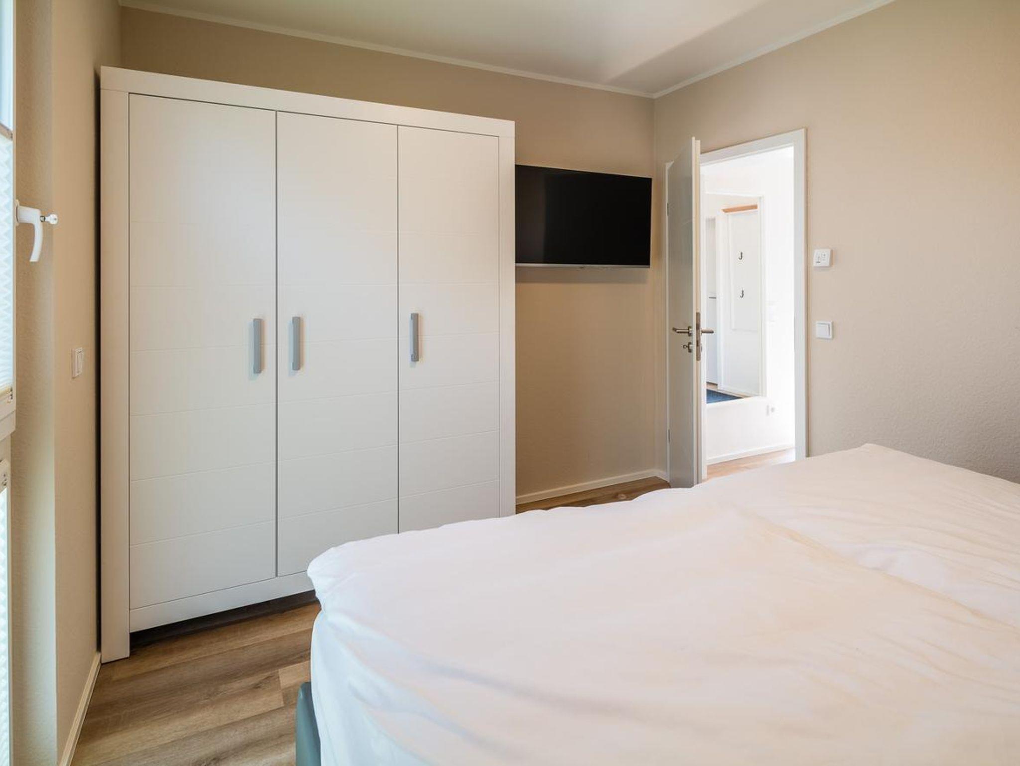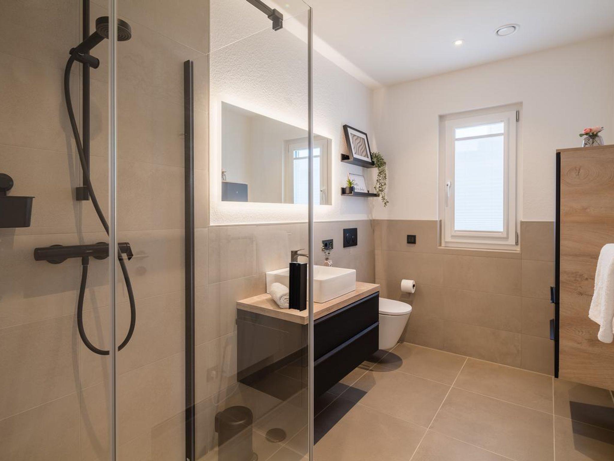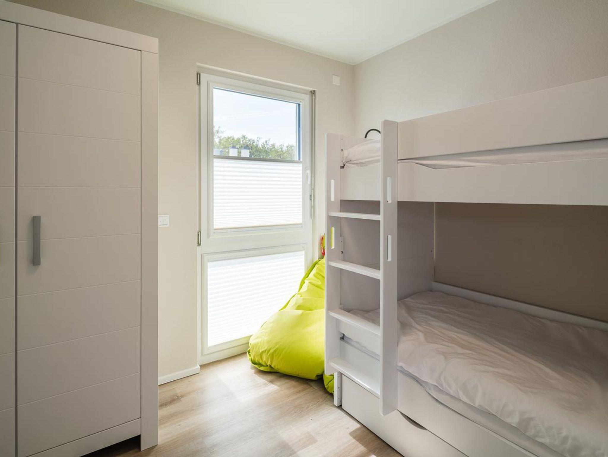 ein Schlafzimmer im Erdgeschoss mit Doppelboxspringbett und Smart-TV, ein Schlafzimmer im Obergeschoss mit Doppelstockbett und Smart-TV, ein Badezimmer im Erdgeschoss mit Dusche und WC, ein Badezimmer im Obergeschoss mit Dusche und WC, einen offener Wohn-Essbereich mit direktem Blick auf den See durch große Panoramafenster (ausgestattet mit Couch, Sitzsack, Tisch, Sideboard mit XL-Smart-TV, Digitalradio/CD-Player, blue ray-DVD-Recorder), komplett eingerichtete hochwertige Einbauküche, Infrarotsauna, Carport sowie weiterer PKW-Stellplatz direkt am Haus, Fahrradständer, Luft-Luft-Wärmepumpe mit Pollenfiltern, Verdunkelung der Bäder und Schlafzimmer über elektr. Rollläden, Fliegengitter, Plissees, WLAN inklusive.