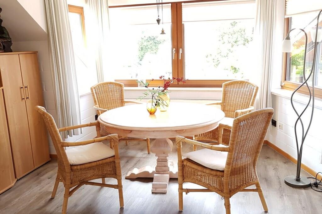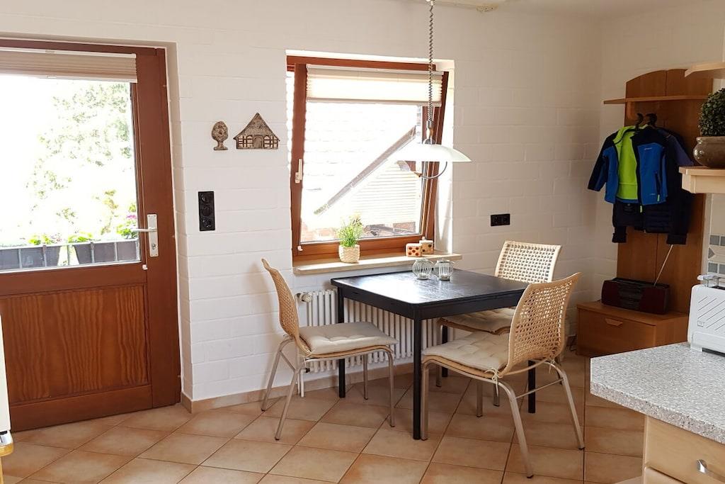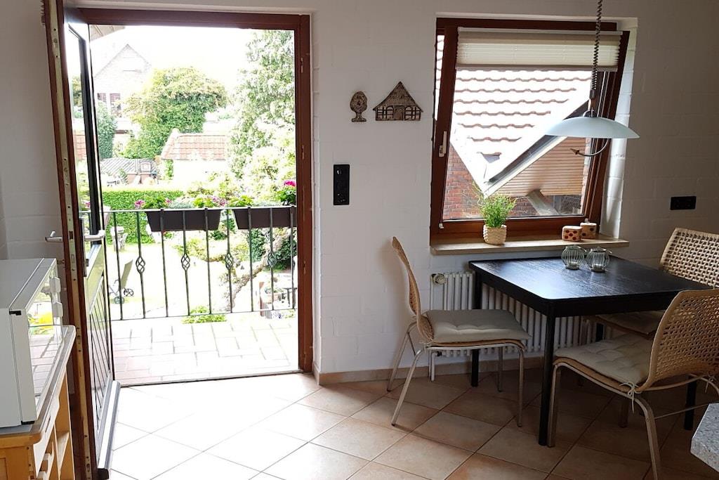 Die 76qm große Ferienwohnung im 1.OG ist direkt im Ortskern, gegenüber der Kirche gelegen. Sie verfügt über ein Bad mit Dusche, ein Schlafzimmer mit Doppelbett (Gitterbettchen), eine komplett eingerichtete Küche mit Balkon und ein großes Wohnzimmer, TV und CD und einer gemütlichen Essecke. Gaststätten und Restaurants befinden sich gleich in der Nachbarschaft. Sämtliche Einkaufsmöglichkeiten sind ebenfalls in unmittelbarer Nähe. Der Strand des Nordseebades und auch die Nordseelagune die Spiel- und Spaßmöglichkeiten unabhängig von den Gezeiten für jung und alt bietet sind in ca. 10-15 min. zu Fuß zu erreichen.
