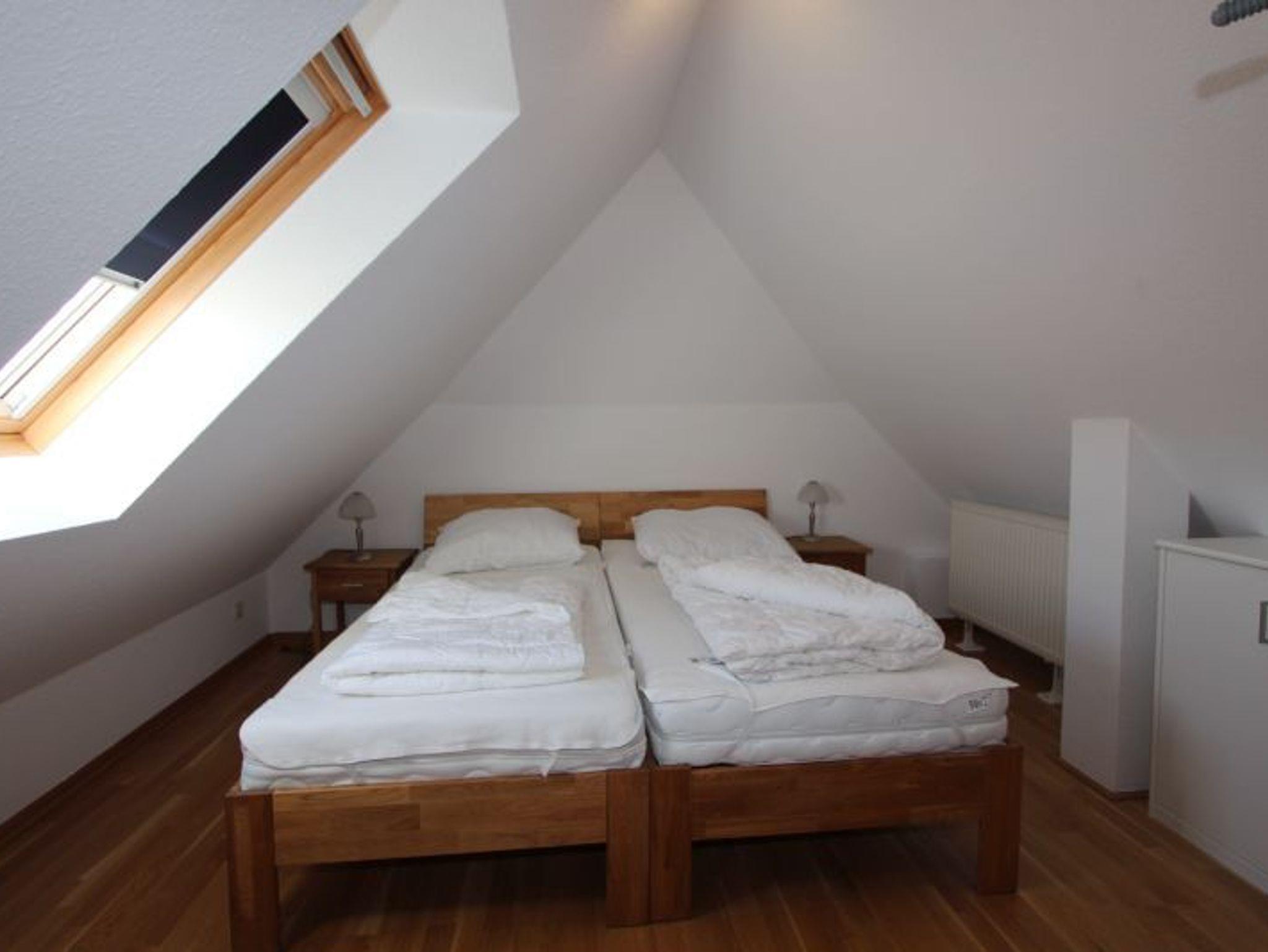 Im Dachgeschoß: ein Schlafzimmer mit variablen Betten (Doppel- oder Einzelbetten)