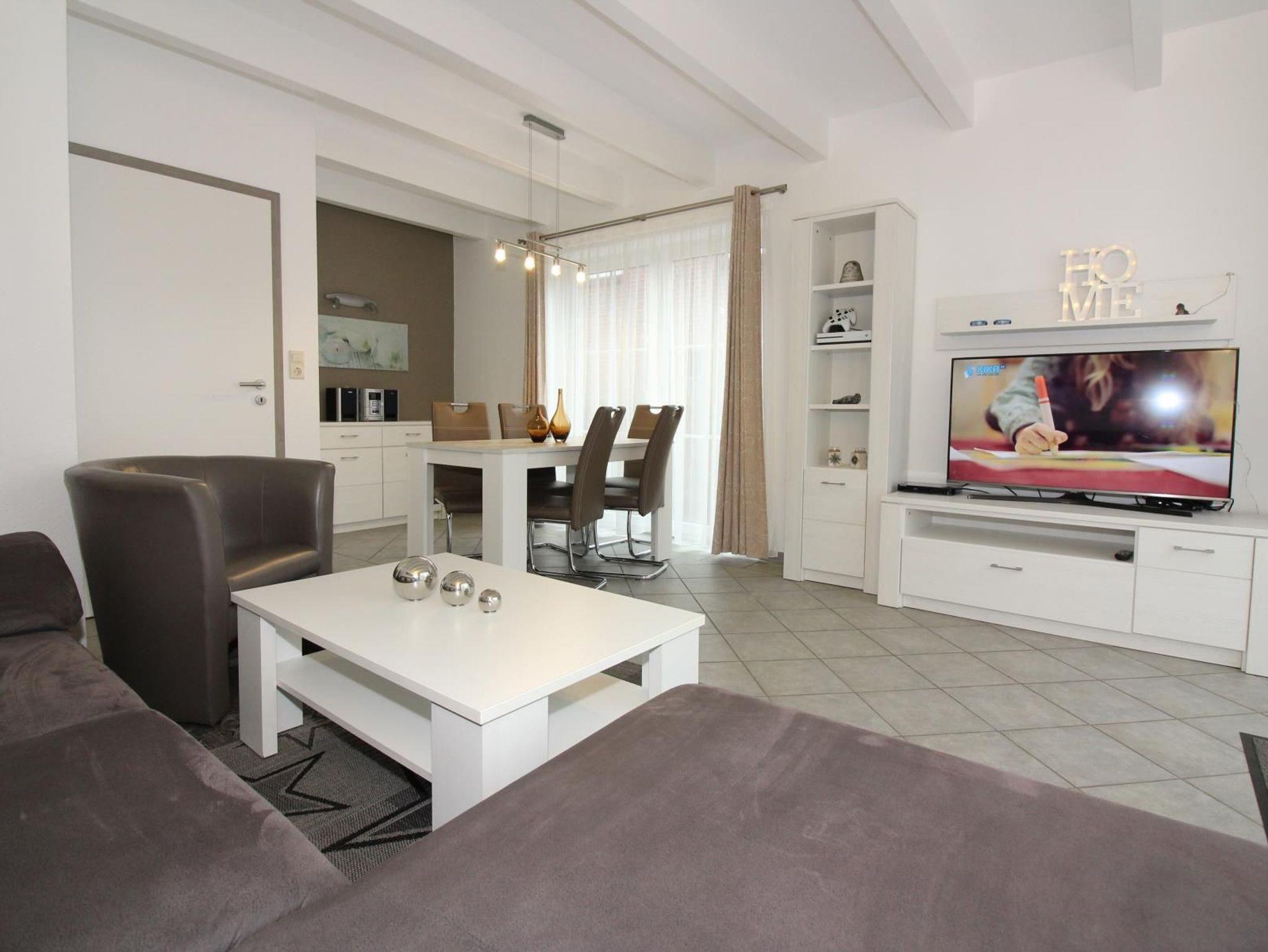 Vom Wohnzimmer aus gelangt man auf die nach Südwesten ausgerichtete Terrasse mit Stühlen, Tisch, Grill, Sonnenliege, Sonnenschirm, Bollerwagen und Abstellraum. Die separate Küche ist ausgestattet mit Backofen, Cerankochfeld, Spülmaschine, Kühlschrank mit Gefrierfach, Mikrowelle, Kaffeemaschine, Eierkocher, Toaster, Wasserkocher und Senseo-Kaffeepadmaschine.