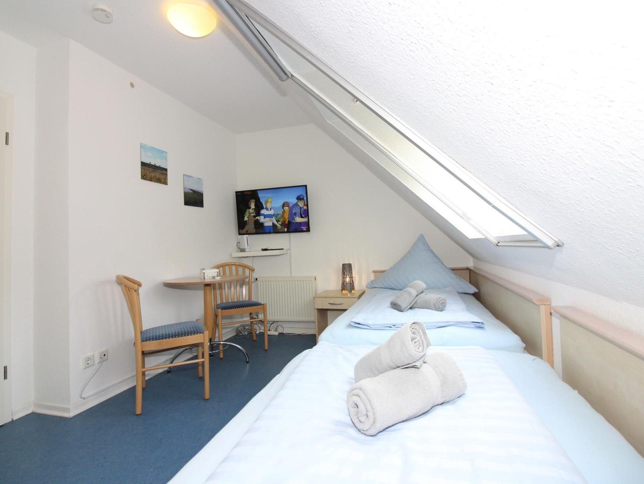 Im Obergeschoss sind zwei Schlafzimmer (eins mit Doppelbett und eins mit zwei Einzelbetten) und das Badezimmer (Dusche mit WC) untergebracht. Das Badezimmer hat ein Fenster (mit Sichtschutzrollo) und die Schlafzimmer haben jeweils Doppelfenster (mit Verdunkelungsrollos).