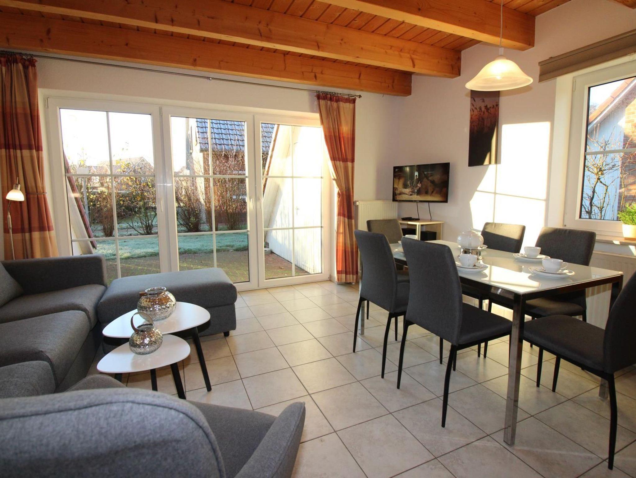 Das gemütliche Wohnzimmer ist mit ausziehbarem Esstisch für bis zu 8 Personen, 3-sitziger Couch, Kabel-TV, Videorecorder, DVD-Player und Stereoanlage mit CD-Player ausgestattet.