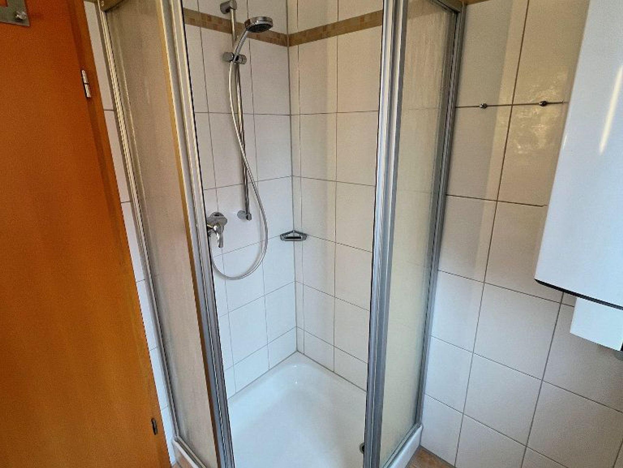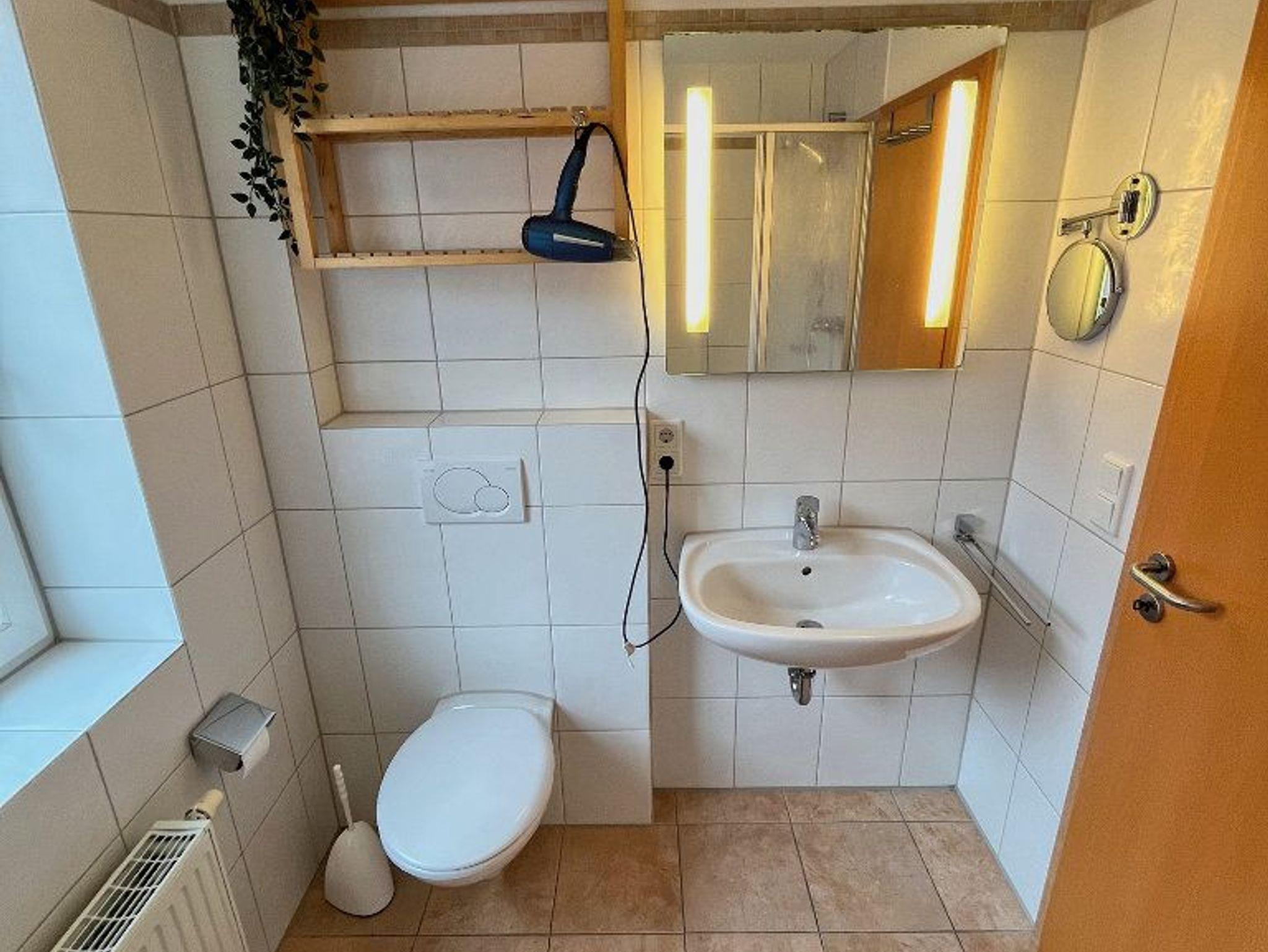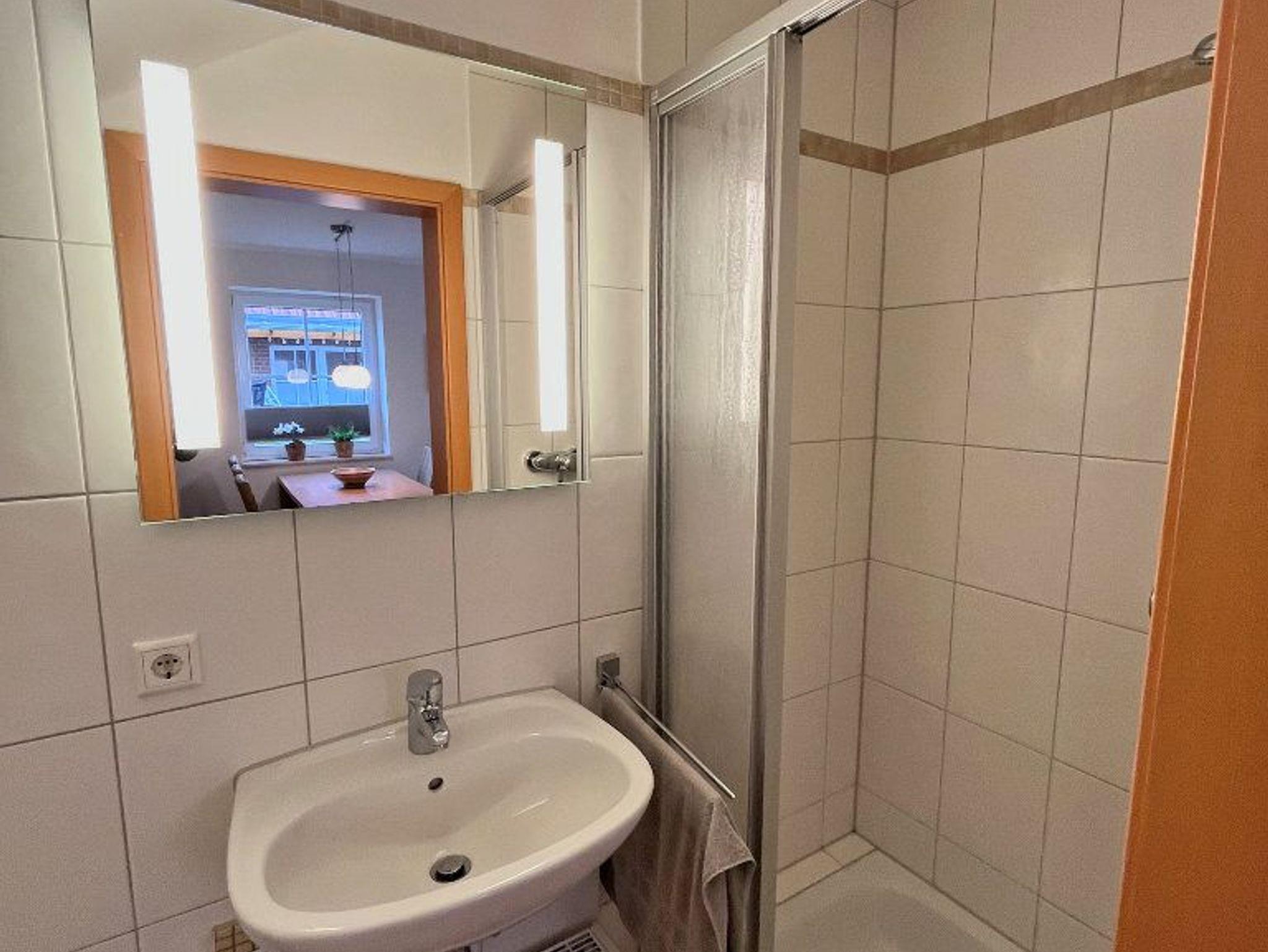 Das Bad im Obergeschoss hat eine großzügige Dusche und Tageslicht.