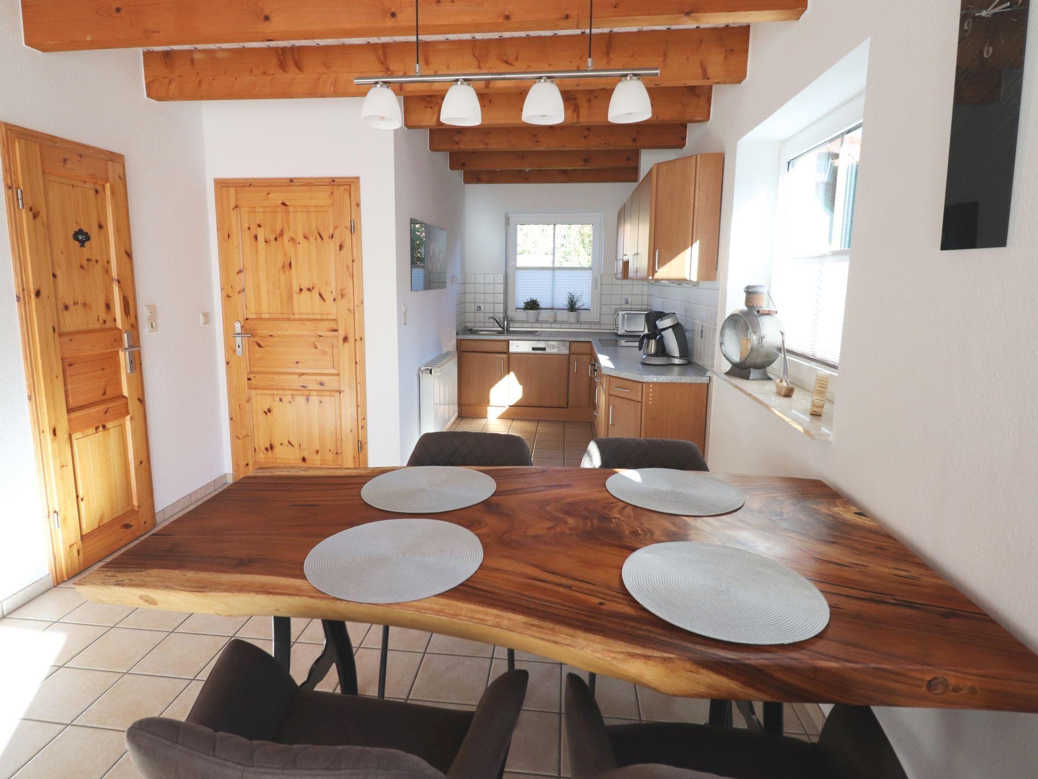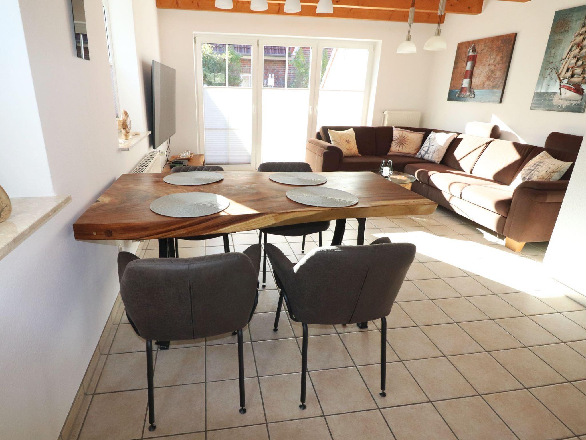 Im Erdgeschoss befindet sich der Eingangsbereich mit Garderobe, von dem aus Sie in den Wohnbereich oder in das Obergeschoss gelangen. Im offenen Wohnbereich finden Sie die voll ausgestattete Küche, ein Gäste-WC sowie den mit Massivholzmöbeln und 70 4K Smart-TV + Blu-Ray-Player ausgestatteten Wohn/Essbereich. Der große Esstisch aus einer dicken Baumscheibe lädt ebenso zum gemütlichen Beisammensein ein wie die Eckcouch (mit Schlaffunktion). Die Terrassentür ist mit einer Insektenschutztür versehen.