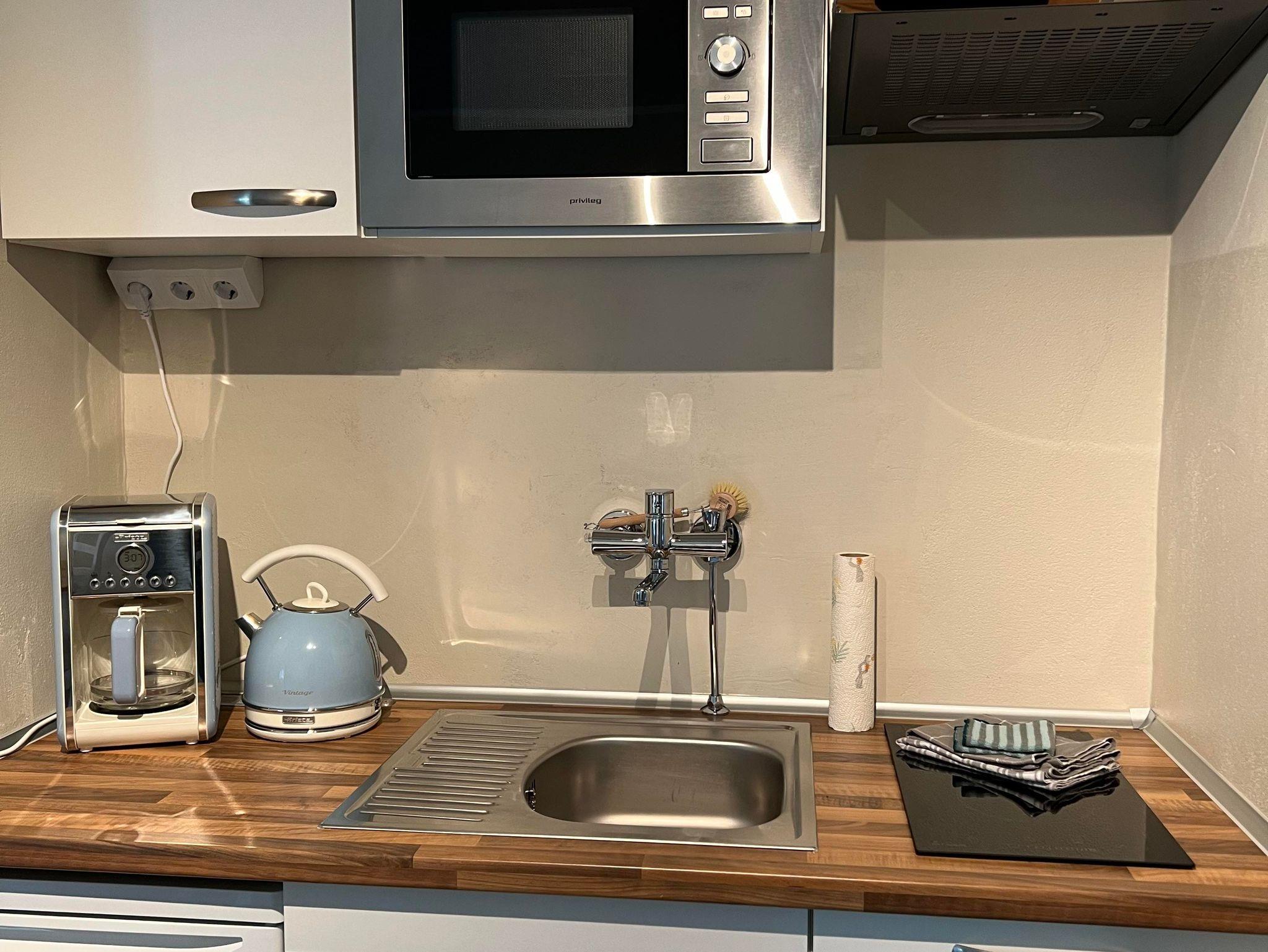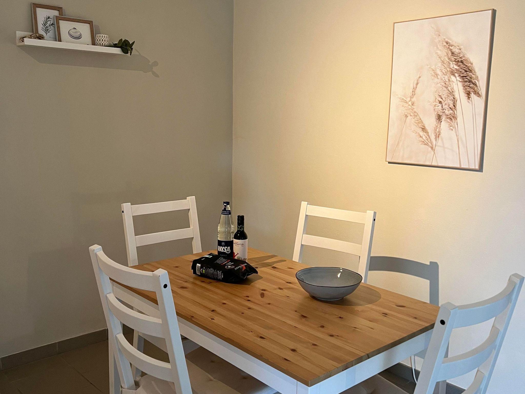 Es gibt ein Schlafzimmer mit Doppelbett und ein Wohn-/Esszimmer mit offener Küche (2-Plattenherd, Kühlschrank, Spülmaschine, Mikrowelle mit Heißluftfunktion) und ein Duschbad.