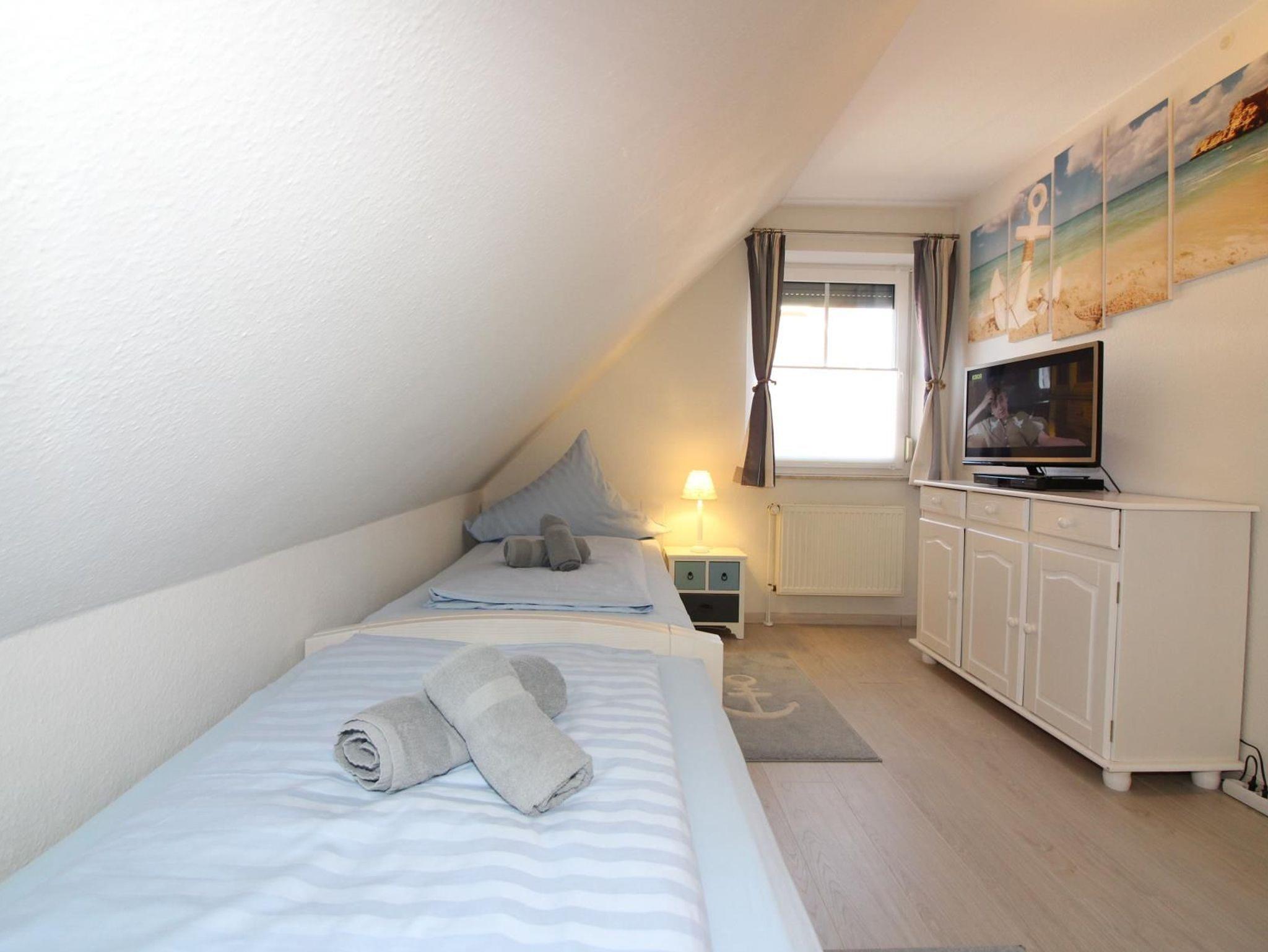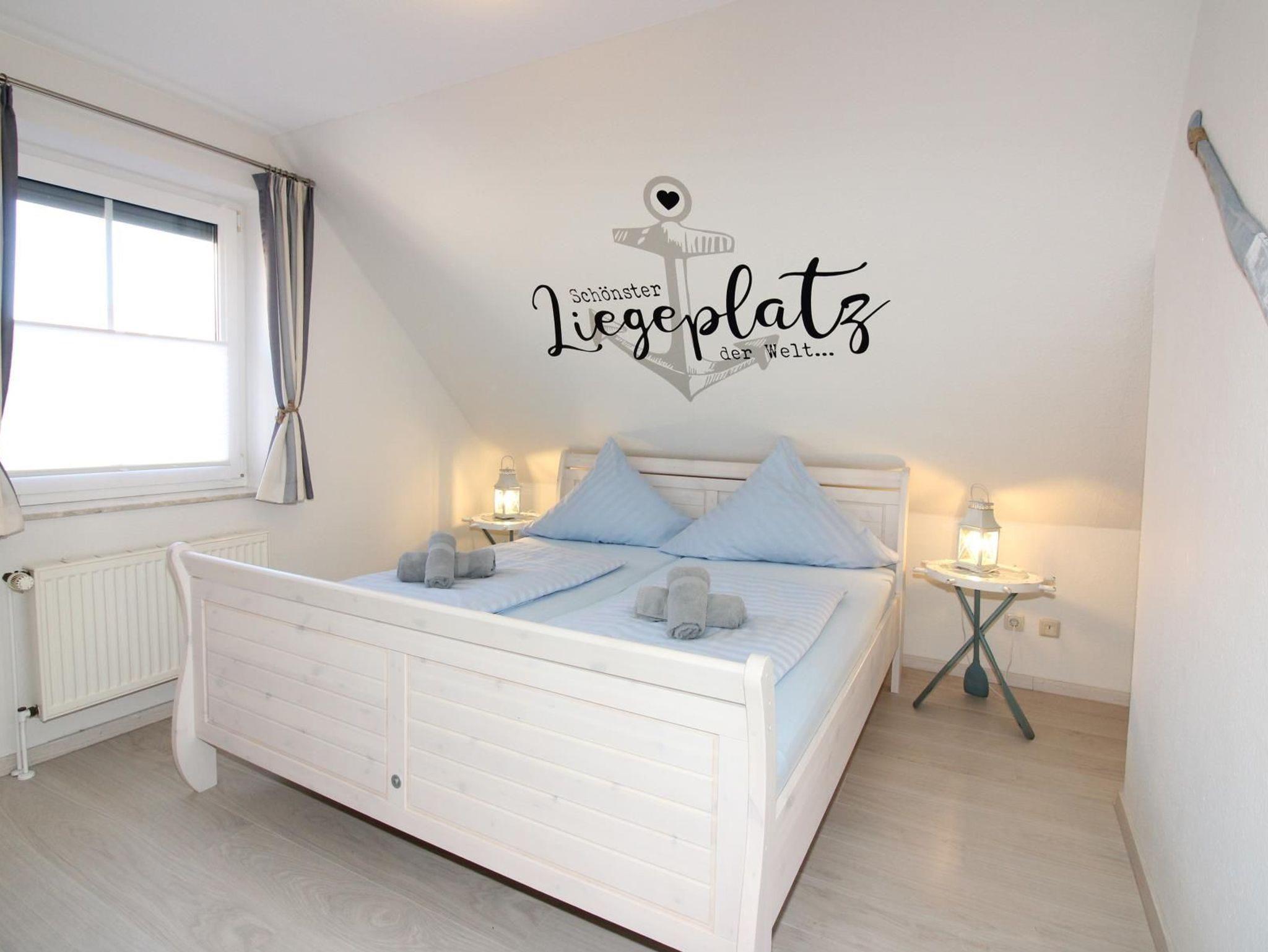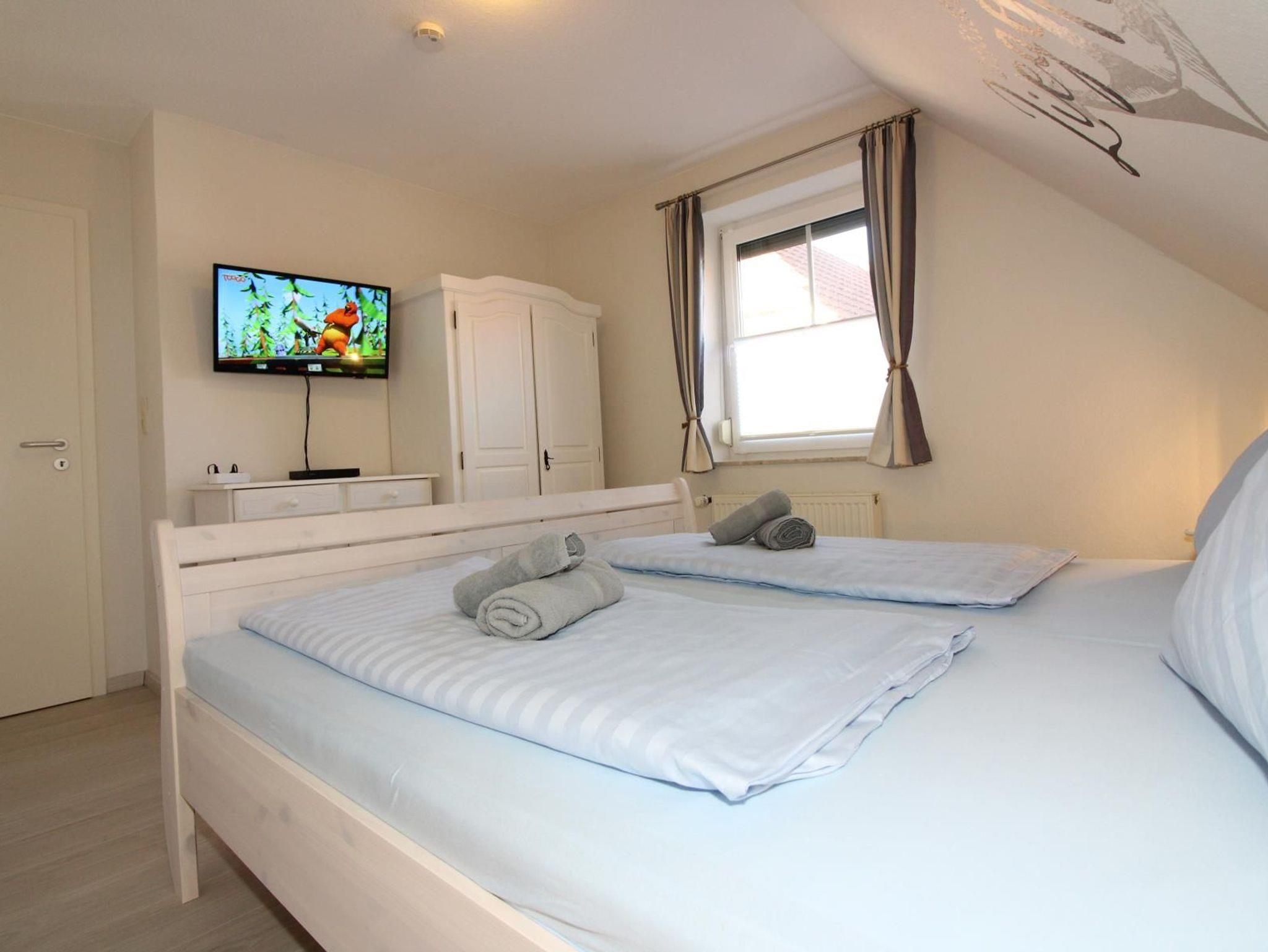 Im Obergeschoss befindet sich dasDuschbad mit WC, ein Schlafzimmer mit Doppelbett inkl. LCD TV mit Blu-Ray-Player. Das zweite Schlafzimmer ist mit zwei Einzelbetten inkl. LCD TV mit DVD-Player ausgestattet. Ein Kinderreisebett inkl. Zusatzmatratze steht im Haus kostenfrei bereit.