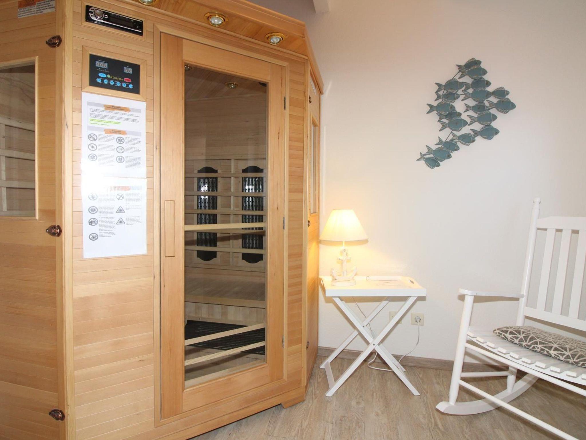 Ein besonderes Highlight ist das Wellness Zimmer im Erdgeschoss. Hier steht eine Infrarotwärmekabine für bis zu 2 Personen zur Verfügung, in der man sich an kalten Tagen oder nach einem windigen Spaziergang am Strand entspannen und aufwärmen kann. Auchdieses Fenster verfügt über ein Insektenschutzgitter. Bitte beachten Sie unbedingt die Hinweise zur Benutzung und Sicherheit in unserem Hausordner.