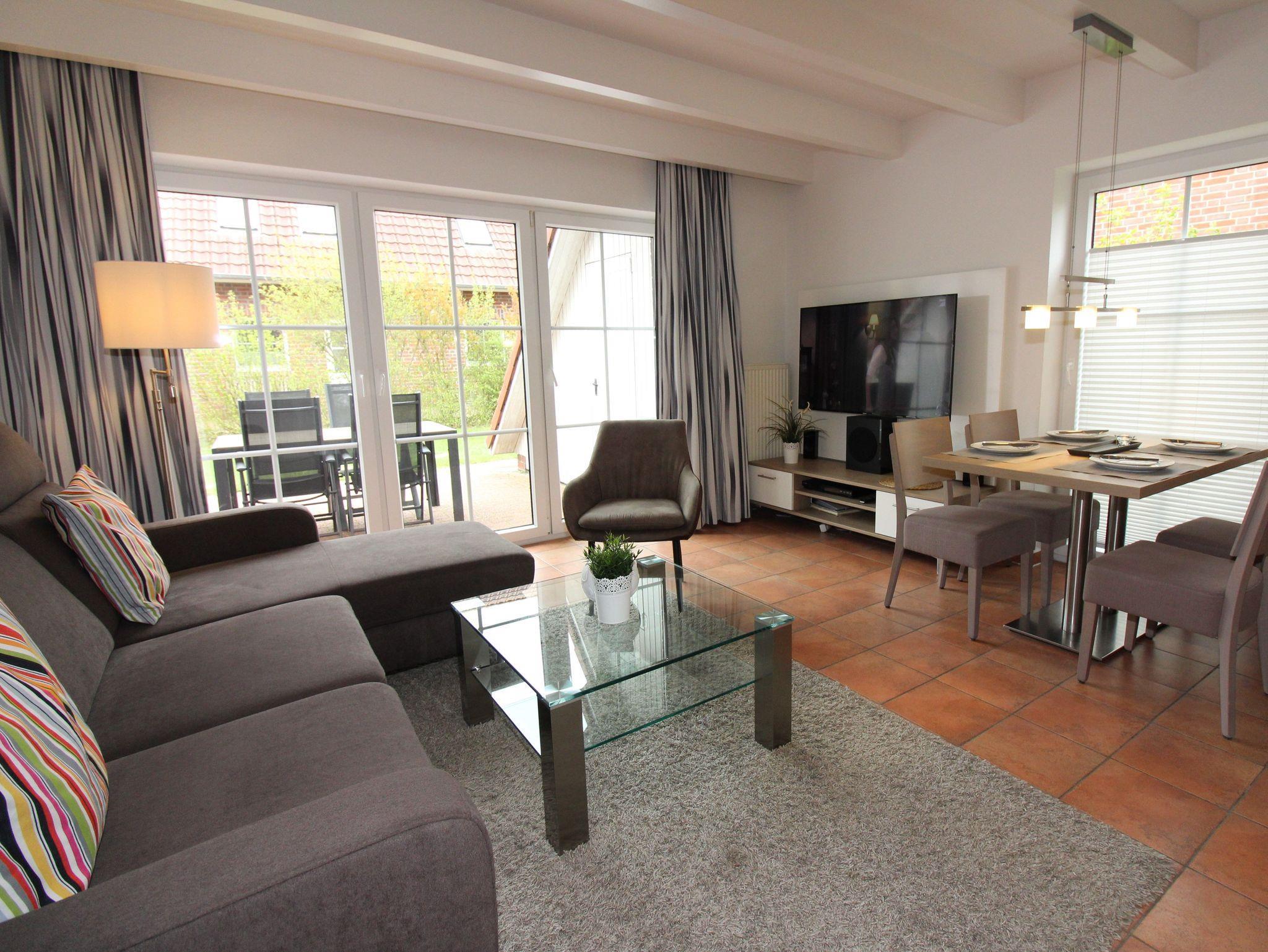 Der Wohnbereich verwöhnt Sie mit bequemer Couch, 55'' LCD TV mit Kabelanschluss, Blu-ray-Player und