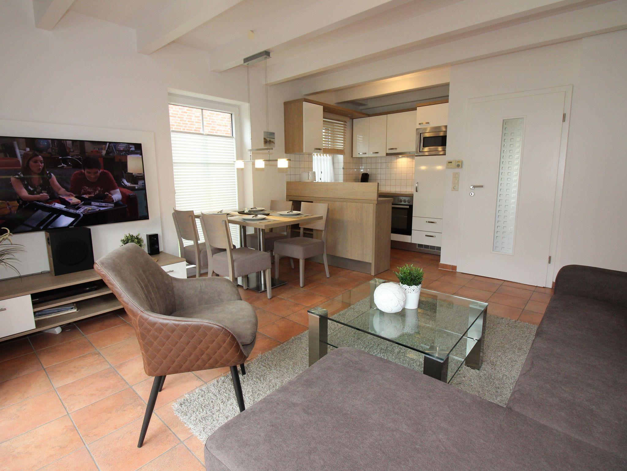 Die offene Küche ist hervorragend ausgestattet mit Backofen, Spülmaschine, Kühlschrank mit Tiefkühlfach,