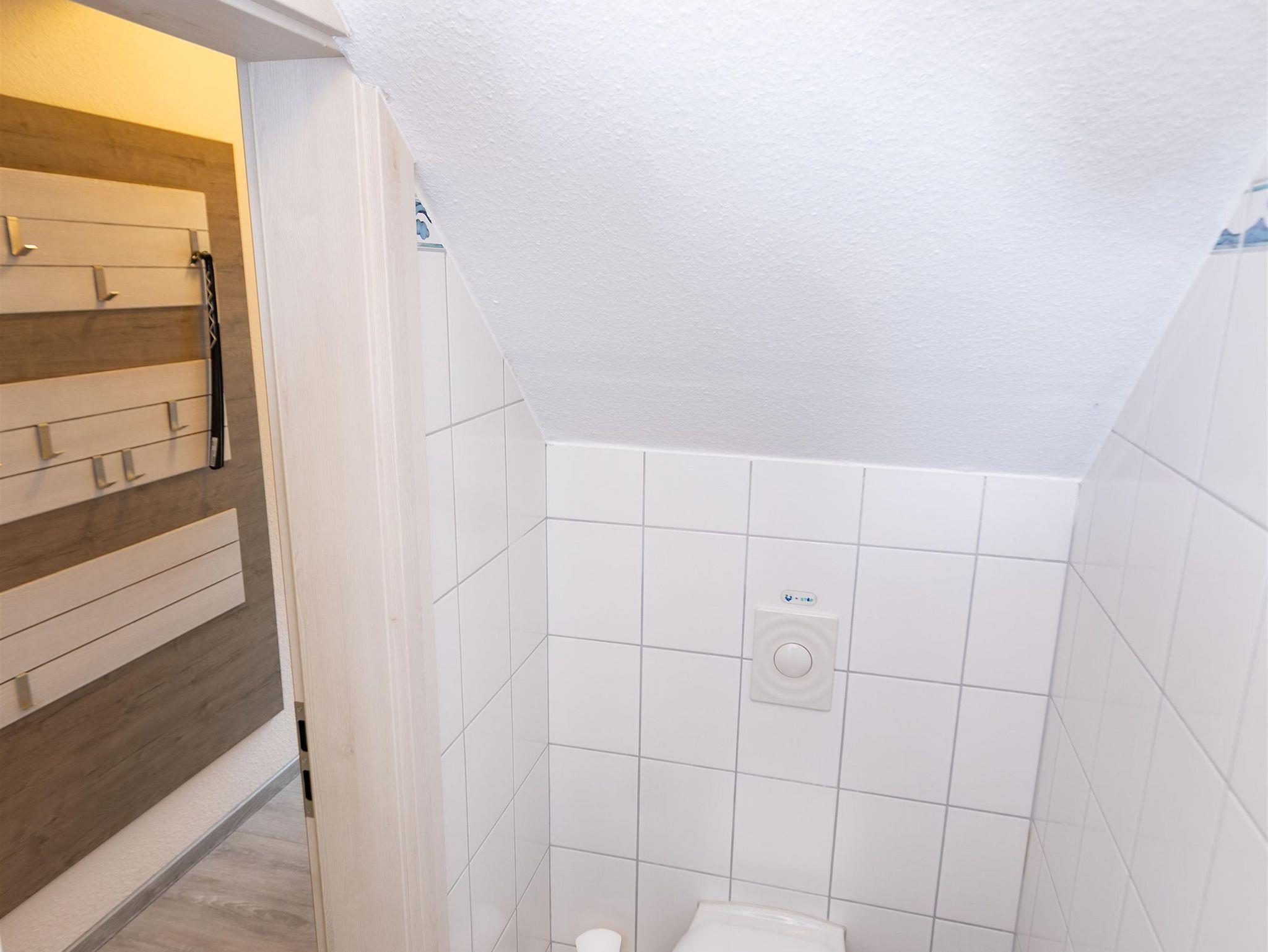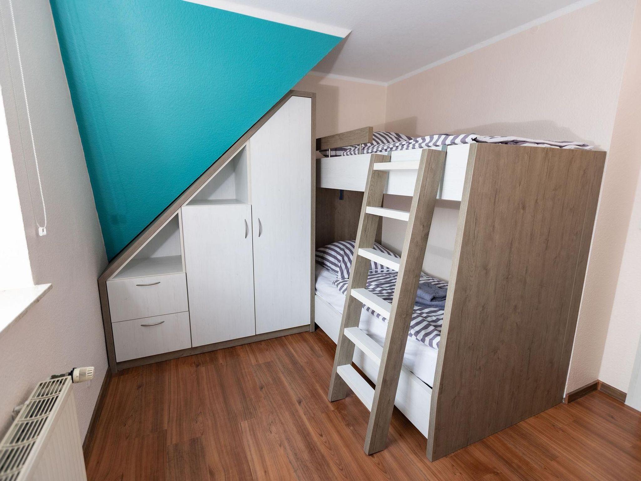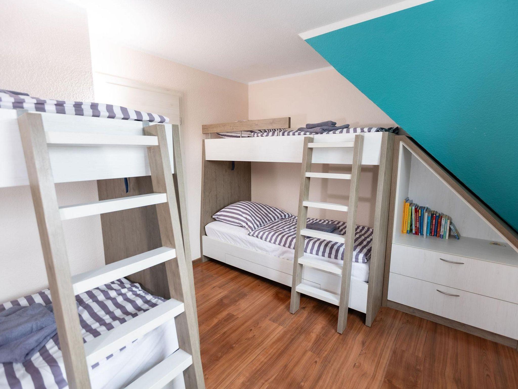 Im Erdgeschoss befindet sich der Flur, die Küche, das Wohnzimmer mit angrenzender Terrasse und ein separates WC. Im Obergeschoss finden Sie zwei Schlafzimmer. Eins mit Doppelbett und eins mit 2 großen Etagenbetten. In beiden Zimmern gibt es große Kleiderschränke.