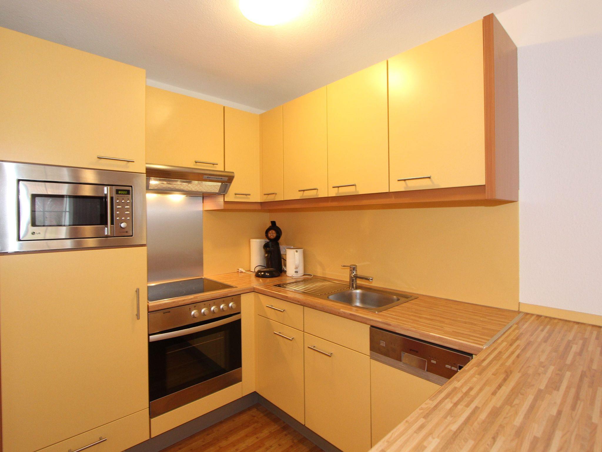 Der Wohn-/Essraum verfügt über eine große, sehr bequeme Doppelbettcouch mit Ottomane (als Schlafmöglichkeit für die 7. und 8. Person), einen separaten Essplatz mit Kinderhochstuhl sowie einen voll ausgestatteten Küchenbereich mit Ceran-Kochfeld, Geschirrspüler, Mikrowelle und großzügiger Arbeitsfläche.