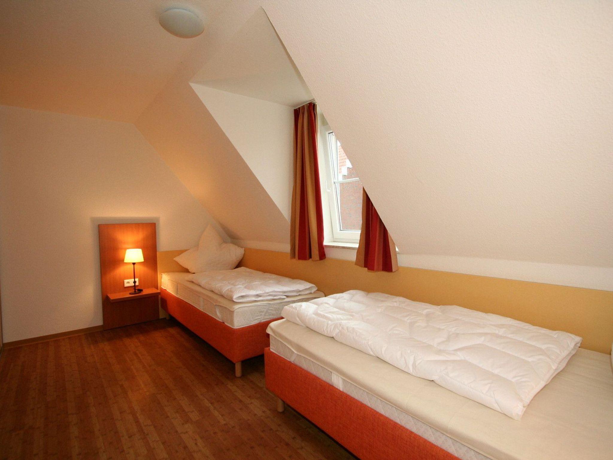 Weiterer Schlafraum mit 2 Einzelbetten, großem Kleiderschrank sowie Schreibtisch, Korbsessel und CD-Kassettenradio.