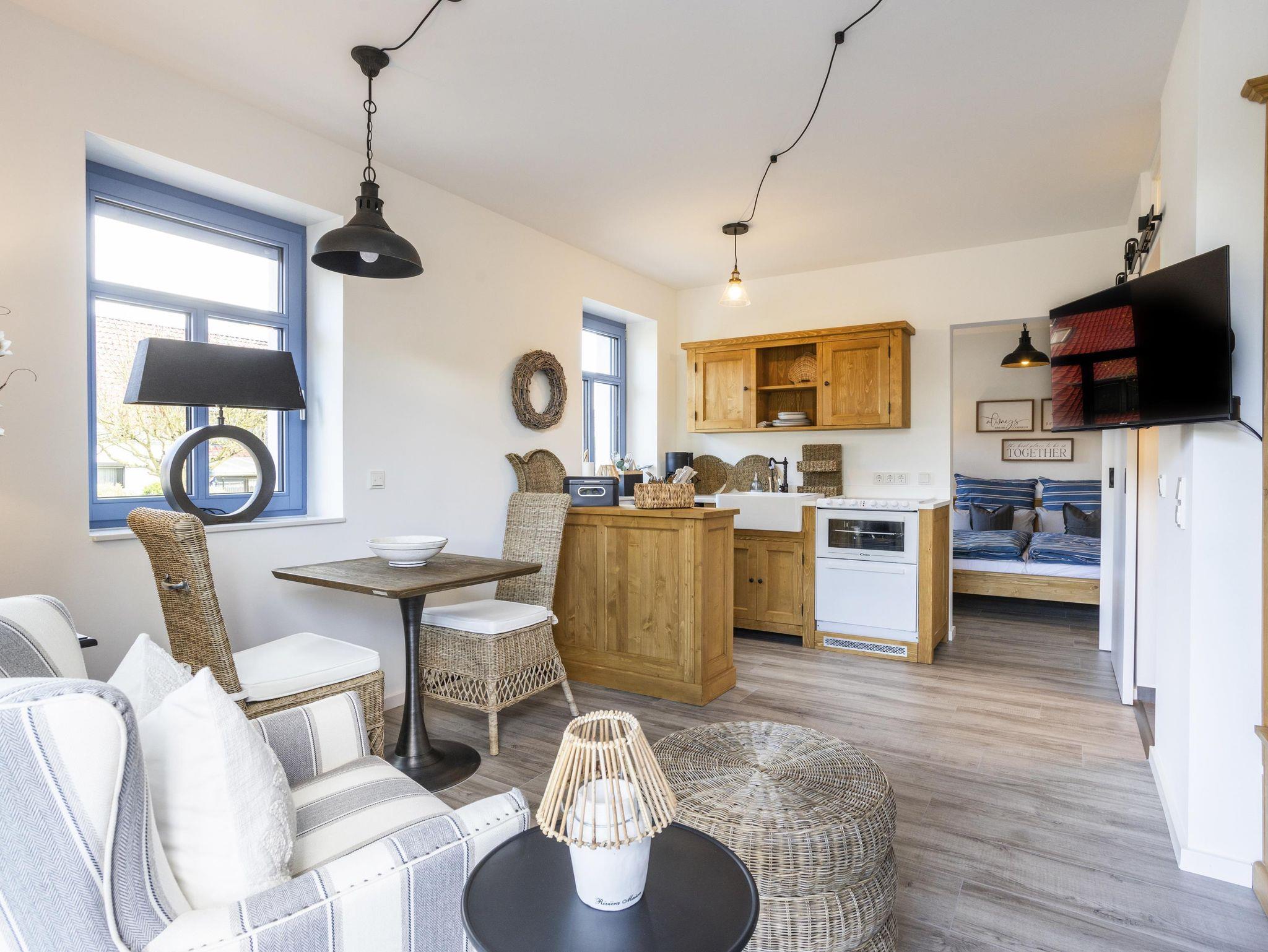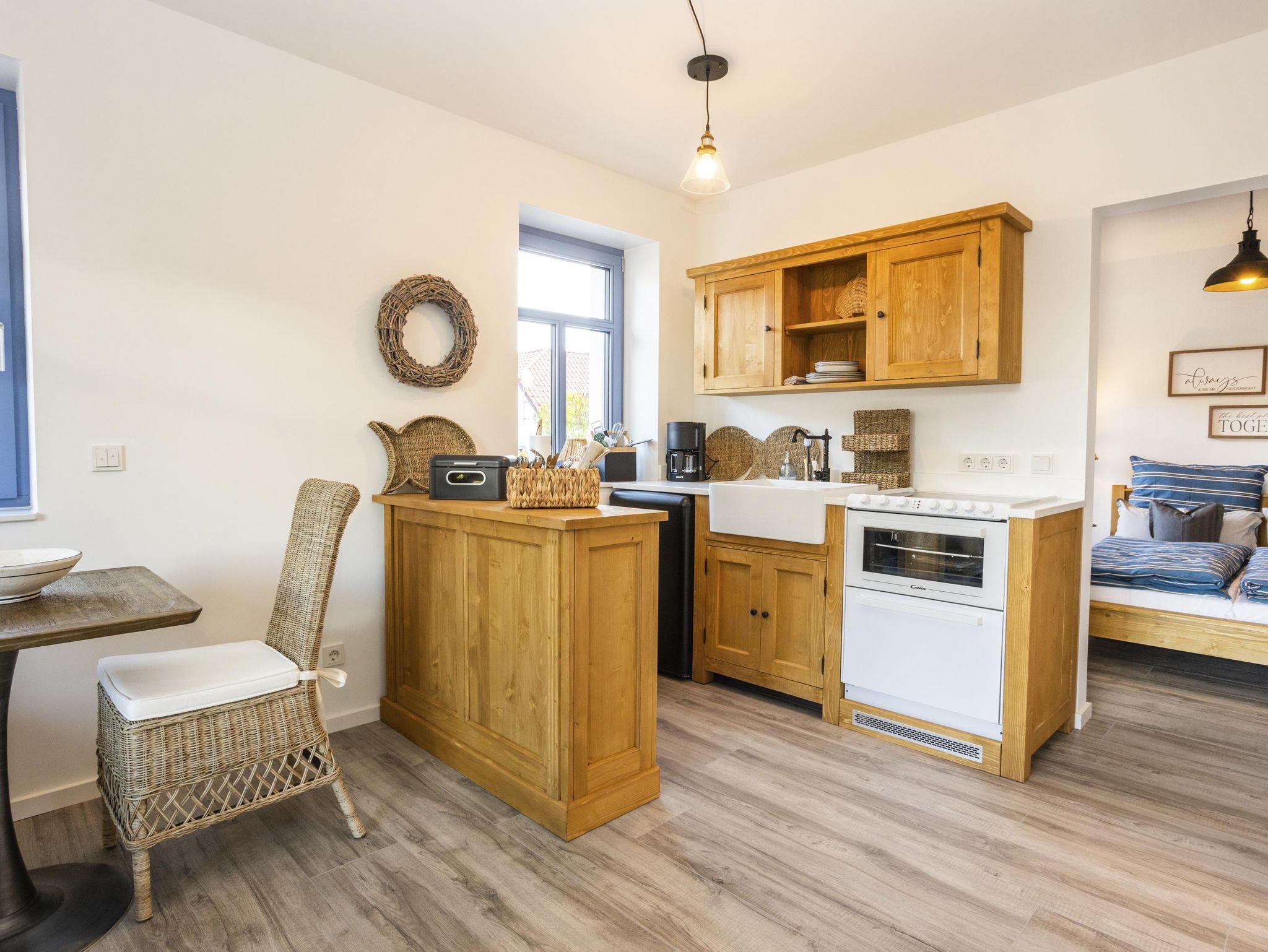 Das Appartement 3 im Erdgeschoss ist ganz besonders ausgestattet. Neben einem gemütlichen Wohnbereich mit modern ausgestatteter Küchenzeile finden Sie ein Schlafzimmer mit Badewanne sowie ein separates Badezimmer mit Dusche/WC. Außerdem steht Ihnen eine eigene Terrasse mit Gartenmöbeln und einer hängender Schaukel mit Blick auf den neu angelegten Bouleplatz sowie Outdoorküche das Teehaus und eine schön gestalteten Außenbereich zur Verfügung. Wlan ist im ganzen Haus vorhanden. Bezogene Betten und Handtücher sind bei der Anreise liebevoll arangiert und lassen den erholsamen Urlaub von Beginn an genießen.