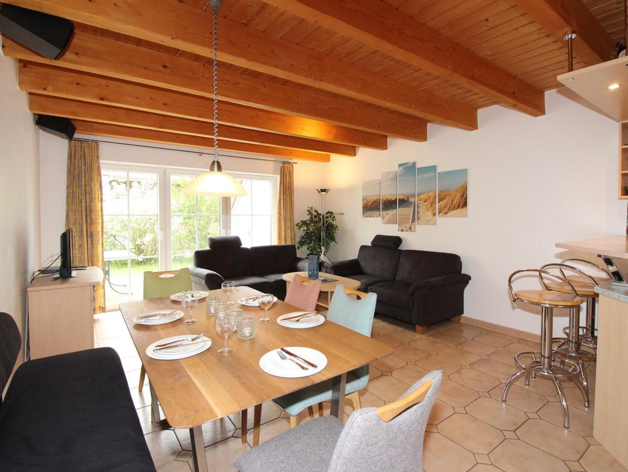 Wohlfühlen wie zuhause. In unserem Ferienreihenhaus (Mitte) ca. 70 m² werden Sie sich rundum wohlfühlen. Die Küche ist vollausgestattet für bis zu 6 Personen. Im EG sind: Küche, Ess- und Wohnbereich, Bad mit Dusche sowie eine kleine Terrasse mit Gartenmöbeln und Abstellraum (Grill ist vorhanden). Im 1. OG sind: Elternschlafzimmer mit einem Doppelbett, Gästezimmer mit zwei Einzelbetten und Bad mit Dusche. Im DG befindet sich ein Chillraum mit zwei Einzelbetten. Zu dem Park gehört auch ein Schwimmbad (freier Eintritt) mit kleiner Sauna (Münzeinwurf).