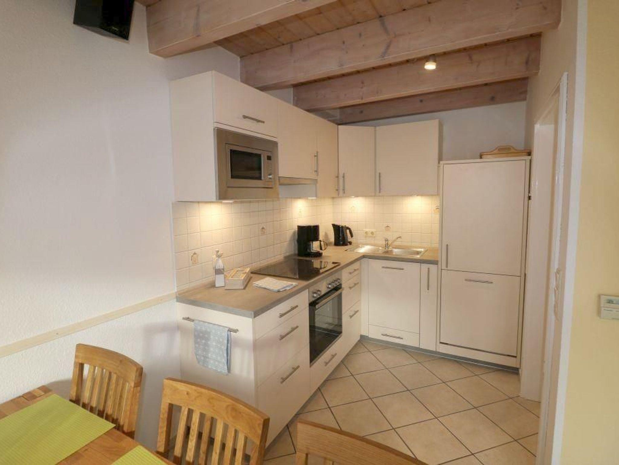 Im Erdgeschoss befindet sich die große Wohnküche mit voll ausgestattetem Küchenbereich mit Geschirrspüler, Backofen mit Ceranfeld, sowie einem großen Kühlschrank mit Gefrierfach. Sie finden hier viele nützliche Dinge wie z.B. Kaffeemaschine und Senseomaschine, Mikrowelle, Mixer, Stabmixer, Eierkocher, Wasserkocher, Toaster und ausreichend Geschirr.