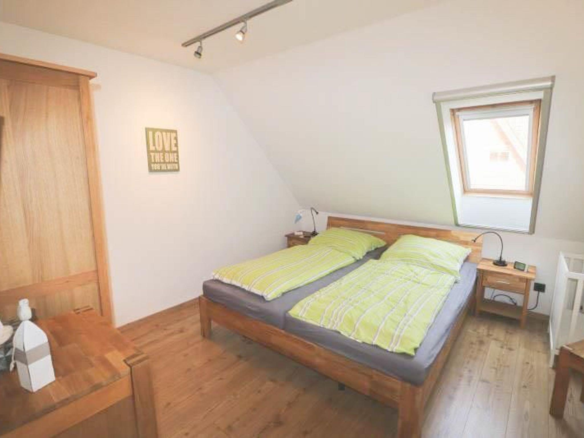 Im Obergeschoss befindet sich ein Schlafzimmer mit Doppelbett und festem Baby-/Kleinkinderbett, Flachbild-TV, sowie ein weiteres Schlafzimmer mit zwei Einzelbetten, Flachbild-TV und eine Playstation 4-Konsole (eigene Spiele können gerne mitgebracht werden). Hier befindet sich ein geräumiges Duschbad.