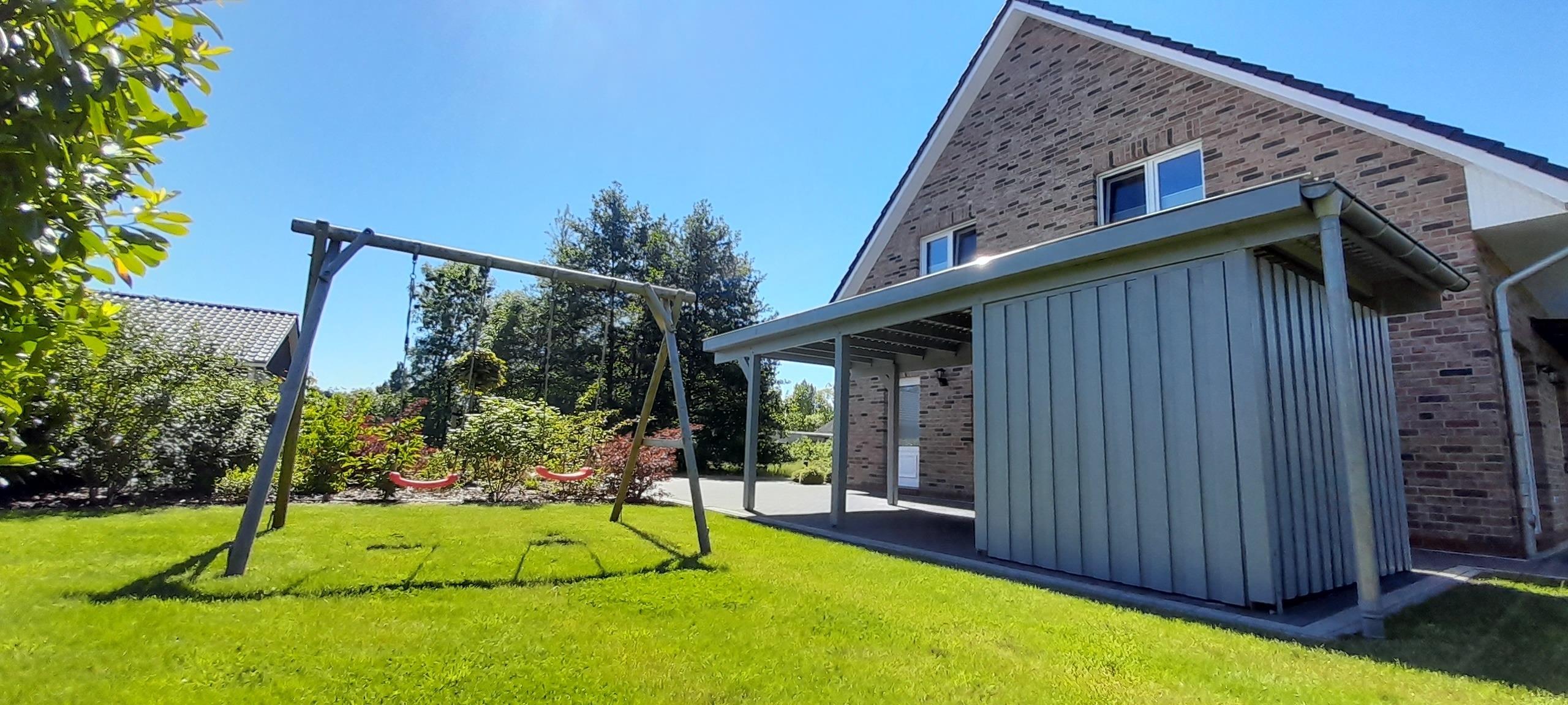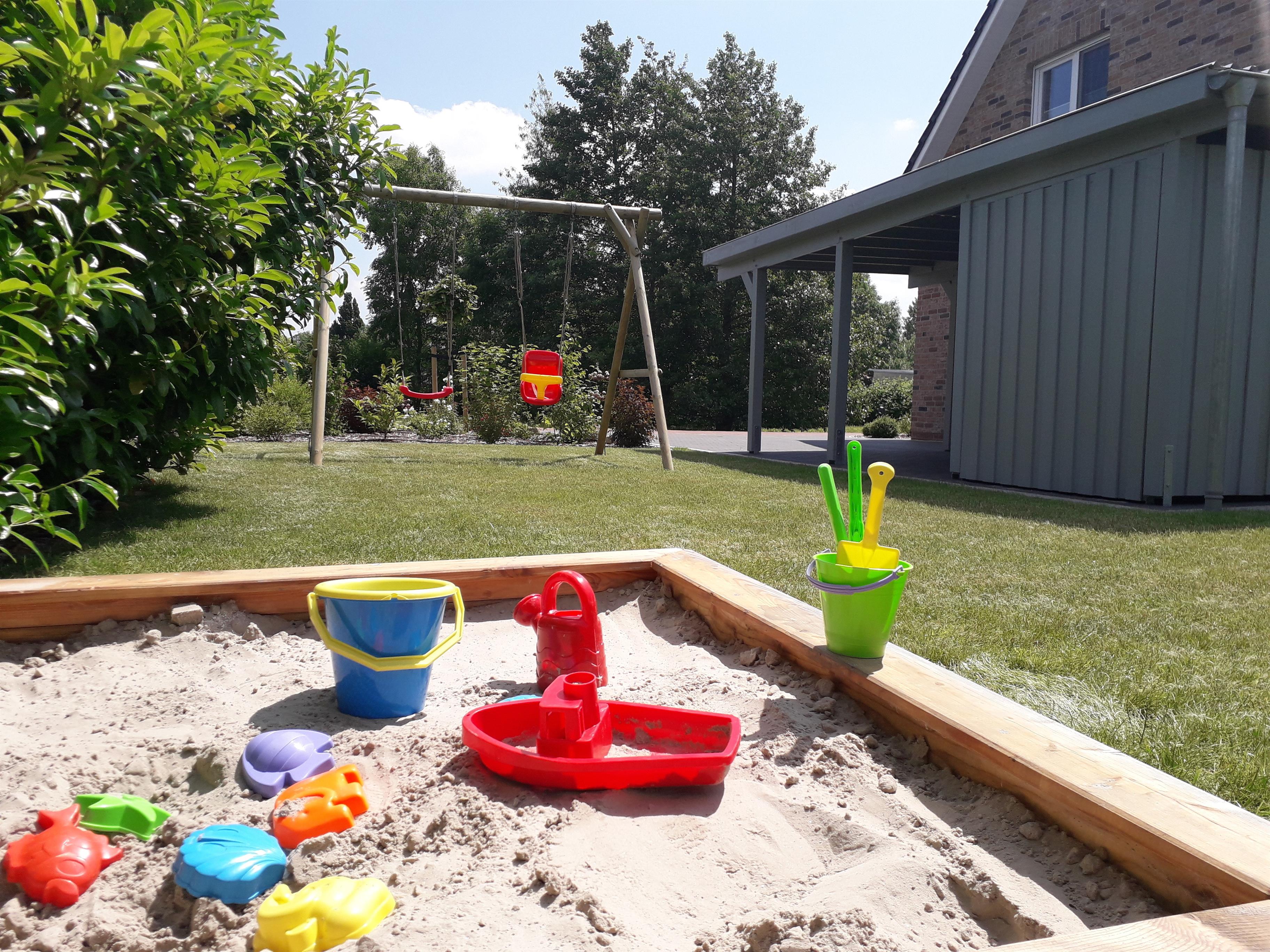 Das Haus verfügt über eine überdachte Terrasse mit Grill und zwei Sonnenliegen. Im schönen angelegten Garten steht eine Doppelschaukel und ein Sandkasten für die Kinder bereit.