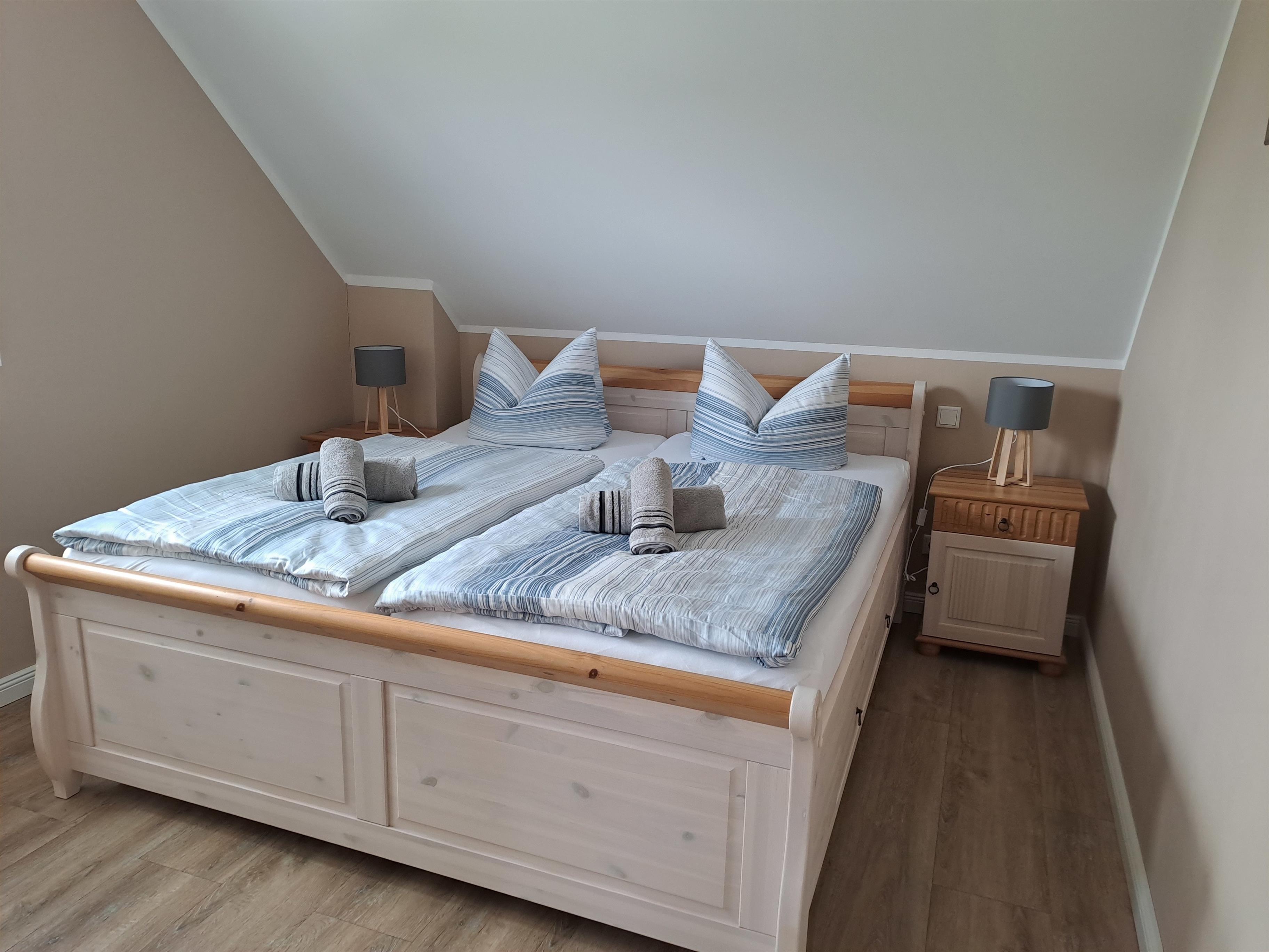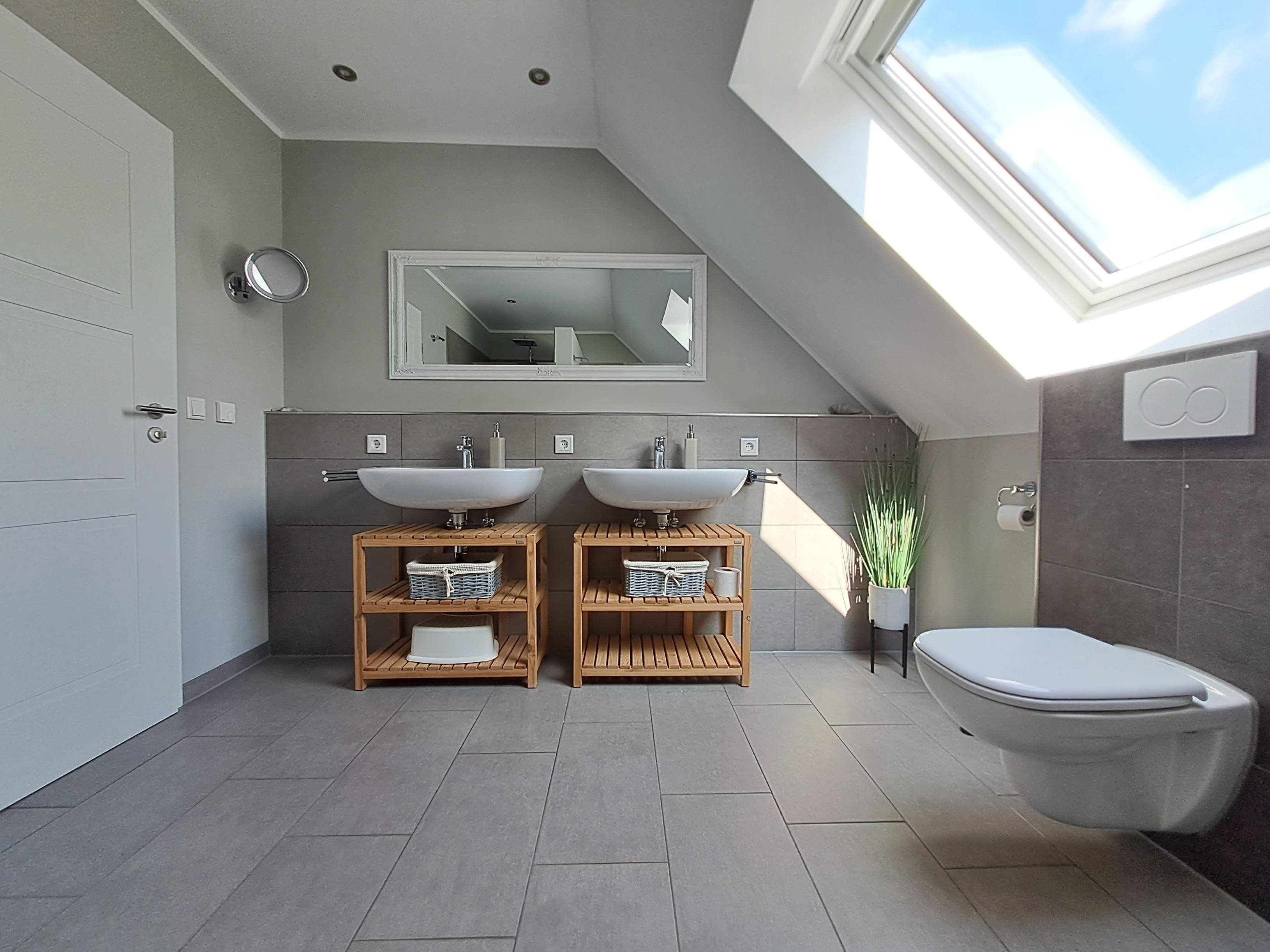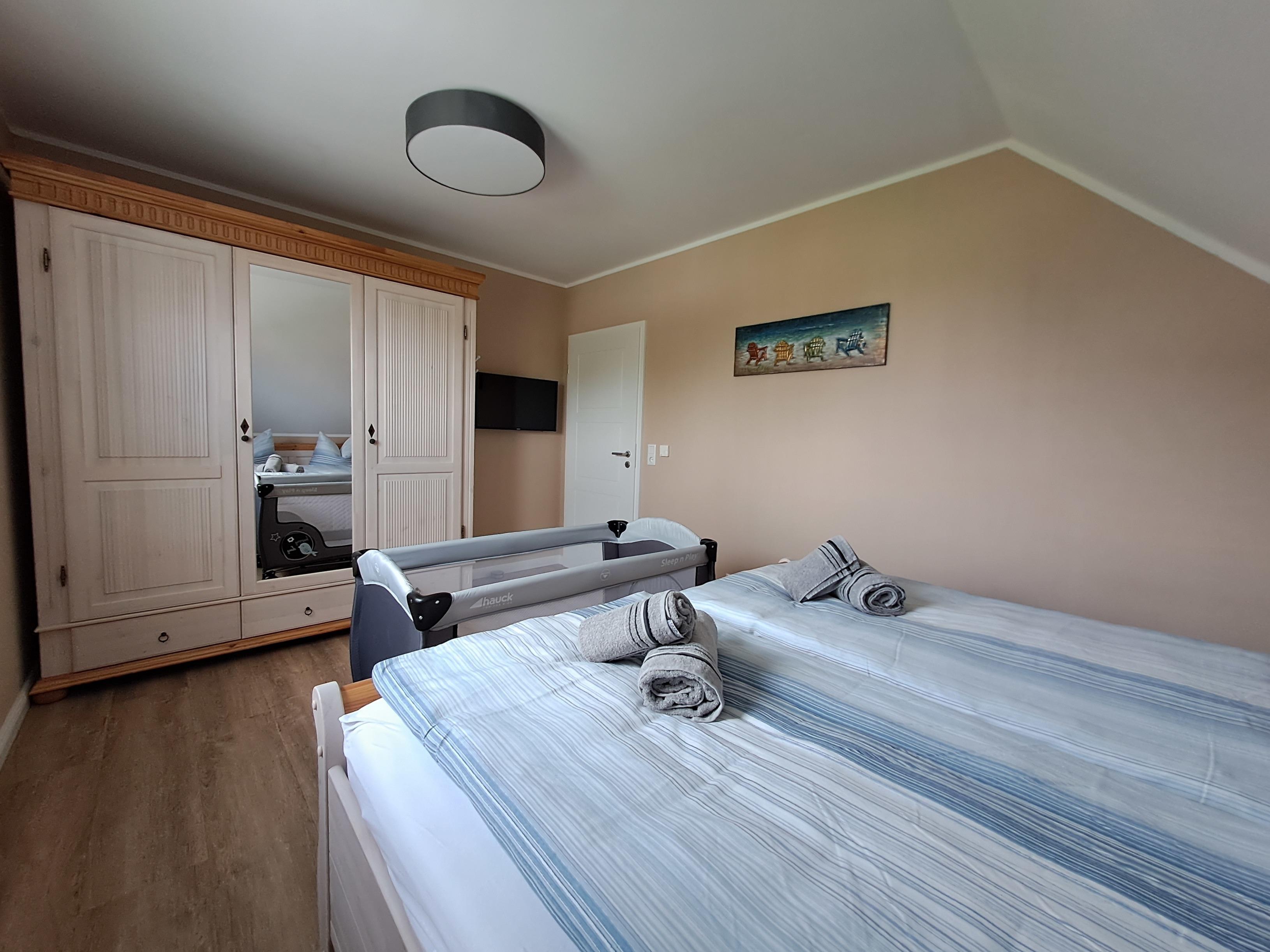 Im OG befinden sich 2 Schlafzimmer mit Doppelbetten(180x200), Smart TV und viel Stauraum. Ein weiteres Schlafzimmer verfügt über zwei Einzelbetten (100x200) .In allen Schlafzimmern befindet sich ein Insektenschutz.Das moderne Tageslichtbad besticht durch eine große begehbare Rainshowerdusche, Badewanne und einen Doppelwaschtisch. Zusätzlich befindet sich im EG ein zweites Bad mit WC und begehbarer Rainshowerdusche.