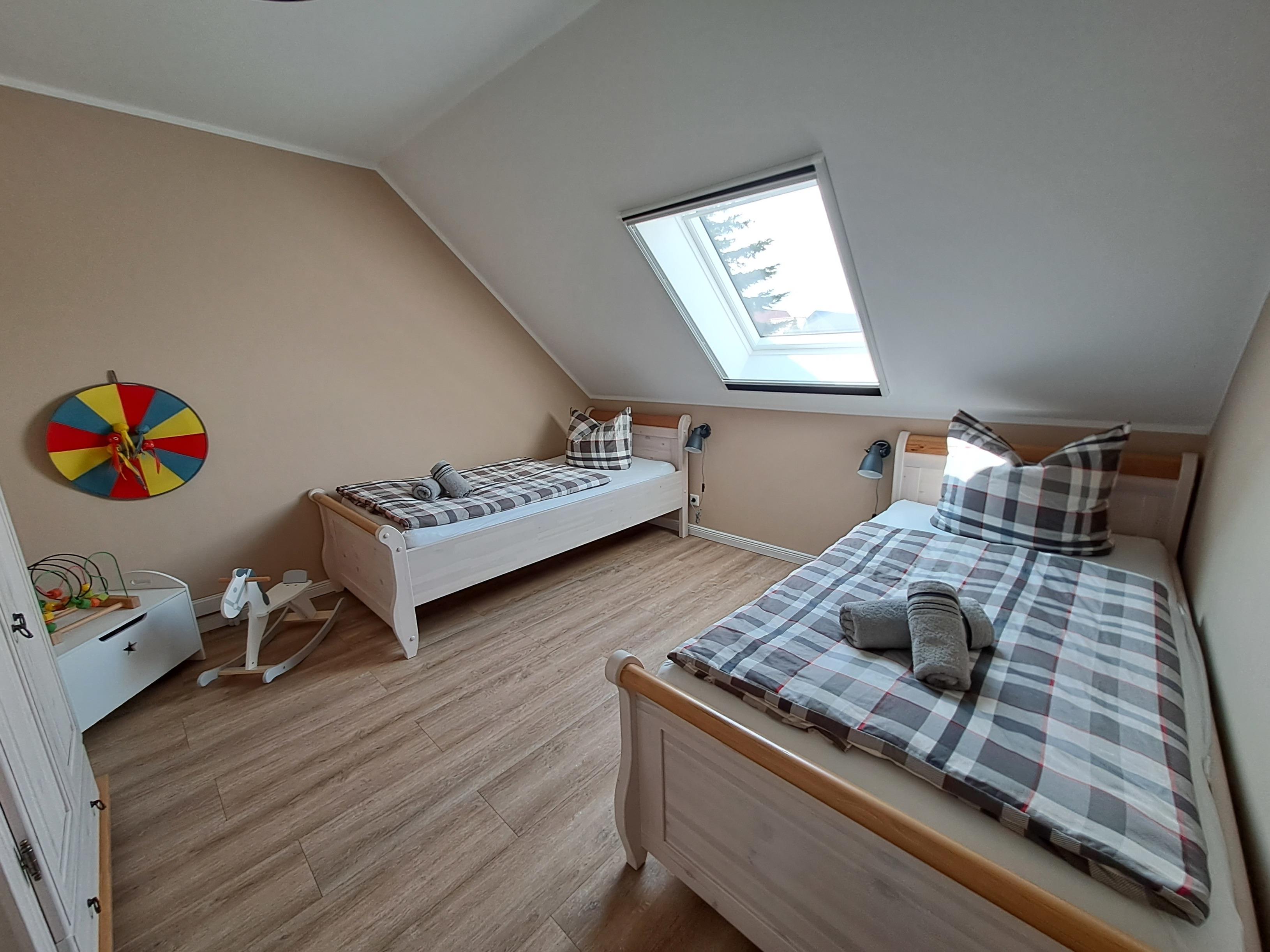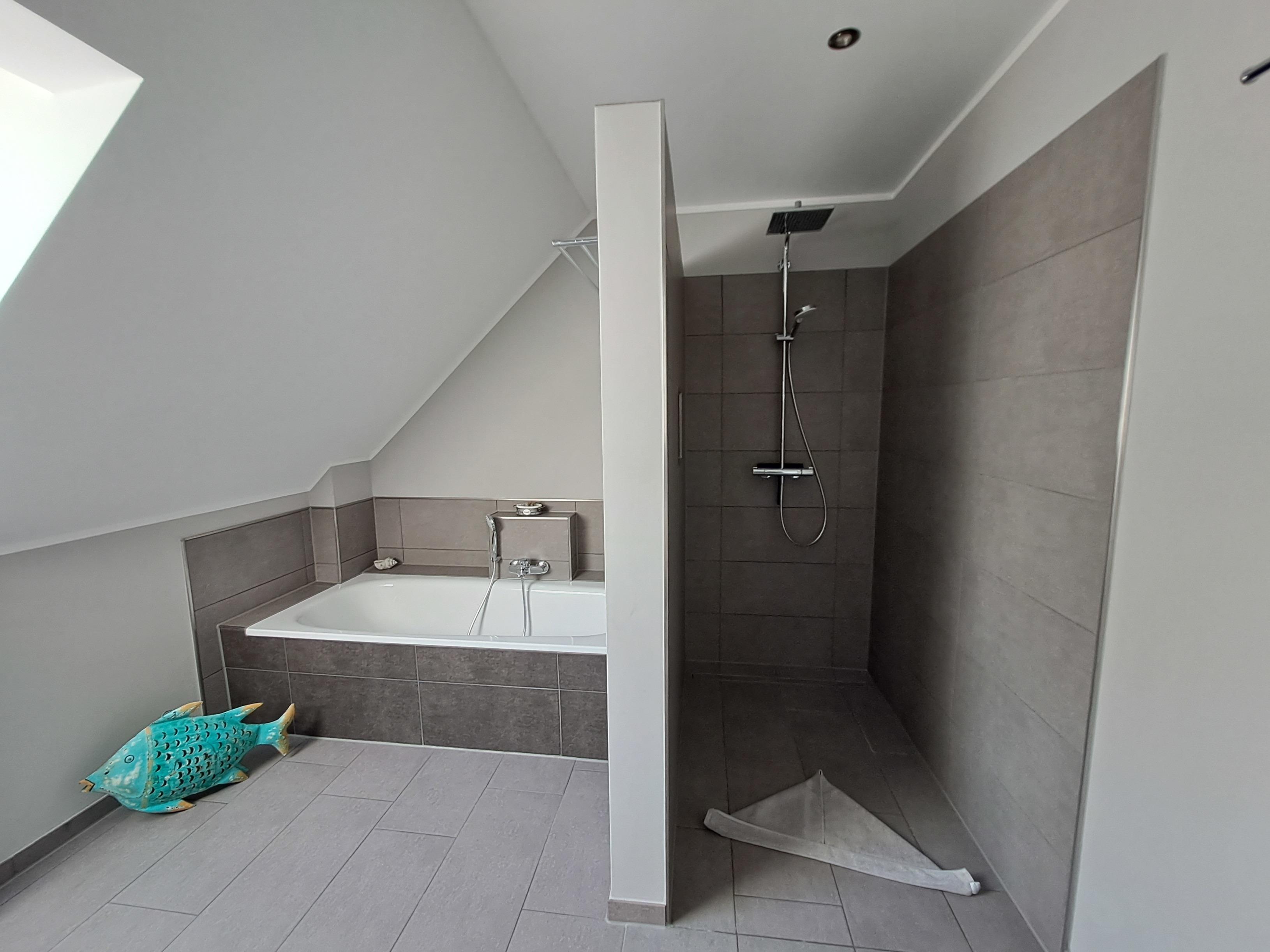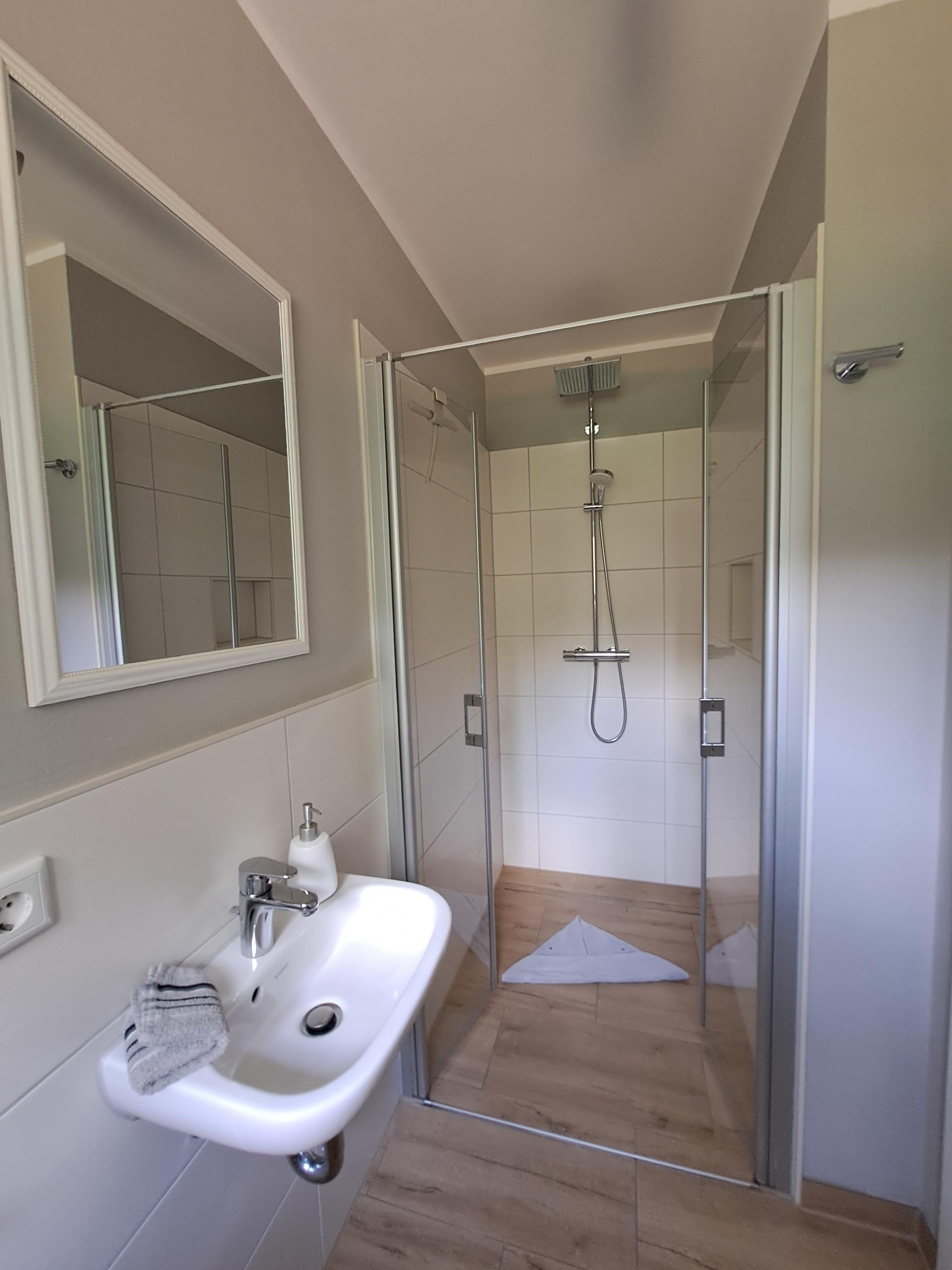 Im OG befinden sich 2 Schlafzimmer mit Doppelbetten(180x200), Smart TV und viel Stauraum. Ein weiteres Schlafzimmer verfügt über zwei Einzelbetten (100x200) .In allen Schlafzimmern befindet sich ein Insektenschutz.Das moderne Tageslichtbad besticht durch eine große begehbare Rainshowerdusche, Badewanne und einen Doppelwaschtisch. Zusätzlich befindet sich im EG ein zweites Bad mit WC und begehbarer Rainshowerdusche.