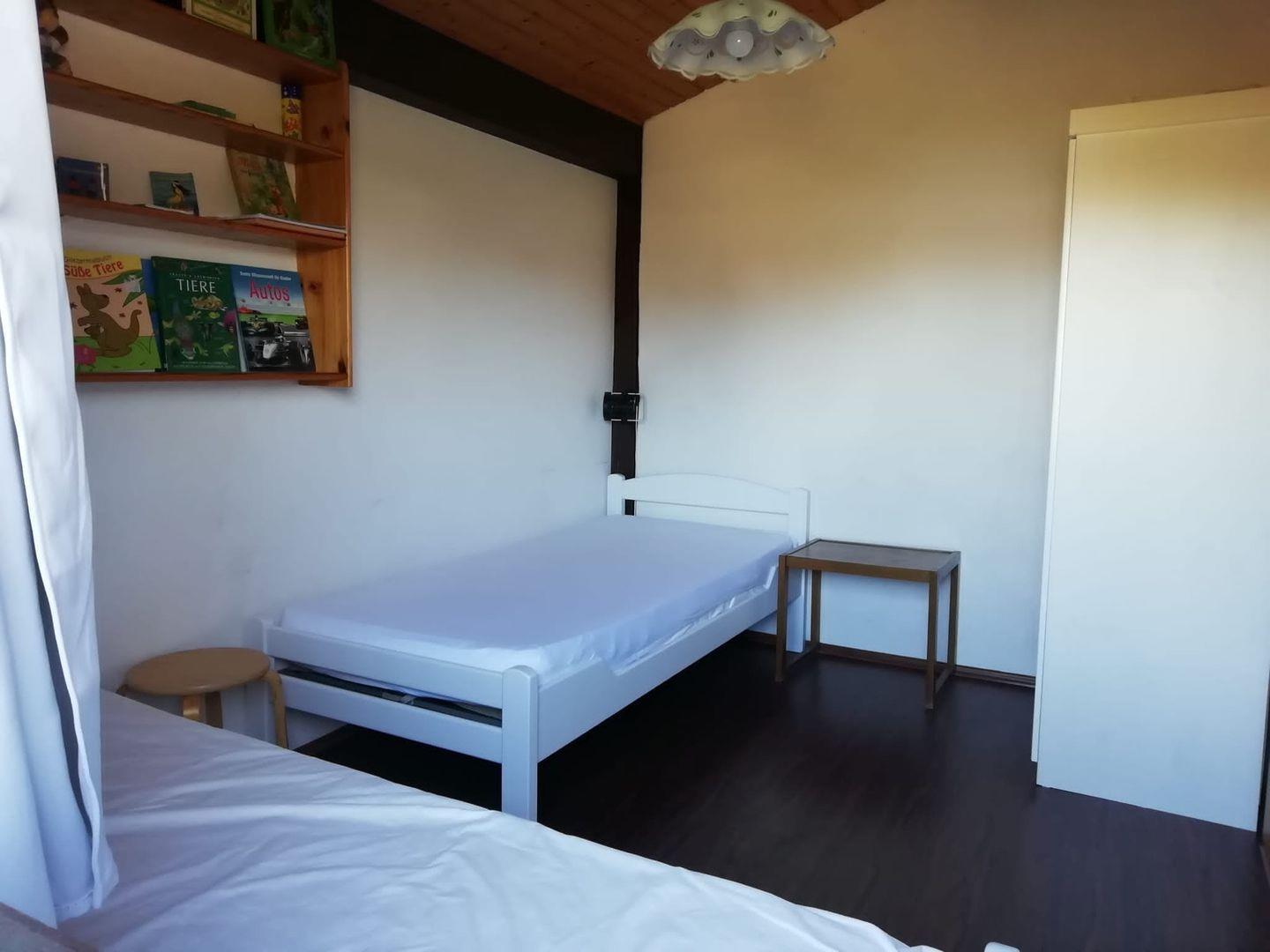 Zudem verfügt es über einen Flur, einen Duschraum mit Toilette und zwei Schlafzimmer; eines davon als Kinderzimmer mit zwei Einzelbetten.