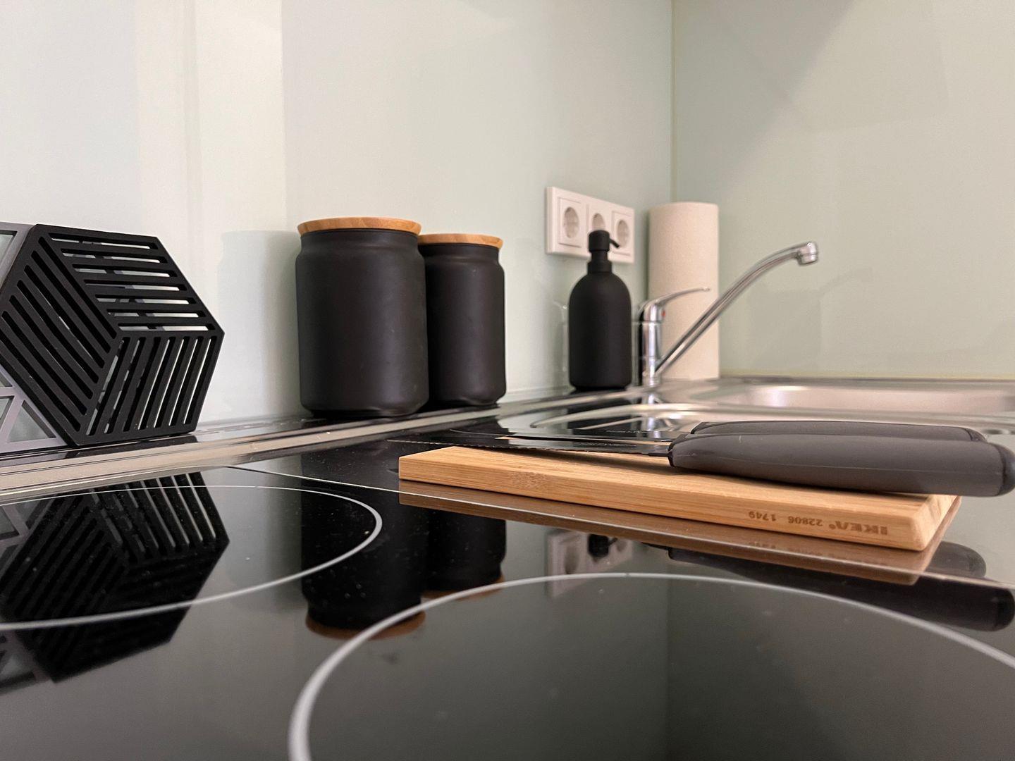 In der Kochnische findest du neben einem Kochfeld mit zwei Kochplatten einen Kühlschrank mit Gefrierfach. Zu unserer Grundausstattung gehören neben den Kochutensilien außerdem Salz, Pfeffer und Zucker. Für die Kaffee- und Teezubereitung stehen dir eine French Press und ein Wasserkocher zur Verfügung.