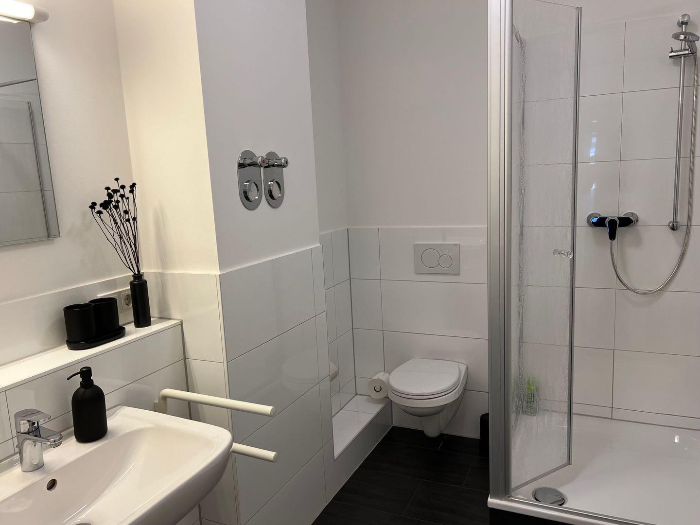 Das moderne Badezimmer mit Dusche hat eine Handtuchheizung und ausreichend Ablagemöglichkeiten für deine persönlichen Kosmetikprodukte. Handtücher, einen Haartrockner und Körperpflegeprodukte bekommst du von uns gestellt.