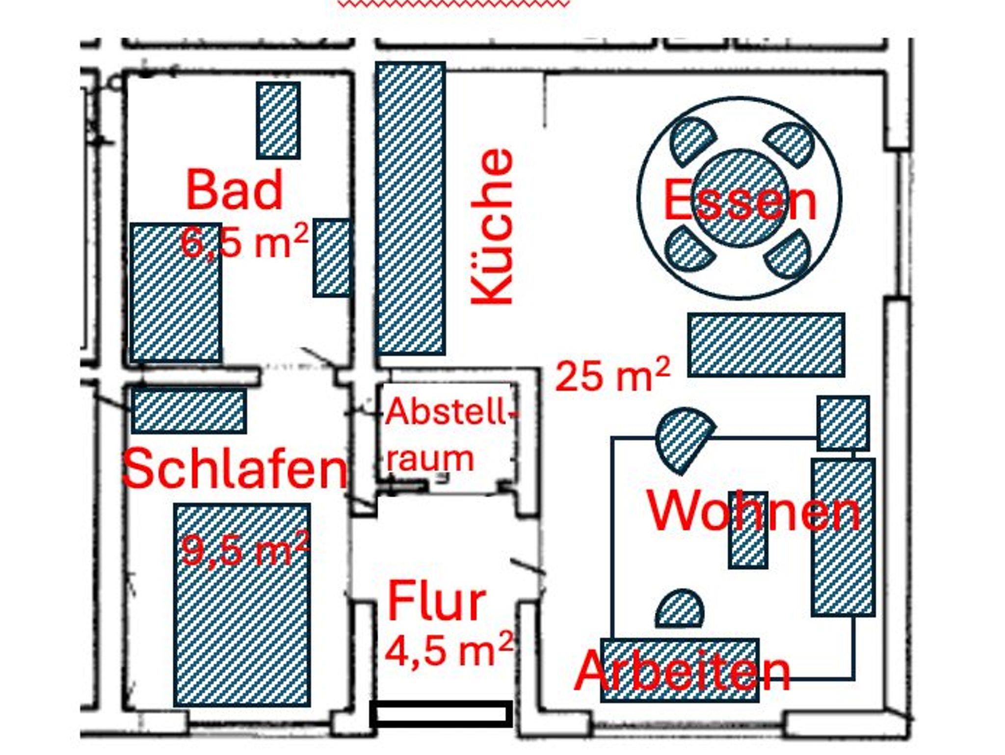 Treten Sie nun durch die Glastür in das das Herzstück der Wohnung ein: Auf 25 m2 erwartet Sie hier ein gemütlicher Wohnbereich mit Sofa, Smart-TV und DAB+-Soundsystem, sowie einem Schreibtisch, falls es doch noch Korrespondenz zu erledigen gibt. Mit unserem kostenlosen, stabilen Gäste-WLAN haben Sie jederzeit Zugriff aufs Internet.