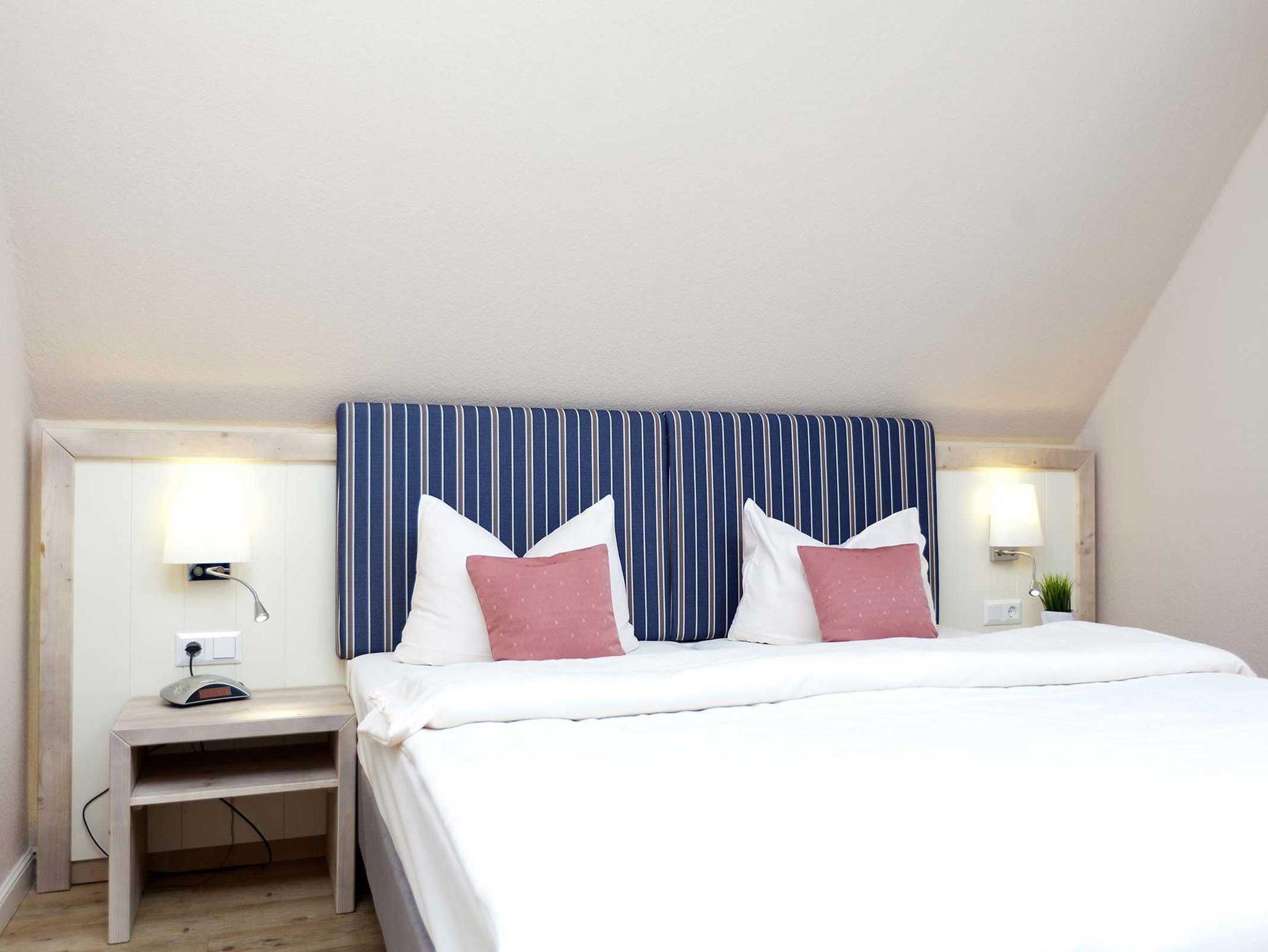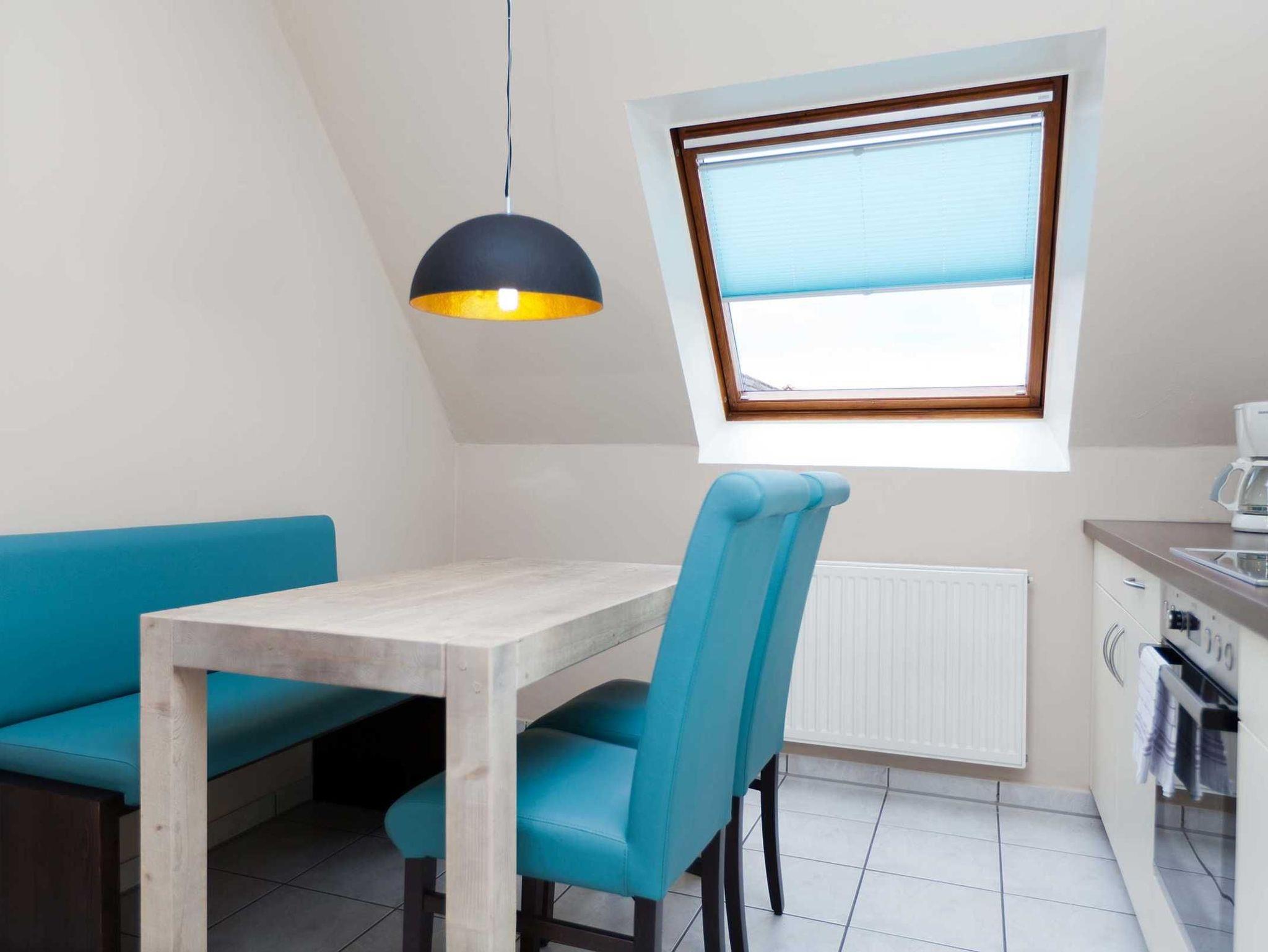 Ferienwohnung Spiekeroog für bis zu 6 Personen im 1. Obergeschoss + ausgebautem Dachgeschoss, Schlafraum mit Doppelbett, ein Bad mit Dusche/WC/Föhn, eine komplett eingerichtete Küche, ein geräumiges Wohnzimmer mit Essecke, HD-TV und angrenzendem Süd-Balkon. Abstellraum, inklusive Endreinigung.