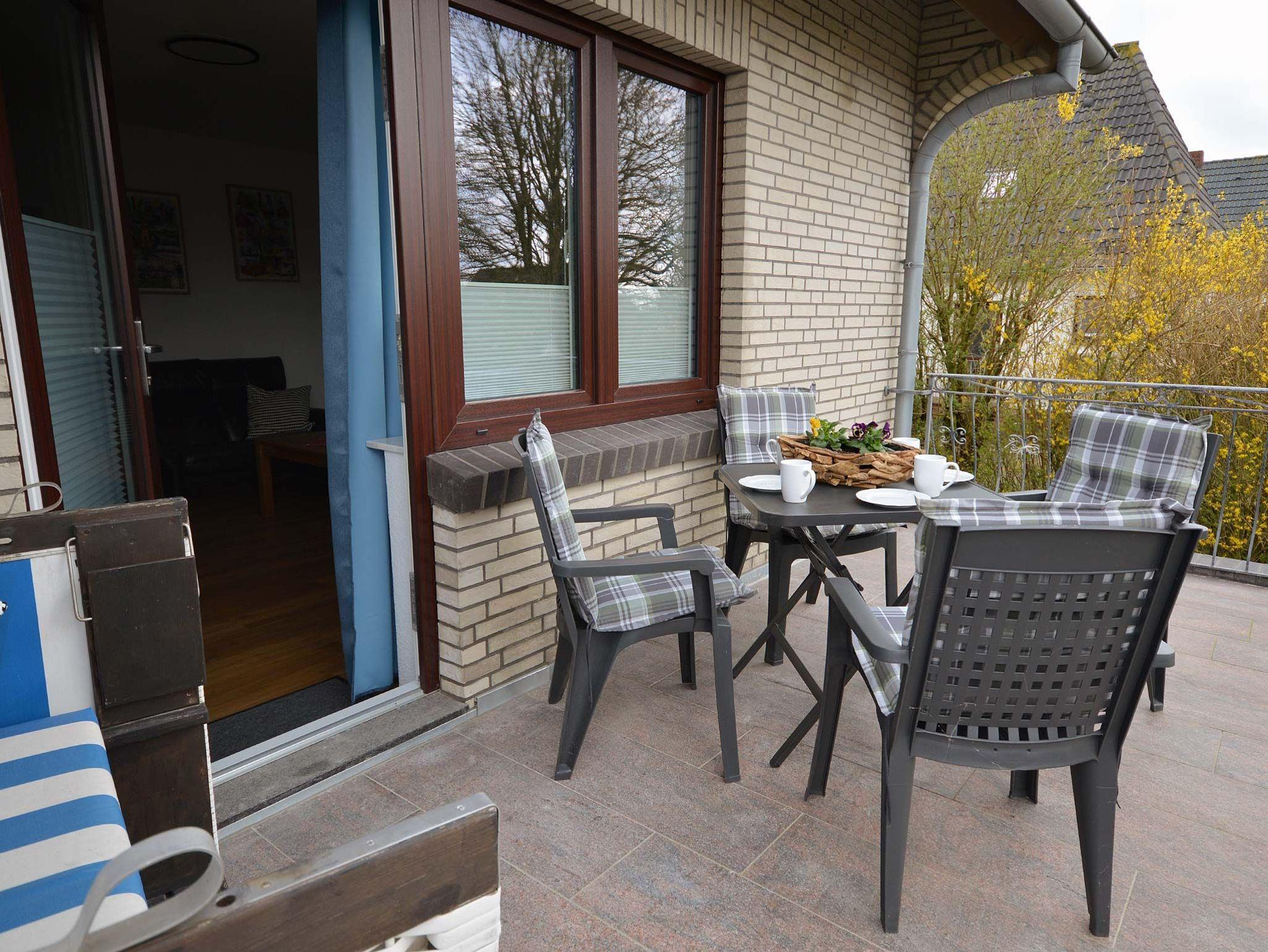 Die komplette Ferienwohnung hat Außenrollos. Große Terrasse mit Gartenmöbeln und Strandkorb.