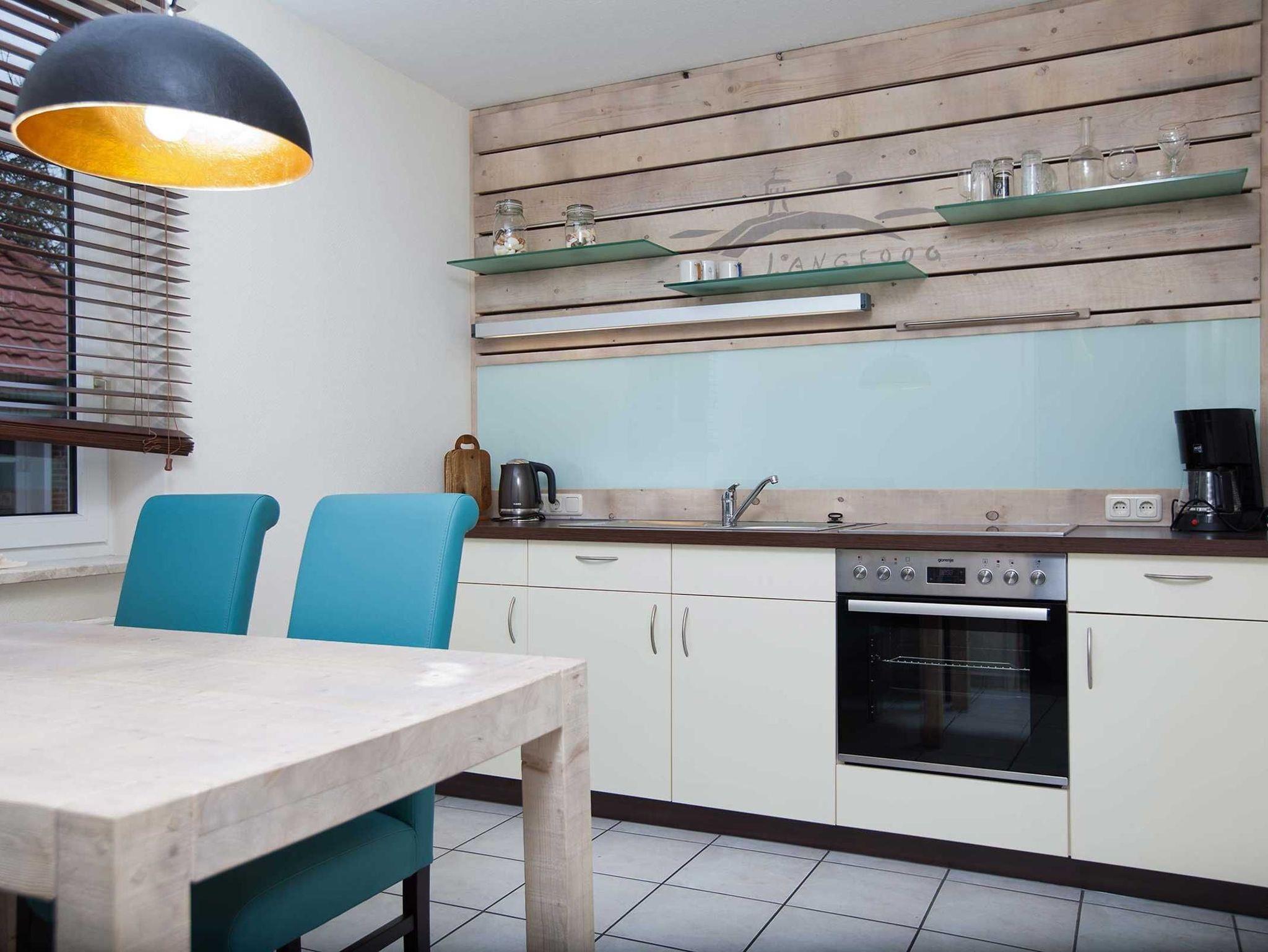 Ferienwohnung Langeoog für 2 Personen im Erdgeschoss, Schlafraum mit Doppelbett, ein Bad mit Dusche/WC/Föhn, eine komplett eingerichtete Küche, ein geräumiges Wohnzimmer mit Essecke, HD-TV und angrenzender Süd-Terrasse, Abstellraum, inklusive Endreinigung.