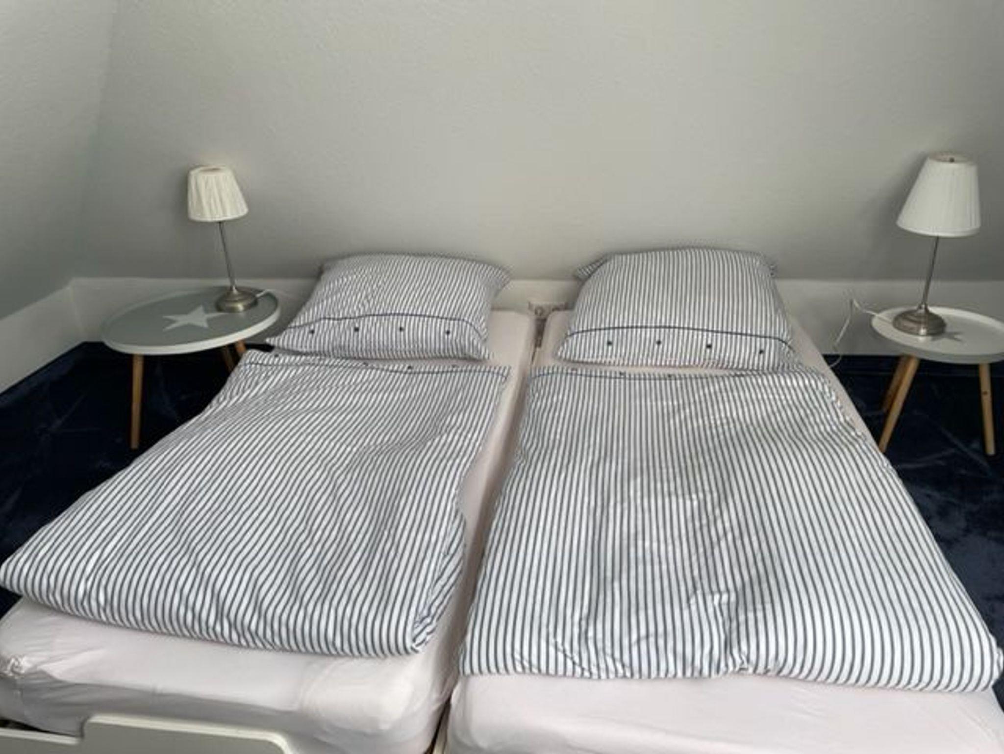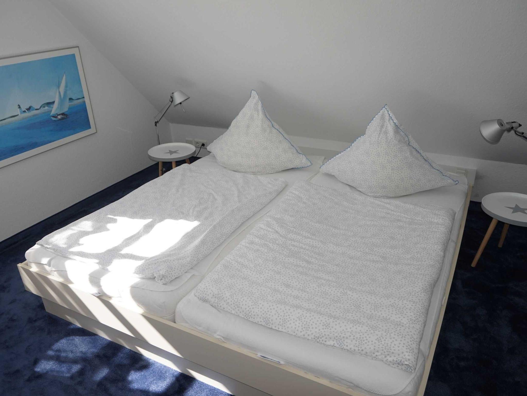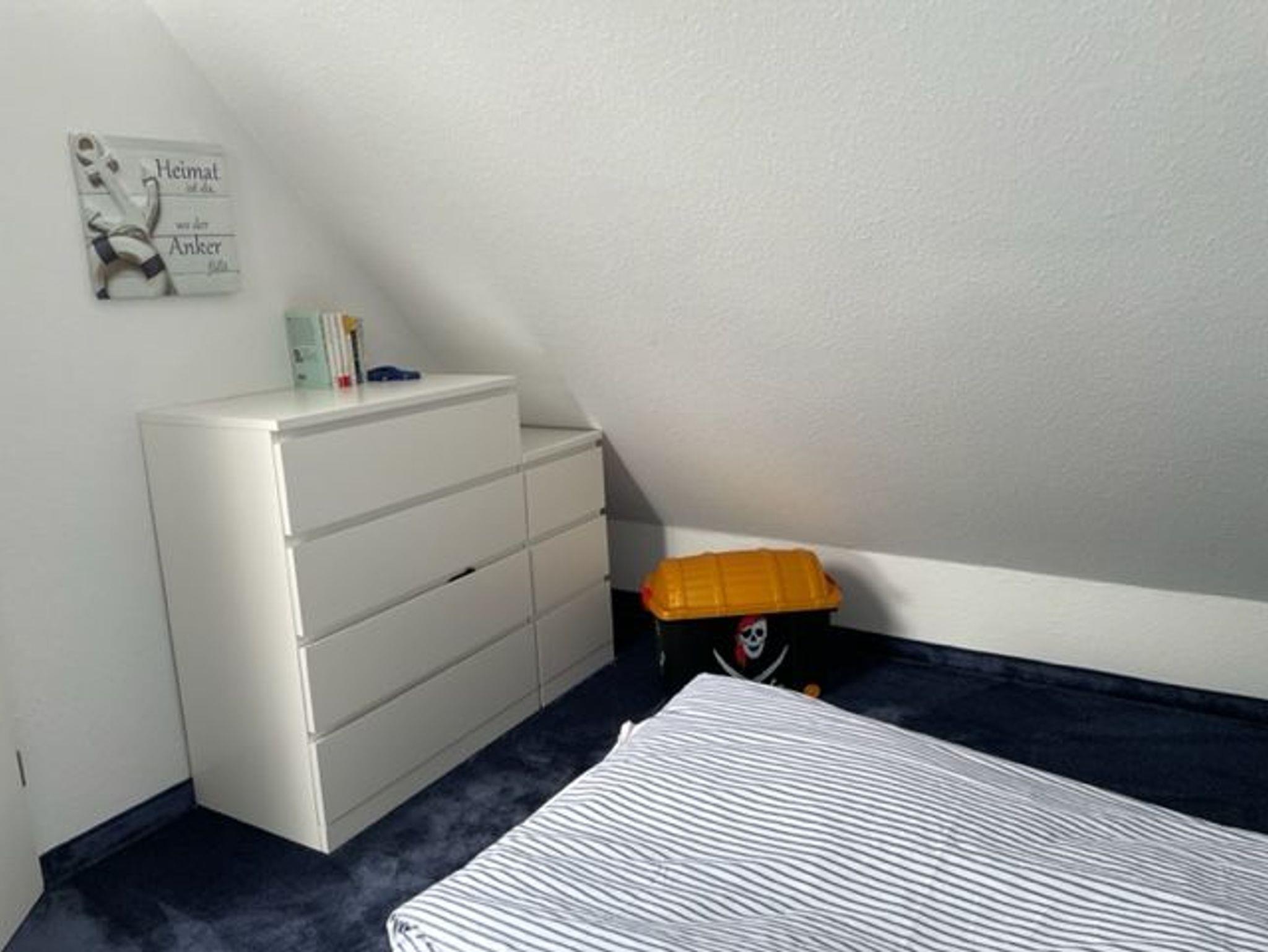 Helles, freundliches Wohnzimmer mit Sat-TV, separate Küche. Gäste-WC, Terrasse in Südlage, Garten, Gartenhaus für Fahrräder, Grillmöglichkeit. Im Obergeschoss 1 Schlafzimmer mit Doppelbett 2x2 m und Kinderbett, 1 Schlafzimmer mit 2 Einzelbetten 0,9 x 1,9 m, Bad mit Dusche/WC und Waschmaschine. Im Dachgeschoss ein Schlafzimmer mit 2 Einzelbetten 0,9 x 2,0 m. Ganzjährige Vermietung.
