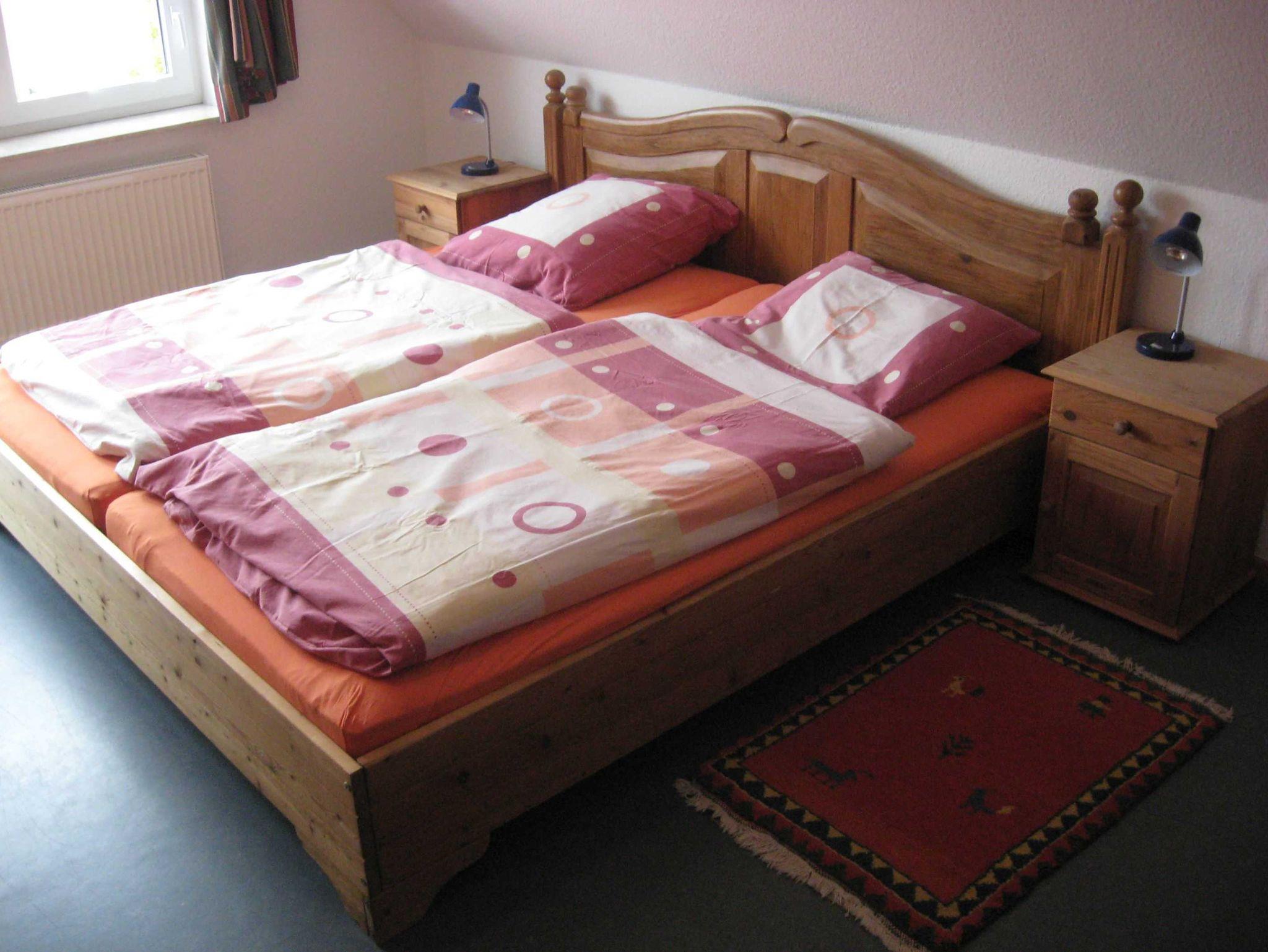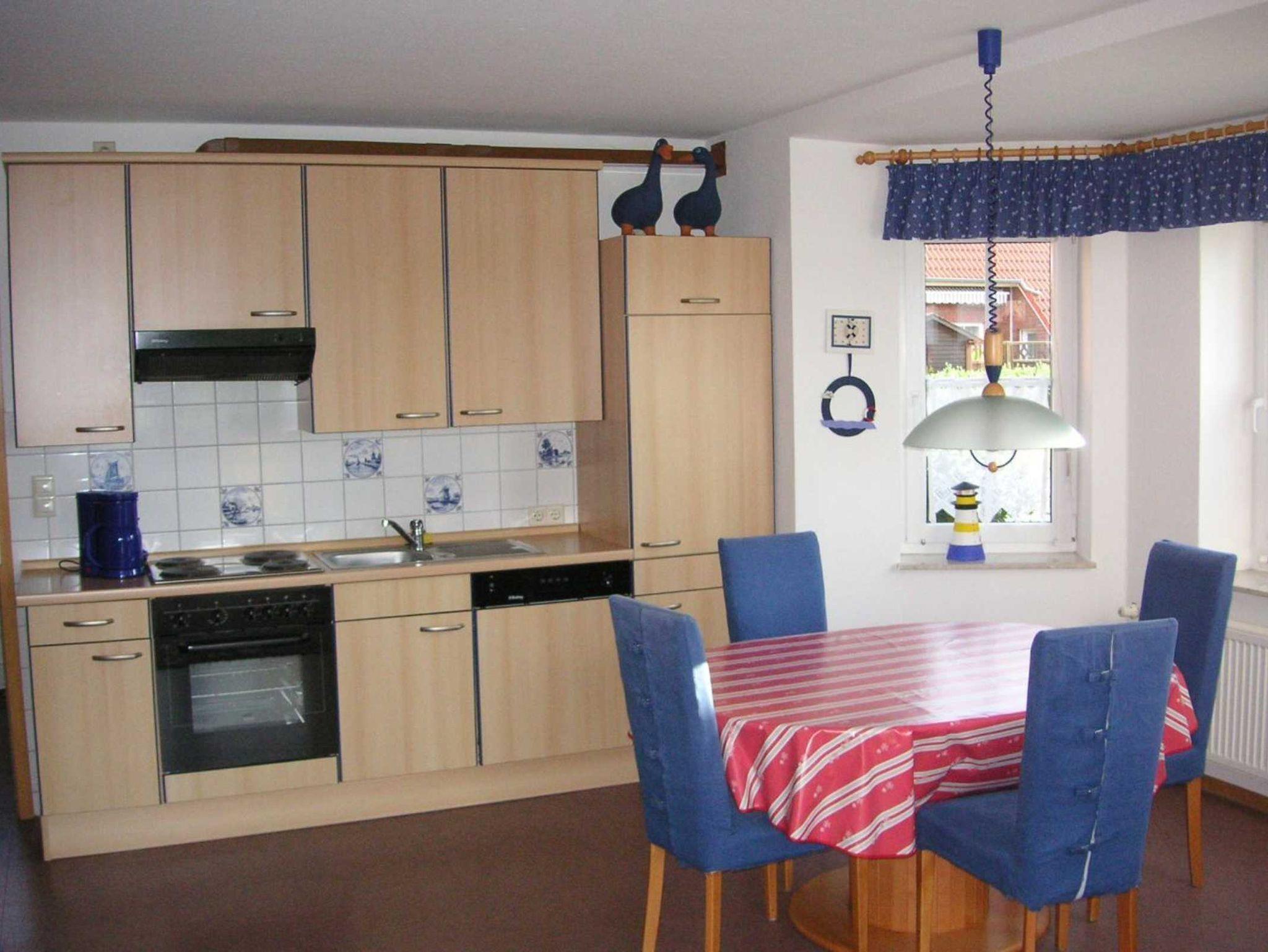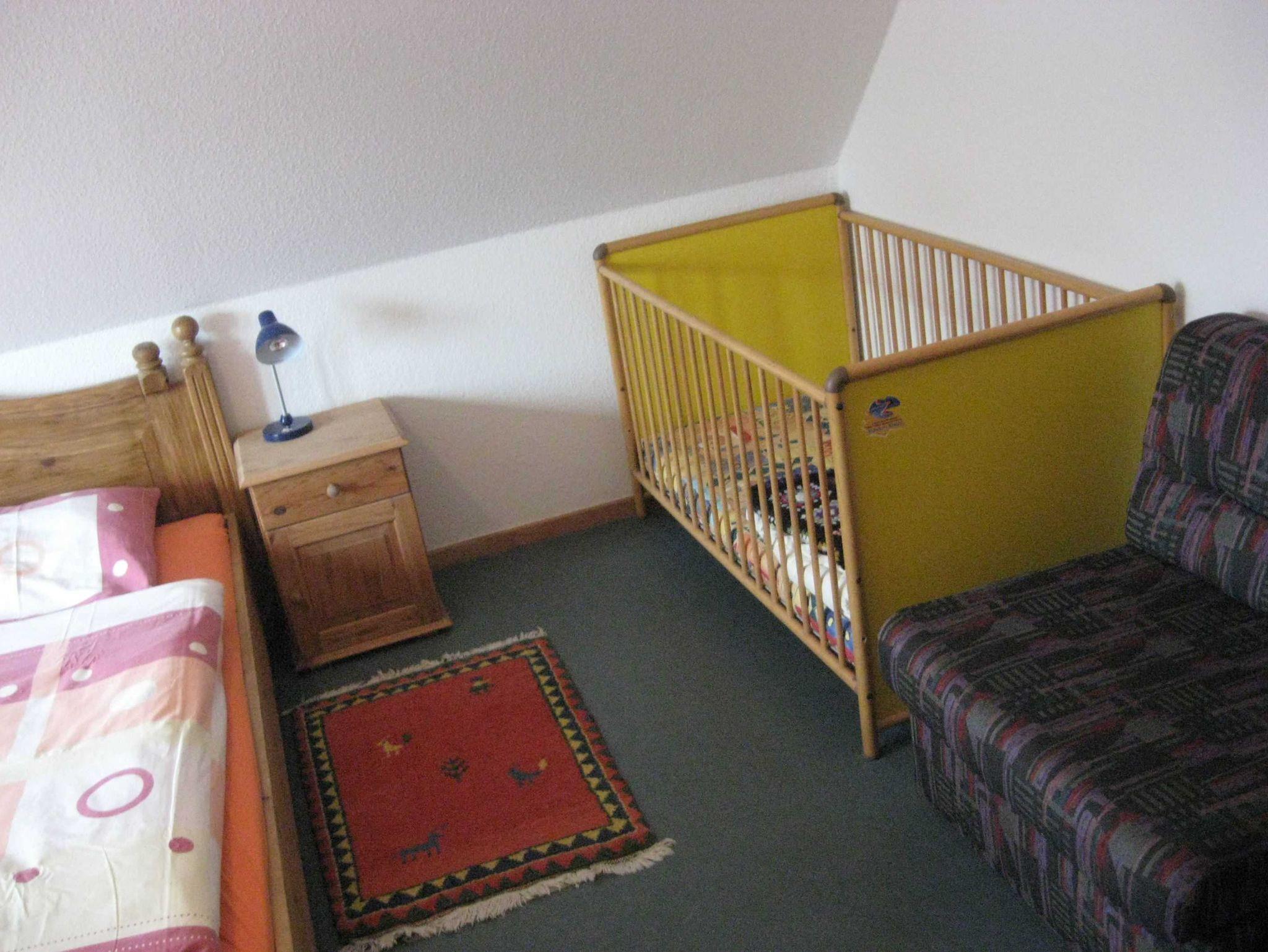 Wohnbereich im Erdgeschoss mit gemütlicher Rundpolstersitzecke, Fernseher mit Sat-Empfang, Radio, CD-Player, Ausgang zur Südterrasse und Garten. Küchen- und Essbereich mit Küchenzeile inkl. Inventar, Herd, Backofen, Geschirrspüler, Kaffeemaschine, Toaster und ausziehbarem Esstisch. Schlafbereich 1: Doppelbett mit großem Schrank, Kinderbett, Wickeltisch; Schlafbereich 2: Doppelbett mit Schrank; Schlafbereich 3 im Dachgeschoss: mit 2 Einzelbetten über eine Raumspartreppe erreichbar. Linolium Fussböden in allen Räumen, außer Bad und WC Bereich und Schlafbereich 3, dort Teppichbelag.