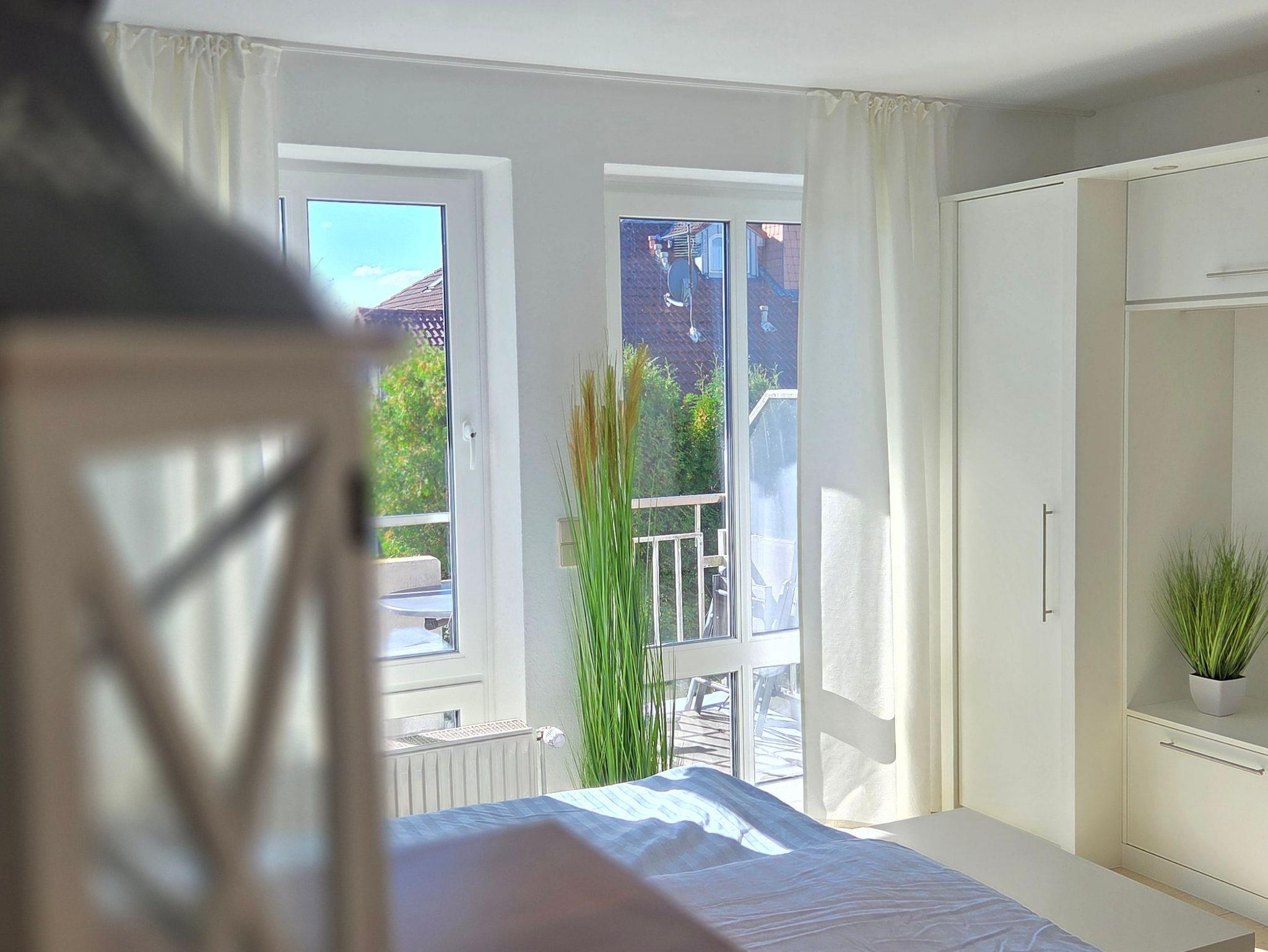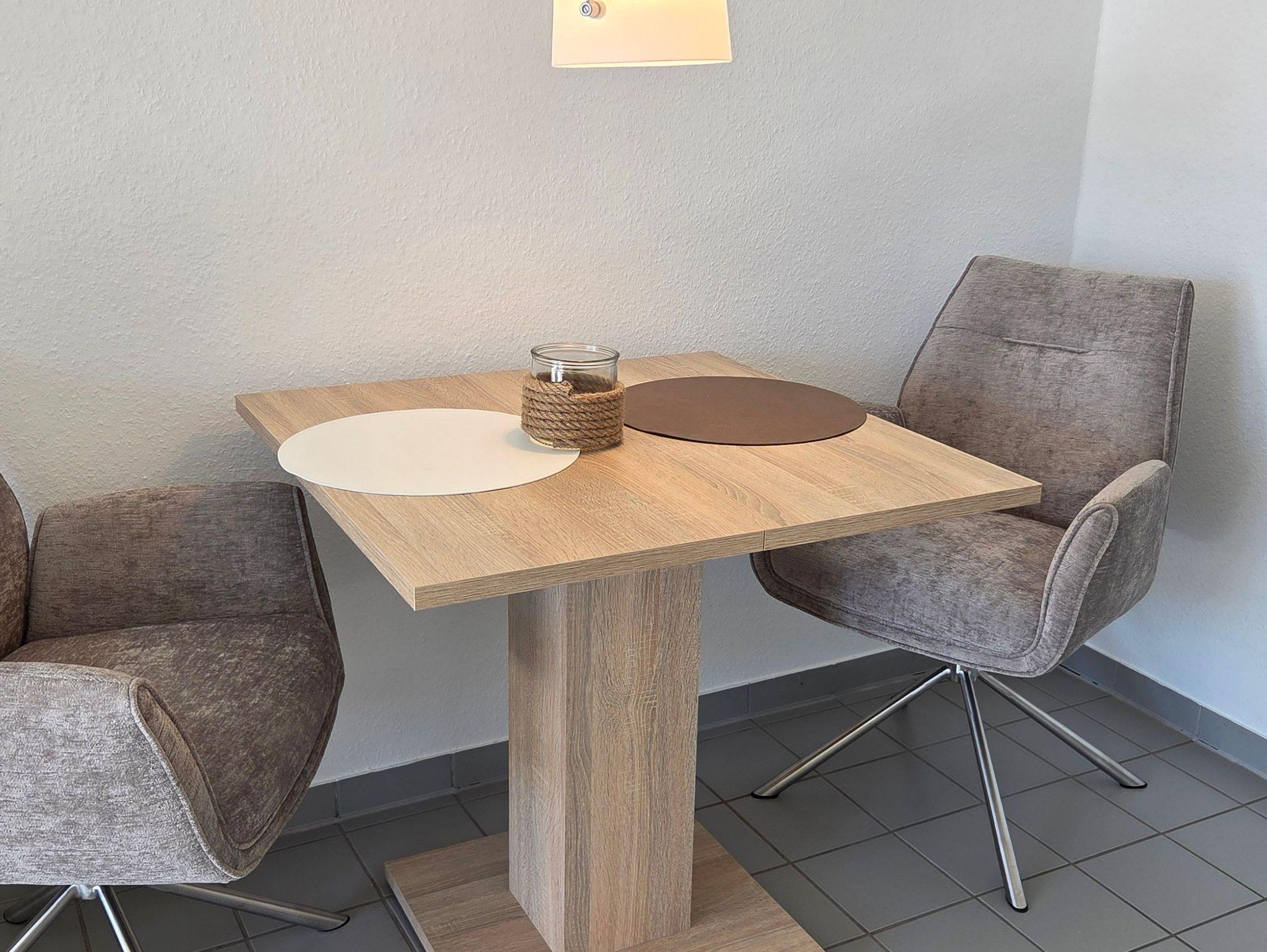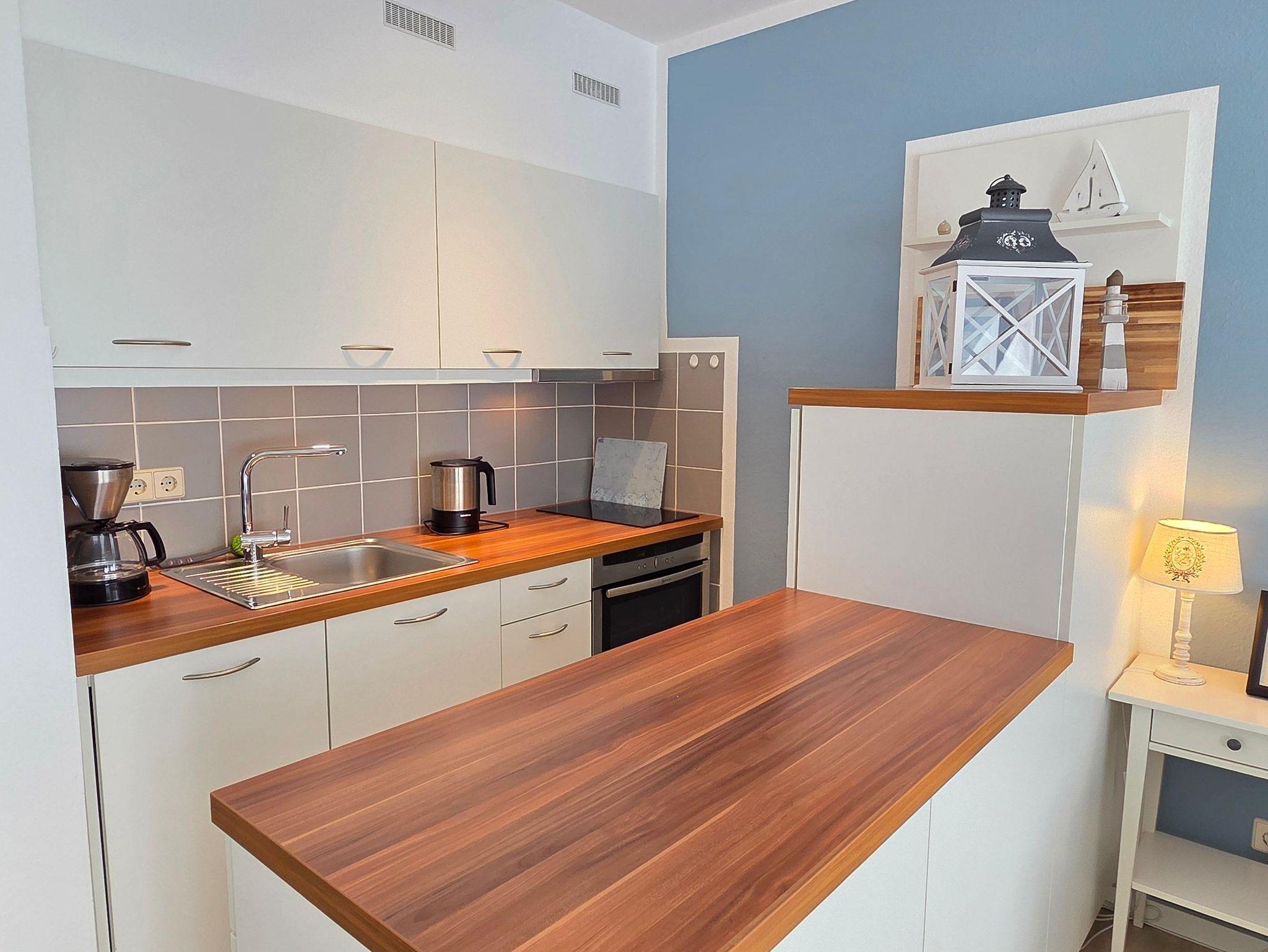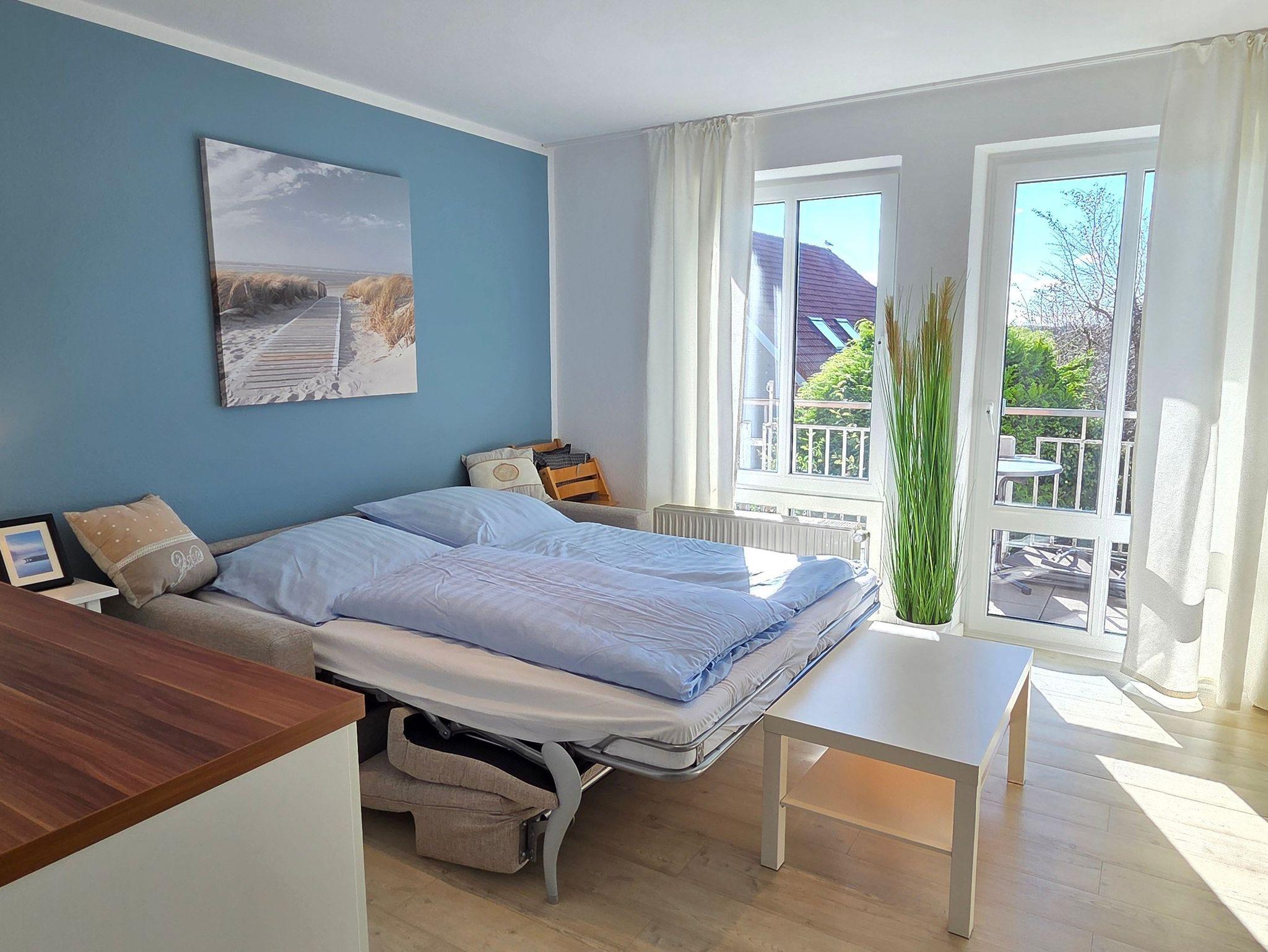 Diese renovierte Obergeschosswohnung mit Balkon befindet sich in der 1. Etage und verfügt über einen lichtdurchfluteten Wohnbereich mit Sofa, einer integrierten Küchenzeile, sowie einem kleinen Esstisch. Außerdem ist die Einzimmerwohnung mit einem komfortablen Schlafsofa (1,60 m x 2,00 m), welches sich nach Bedarf ein- und ausklappen lässt, ausgestattet und bietet Platz für 2 Personen und ein Baby/Kleinkind. Ein separates Badezimmer mit Dusche und WC ist ebenfalls vorhanden. Die Böden sind mit Fliesen bzw. Laminat belegt. WLAN steht Ihnen kostenfrei zur Verfügung. Waschmaschine und Trockner mit Münzeinwurf befinden sich in einem Abstellraum außerhalb der Wohnung.