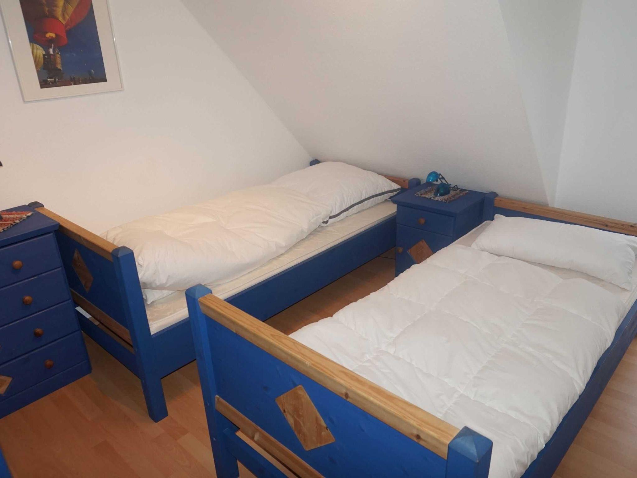 Es gibt ein Schlafzimmer mit einem Ehebett und einem TV Gerät, ein Schlafzimmer mit zwei einzelnen Betten und ein weiteres Schlafzimmer verfügt über ein Einzelbett und ein Kinderbett (Reisekinderbett).